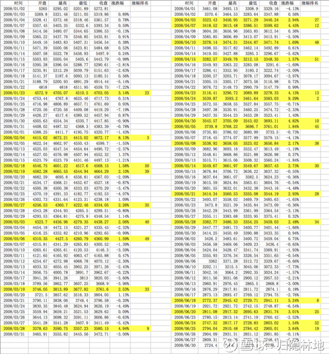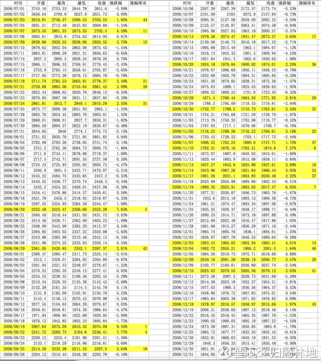 来源链接:https://xueqiu.com/9564664610/115190930 刚才看到大盘突然又抖擞精神,走出了一个V型反转,让我回想起2008年的一个又一个同样走势。 我知道现在是2018年,但可能真的是老了,总是想起2008年。 2008年的下跌,拉长了看,可谓酣畅淋漓,上证指数开盘5265点,收盘1821点,全年跌幅超过65%,即差不多需要涨200%才能回本。但是仔细看,我们可以看到小反弹大阳线其实很多,我刚刚导出数据统计了一下,全年246个交易日中,居然有52个交易日涨幅超过1.5%,其中有20个交易日涨幅超过3.5%,甚至有几个日子差不多全市场涨停(指数涨8%以上)! 图中所有用黄颜色高亮度显示的,都是涨幅超过1.5%的日子,旁边的序号是这一天涨幅在全年大涨日子里的排名。大家不妨自行解读。 转载请注明:www.51xianjinliu.com » 归隐林地:2008年,我曾经历的那些V型反转 喜欢 (0)or分享 (0)