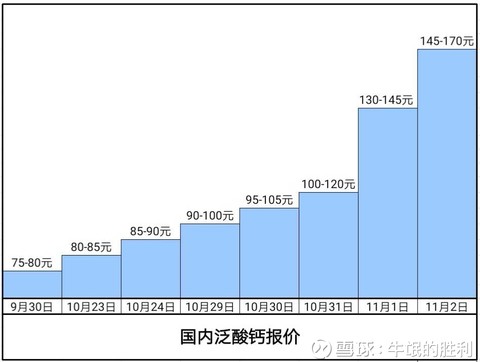 来源链接:https://xueqiu.com/8801386347/116229504 2018年11月2日,国内泛酸钙报价继续大幅跳涨,报价:145元-170元/kg。 利好$亿帆医药(SZ002019)$,$兄弟科技(SZ002562)$。 @今日话题 转载请注明:www.51xianjinliu.com » 牛氓的胜利:国内泛酸钙价格继续跳涨 喜欢 (0)or分享 (0)