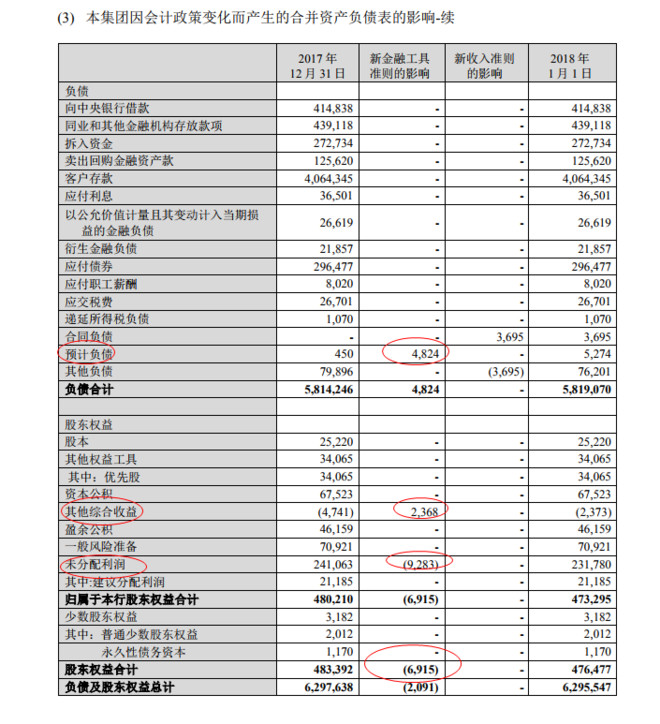 来源链接:https://xueqiu.com/5829606296/116391014 一、投资收益高增长引发关注 招行前三季的营业收入增长了13.2%,其中净利息收入增长9.8%,手续费佣金增长7.4%,投资收益增长了101%。 图1 如图,大家都知道了,招行投资收益的超高速增长是因为今年1月1日起实施了新会计准则:【以公允价值计量且其变动计入当期损益】的金融资产范围扩大,收益列报项目由“利息净收入”改为“投资收益”。财报显示:以公允价值计量且其变动计入当期损益的投资12月31日648亿,1月1日上升到3186亿元,其中,2056亿的来自应收款项类投资科目,490亿来自可供出售金融资产科目。 18年以来招行进行了投资结构调整,连续减持了此类资产。年初3186亿,3月2550亿,6月1908.5亿,9月1741.6亿,简单加权平均计算,投资收益率年化101.62/2307.77*4/3=5.87%,显著高于总投资资产收益率3.8%,也高于生息资产收益率4.32%。 图2 投资者心存疑问了:实施新准则,会不会带来一次性的利润错期分布呢? 二、从新旧准则切换账务中推导市值重估的数值 招行新旧准则切换时的资产负债权益变化情况如下: 图3 1)减少净资产69.15亿。其中未分配利润减少92.83亿,其他综合收益增加(市值浮盈)23.68亿。2)对表外资产补提拨备48.24亿,列为预计负债,冲减留存收益(未分配利润)。 图4 3)补提拨备合计107.95亿,其中图4椭圆计11.68亿冲减其他综合收益,图4红框96.27亿冲减留存收益(未分配利润)。 图5 4)补提拨备增加递延所得税资产22.16亿,同时增加留存收益(未分配利润)22.16亿。 5)补提拨备107.95亿,扣除对表外资产补提48.24亿,表内资产补提拨备59.71亿,列为资产备抵项目。 6)倒推,表内资产市值重估增值总额:x=-20.91(总资产变化)-22.16(抵税)+59.71(补提表内资产拨备)=16.64亿。(求x的公式:x+抵税-补提表内资产拨备=总资产变化) 7)推算公允价值计量市值波动计入其他综合收益的资产重估升值:市值浮盈累计23.68+11.68(图4椭圆补提拨备)=35.36亿,市值重估升值增加其他综合收益。 8)推算公允价值计价市值变动计入当期损益的资产重估减值:16.64-35.36=-18.72亿,冲减未分配利润。 综上,也就是除了补提107.95亿拨备外,以公允价值计价的两块资产合计重估升值16.64亿,其中,计入其他综合收益的资产升值35.36亿,计入当期损益的资产减值18.72亿。因为以公允价值计量且其变动计入当期损益的资产并不计提拨备,这18.72亿相当于提足了拨备。 三、有关基本原理(整理自招行半年报) 所有根据新金融工具准则确认的金融资产均以摊余成本或者公允价值进行后续计量。1)摊余成本计量条件:金融资产在以收【取合同现金流量】为目标的业务模式中【持有】;金融资产的合同条款规定在特定日期产生的现金流量,仅为对本金和以未偿付本金金 额为基础的利息的支付。 2)以公允价值计量且其变动计入其他综合收益计量条件:加一条:【出售金融资产为目标】。3)以公允价值计量且其变动 计入当期损益计量条件:其他所有金融资产。 4)特例:在首次执行日或者初始确认时将非交易性的权益工具不可撤销地指定为以公允 价值计量且其变动计入其他综合收益计量。对于以摊余成本或者以公允价值计量且其变动计入其他综合收益进行后续计量的金 融资产,如果将其指定为以公允价值计量且其变动计入当期损益进行后续计量可以消除或 显著减少计量或确认的不一致(或称作“会计错配”),可以将该类金融资产指定 为以公允价值计量且其变动计入当期损益的金融资产。 5)会计核算依据 a、以公允价值计量且其变动计入其他综合收益的债务工具投资、贷款和垫款 采用实际利 率法计算的利息收入或损失及汇兑损益计入当期损益,其他所产生的任何利得或损失均应 在其他综合收益中确认并累计确认在投资重估储备中。信用减值损失在损益中确认并相应 调整其他综合收益的金额,但并不减少资产的账面价值。其计入损益的金额将与若该金融 资产一直按摊余成本计量而在损益中确认的金额相同。当终止确认时,之前计入其他综合 收益的累计利得或损失应作为一项重分类调整从权益重分类至损益。 b、指定为以公允价值计量且其变动计入其他综合收益的权益工具投资 本集团在首次执行日或者初始确认时可能做出不可撤销的选择,将非交易性权益工具公允 价值的后续变动在其他综合收益中列报。该类金融资产以公允价值加上相应交易费用作为 初始入账价值,后续以公允价值计量并将公允价值变动计入其他综合收益,累计公允价值 变动计入投资重估储备且不适用减值测试规定。当处置时,在投资重估储备中累计确认的 公允价值变动将不会重分类至损益,而是直接重分类至留存收益。 c、以公允价值计量且其变动计入当期损益的投资 对于不满足前述分类的金融资产将会以公允价值计量且其变动计入当期损益,这些金融资 产会在每一报告期末以公允价值进行后续计量,变动计入当期损益。在利润表中核算的利 得或者损失包括股利、利息收入,在“投资收益”中列报。 @今日话题 @云里雾里瞎折腾 @老凯李 @邢台草帽 $$兴业银行(SH601166)$ $招商银行(SH600036)$ 转载请注明:www.51xianjinliu.com » 谷丰致:新旧会计准则切换中金融资产价值重估的财务处理 喜欢 (0)or分享 (0)