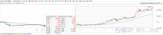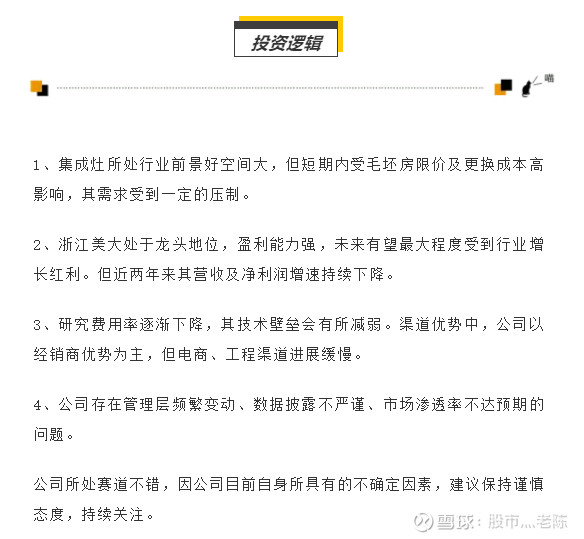 浙江美大(002677):每股净资产 2.1元,每股净利润 0.59元,历史净利润年均增长 19.64%,预估未来三年净利润年均增长 20.63%,更多数据见:浙江美大002677核心经营数据 浙江美大的当前股价 11.34元,市盈率 16.85,未来三年的估值假设和预期收益率如下:15倍PE,预期收益率 36.99%;20倍PE,预期收益率 82.66%;25倍PE,预期收益率 128.32%;30倍PE,预期收益率 173.98%。 今天带大家复盘一下我们在5月31日发布的浙江美大的文章。截止今日,浙江美大涨幅已超75%,同时8月24日公司发布半年报超预期,二季度营收同比增长28%,净利润同比增长40%,大幅度增长,公司业绩出现拐点,也解决了我们文章中指出的公司痛点,未来公司发展前景可期。 @今日话题 #中国平安2020中报业绩发布# #中国中免二季度净利超10亿# 在5月31日浙江美大文章中,我们的主要观点: 从股价预测来看:文章中我们预测浙江美大的股价上涨幅度为20%。但从目前来看,浙江美大涨幅已超75%,远超预期,究其原因,主要为以下3点: $浙江美大(SZ002677)$ (1)集成灶行业恢复速度快,行业景气度有所上升,市场渗透率进程加快。根据产业在线数据,2020年2-4月受疫情影响,集成灶与油烟机行业内销出货量同比增速分别为-30.3%、-28.8%,5月份集成灶实现大反超,其与油烟机行业内销出货量同比增速分别为1.5%、-10.4%。消费者开始逐渐接受集成灶,集成灶的市场渗透率增速呈现出不断扩大的态势,浙江美大作为行业龙头,市场份额持续提升,自然成为了大家的重点关注对象,也是浙江美大股价快速上涨的主要原因。这也印证了我们文章投资逻辑中观点,行业空间大前景好。 (2)浙江美大加大了营销力度,来弥补在新兴渠道上的缺陷。2019年公司主要依靠经销商渠道,电销渠道仅占5%,处于相对较低水平。公司6月24日投资者问答中指出,公司将继续加大和加强市场宣传力度,预计今年销售费用计划投入同比增加50%,尤其是加大线上营销推广等新媒体的宣传力度,这一举措将改善公司新兴渠道增长缓慢的态势,今年618线上销售情况比去年同期大幅增长,为公司带来新的业绩增长点,这也解决我们在投资逻辑中担心的新兴渠道增长缓慢的顾虑。 跟大家讲一个确定性的机会: 关注陈天儊的老粉丝大家都知道,今年陈天儊已经带着粉丝们抓到了4月的金健米业,5月的省广集团,6月的王府井,7月初的浙商证券和光大证券全部一网打尽,现在8月出的君正,深南,北斗星通关注的都吃到大肉,其中协鑫集成收获109%、新日恒力收获59%、等5G、元器件概念数只翻倍大牛! 天儊针对于目前市场,再次复盘选出了一只绝对低估吗,且具有翻倍潜力的龙头股! 该股低估值,转型线上,针对95后推出的几个品牌服饰效果不错,港资连续十五天净买入。中体产业,中国体育总局下面的公司,主营业务房地产不算有赛事管理运行主要是马拉松,体育经纪受益国内冬奥会,彩票业务刚收购了产业链中.上游,逻辑是国内疫情控制住了以后国民对健康的认识更加深刻,最容易发展的就是成本低的跑步和骑行,中体的赛事运行是做的最好的。 北京冬奥会因为控股股东优势相关的体育明星经纪业务会有大幅增加,奥运周边独家代理业务目前有北京,在申请天津,还有奥运旅游和门票收入,冰雪运动的发展也会对估值有提升。目前股价3年横盘刚启动,由于审核问题不能直接公布出来,老地方→某信搜索kw后面加上60再加上338,也就是kw60338一共七位,探讨交流炒股技术,龙头战法,主力控盘战法,强势股操盘方法,识趋势,知买卖 (3)从浙江美大的半年报来看,公司半年报略超预期,二季度业绩大超预期,公司业绩出现拐点。公司上半年营收达到6.46亿元,同比减少了8.26%。公司的主营业务为集成灶,主要销售渠道为经销商,受疫情影响,公司一季度营收同比下降61.35%。二季度公司业绩快速增长,营收达到5.34亿元,同比增长28.81%,远超去年同期21.14%,增速已经实现正增长,已经结束了2018、2019两年营收增速下滑的局面。 再来看公司的净利润,其变化趋势与营收趋势基本相似。公司净利润一季度受疫情影响,同比下滑73.03%,二季度净利润实现大爆发,为1.50亿元,同比增长40.4%,远超去年同期增速27.20%。表明公司业绩恢复能力强,公司业绩已经实现增速上升,业绩出现拐点,也解决了我们文章投资逻辑中所担心的公司业绩增速持续下滑问题。 小结:集成灶行业呈现一个快速发展的态势,浙江美大作为龙头企业受益于行业的高速发展。其营收与净利润都已结束增速下滑,呈现出业绩反转态势,公司对于线上推广等的大力支持,也将解决公司目前新兴渠道发展缓慢的局面,公司目前向着好的方面不断发展。 但是公司目前仍然存在一个最大的问题还没有得到有效解决,需要持续进行跟踪,即公司接班人问题。浙江美大是一个家族企业,其子女接班问题存在较大不确定性。2017年夏志生之子夏鼎担任董事长,2019年其因个人原因辞职,由夏志生之女夏兰担任董事长,2020年,其女夏兰同样因个人原因辞职,期间造成公司业绩波动。目前由夏志生老爷子担任董事长,夏老爷子已有79岁,公司管理层频繁变动,以及接班人的不确定性成为公司的一个风险点,需持续关注。 总的来说,浙江美大目前已经交出了一份比较完美的答卷,公司未来业绩可期,按照公司二季度业绩进行预测,公司2020年市值未来可达200亿以上,目前处于相对低估状态,需要重点关注。 笔者本着负责,专注,诚恳的态度用心写每一篇