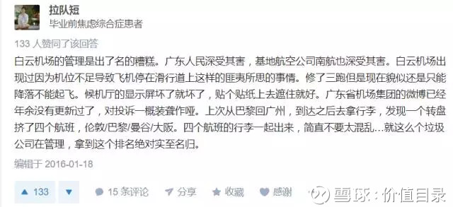一、估值之谜 事情从一张图表说起 奶奶的,上海机场和白云机场运营指标仅有微小差别,净利润和市值相去甚远。估值也是差了差不多10倍。 what happen? 白云机场还能不能翻身? 作为价投重地的机场股,白云机场长期价值如何确定? 低价是机会还是陷阱? 还是要从头说起 二、机场这门生意 民用机场一般可划分为飞行区,地面运输区和候机楼区三个部分。其中,跑道和航站楼是机场核心资产。 为什么? 我们看机场的收入构成 简单来说: 跑道对应航空性收入–飞机起降费等 航站楼对应非航空性收入–商业租赁、广告等 当然,机场也分大小,我们谈论的是—-大型枢纽机场 大型枢纽机场往往拥有多条跑道和多座航站楼, 以白云机场为例,拥有三条跑道和两座航站楼(T2 预计18年2月投产),远期规划5条跑道和3座航站楼。 枢纽机场最大的价值是流量价值和成本的匹配。(这句话是理解机场生意模式的核心) 2016 年底,我国共有颁证运输机场218个,其中一类1级机场3个(首都、浦东、 白云),一类2级机场3个(虹桥、深圳、成都),二类机场19个,其它均为三类机场。A 股共有四家机场上市公司(上海机场、深圳机场、白云机场、厦门空港) 说道流量价值,相信很多对互联网熟悉的小伙伴就精神了。 枢纽机场是不缺流量的。 在流量确定之后,流量的生意,核心在于如何变现,但是在机场上的流量,还要加上一个难度:控制成本。所以说“枢纽机场最大的价值是流量价值和成本的匹配”。这决定了机场股长期ROE水平。 A、基础价值:流量的来源 飞机起降架次和旅客(货邮)吞吐量是一个机场的流量,决定一个机场的基础价值。 飞机起降架次和旅客吞吐量由什么因素影响呢? 答案是: 1、设计产能 2、高峰小时容量:即高峰时间(7:00-22:00),跑道数量和间距 又是决定高峰小时容量的关键因素。 在现行容量标准下,主要枢纽机场容量利用率都在 80%以上,首都机场和虹桥机场利用率超过 95%;但按照国际标准看,中国机场小时容量利用率并不高,挖潜空间巨大。 逻辑就很清楚了: 高峰小时容量决定了日均航班量; 日均航班量决定了旅客和货邮运输量。 B、来钱价值:流量的变现 回到之前讲的机场收入构成:航空性收入和非航空性收入 航空性收入由政府定价,非航空性收入绝大部分执行市场价,其中航空性收费则根据机场等级(高等级机场收费低于小型机场)和航线(国际航线高于国内航线)、机型等因素确定。 也就是说,机场的出身决定了其航空性收入的水平。 那么非航空性收入就可能显示出不同机场的经营管理水平 这里还要普及一个知识:出过国的同学知道,美国的机场好多都破破烂烂,而欧洲的机场则是五彩斑斓,吃喝玩乐一应俱全。这是两种不同的机场管理理念决定的:美式机场类似“跑道”,凸显公用事业特征;欧式机场更强调“商业城”功能,最大化非航收入价值。 机场的非航空性收入中,免税、广告和租赁是三大核心来钱模块。 先看免税模块 首都机场面积是15003平米,保底租赁收入约30亿,而白云机场的T1只有可怜巴巴的1600平米。 但是!这一切将在2018年2月T2投入运营后大大改变! 如果按照首都机场的免税面积和分成比例计算,T2建成后,怎么也要贡献差不多4个亿的收入 然后是广告收入 从净利润来看,白云机场最差,其T1的广告业务由广告公司自主经营,效率不高(可比较机场为专业的三方公司运营)。 白云机场T2建成后,广告业务将由三方公司接手,估计效率会有大幅提升。 最后是商业租赁,这一块没什么好说的。 C、成本 成本结构上看,人工成本、折旧和运行成本是机场主要成本。主要差异集中在折旧和人工,运行成本相差不大。 当然,价投们是很清楚的,折旧并非现金支出,只是会计操作。 从人工成本上看,劳务外包和委托经营模式会显著减少上市公司人工成本。 三、问题出在公司治理 认真阅读本人的同学大致可以自己得出结论,目前白云机场低估值的最大原因在于: 1、经营效率不高;除了本身不需要太多管理的广告板块(相比其他机场,广告板块也很差),其他板块的盈利能力都很差。 2、人员冗杂;在业务规模小于上海机场的情况下,白云机场的员工总数超过上海机场2倍,典型的国企大锅饭病,非核心部门劳务外包比例过低,人力资源管理存在问题。 3、流量价值变现差;由下图的计算得知:人均商业+租赁收入差异达到26元,基本解释了两机场流量大头的收入差异。 四、展望 当然,事物都有两面性,如今凋零的,未来可能大放异彩。 机场属于重资产行业,其产能的投放(主要是航站楼和跑道)之初,短期利用率较低,而折旧、人工等成本相对刚性,通常导致机场短期业绩剧烈下降。(T2投产后,业绩可能会有短期下降风险,如果导致股价下跌,将是极好的入场点) 作为枢纽机场,白云机场的名声虽然不好,但航空出行需求是刚性的,新建的航站楼和跑道并不会长期利用率低,随着业务量的增长,产能利用率回升,业绩必然回升。 另外,白云机场原管理层有罪在身的已归案,欠股东的去大牢里慢慢还吧。 机场16年9月更替了管理层,新一把手邱总脚踏实地的工作思路让我们这些股东很是受用,白云机场股份“掌门人”邱嘉臣谈枢纽之道、服务之道http://www.sohu.com/a/130133471_263678 目前来看,虽然国企很难裁员,但是中国的国有部门,有一条通用规则“老人老办法,新人新办法”,T2的投入使用,为新的用工带来了条件,比如《关于购