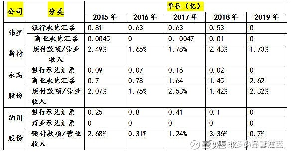 伟星新材(002372):每股净资产 2.29元,每股净利润 0.75元,历史净利润年均增长 30.2%,预估未来三年净利润年均增长 11.04%,更多数据见:伟星新材002372核心经营数据 伟星新材的当前股价 11.3元,市盈率 17.48,未来三年的估值假设和预期收益率如下:15倍PE,预期收益率 13.59%;20倍PE,预期收益率 51.45%;25倍PE,预期收益率 89.31%;30倍PE,预期收益率 127.18%。 财报深度分析管材行业市值前三名: 第一,比较5年总资产,判断公司的实力及扩张能力。 1. 以上数据均减去了商誉和长期待摊费用(以下计算涉及总资产的都用该数值)。 2. 从资产规模来看,永高股份>伟星新材>纳川股份。而年平均增长率是:纳川股份>伟星新材>永高股份。纳川股份增长速度在18年和19年过于缓慢,永高 股份虽然增速缓慢,但总产规模还是笔领先5个点以上。但资产的组成是负债和所有者权益,如果资产大部分来自于负债,那就很危险了,所以要进一步分析。 第二,比较5年资产负债率,判断公司的债务风险。 从三家的资产负债率中可以看出,伟星新材的资产负债率是最低的,在20左右,其他两家均都超过40 ,但也都没有超过70的警戒线,永高股份稳定在40左右,而纳川股份在18年和19年有明显增长负债的趋势。目前三家的偿债风险都很小,没有问题。纳川股份>永高股份材>伟星新材。伟星新材的债务风险是三家中最小的。 第三,比较2019年准货币资金和有息负债总额的大小来判断偿债风险。 准货币资金=货币资金+银行理财产品(有可能在其他流动资产科目也有可能在交易性金融资产科目)。扣除受限金额是因为受限金额对当期偿债没有意义。 有息负债总额=短期借款+应付利息+一年内到期的非流动负债+长期借款+应付债券+长期应付款。 判断标准:准货币资金-限制性存款-有息负债总额>0 1. 从数据中可以看到纳川股份有偿债的风险,伟星新材和永高股份都没有偿债的风险。在此基础上,伟星新材的有息负债总额为0,这是很好的。(事实上货币资金大,只要有息负债金额不大就没有风险,金额大不大的判断标准是合并利润表里的利息支出/净利润,如果>10%,视为有息负债金额大,说明公司不是真的有钱。) 2. 我们再计算2019年准货币资金于总资产的比值:伟星新材为33.01%,永高股份为17.56%,纳川股份为7.93%,从货币资金占比来看,伟星新材>永高股份>纳川股份,货币资金多少不一定能决定公司的核心竞争力,但是一定能决定公司活多久,准货币资金/总资产的比例最好是>25%,这样的既安全又充足。 第四,比较5年,应收应付和预收预付,判断公司的行业地位。 应付预收属于经营性负债,应付预收(应付票据+应付账款+预收款项)-应收预付(应收票据+应收账款 +预付款项 )>0证明公司无偿占用上下游资金,行业地位和竞争力强。 看表得出在没有偿债风险的基础上,应付预收-应收预付>0则证明公司无偿占有上下游资金,行业地位和竞争力强,在这个前提下,应付预收占总负债比例越高说明公司的行业地位和竞争力越强,从上表可以看出,伟星新材 >永高股份>纳川股份。 1. 计算应收账款与营业收入的比率,好行业的第一名的比率<3%,这个比值越小越好,代表应收账款的周转率(一年内应收账款从形成到变现的次数)越高。某个行业第一名的公司第一名 比值>10%,要么公司竞争力弱,产品卖出去收不回来钱,要么行业不景气 ,要么虚增收入的嫌疑,要么行业产能过剩。 2. 一年期的 应收账款/应收账款总额至少要 >70%,该比值越高越好,证明应收账款质量高。 从上表中可以看到,伟星新材在三者中应收账款占营业收入比值最小,但也大于3%,所以即使伟星新材作为管材行业的老大 ,但能看出来这个行业一般,纳川股份的应收账款的质量不好,永高股份虽热有逐年递减的趋势,但目前还是能在70%以上的水平还是很不错的,伟星新材最近五年一直在80%左右,所以一年期内收回的应收账款的质量:伟星新材>永高股份>纳川股份。 通过上表可以看出来,纳川股份的应收票据很少而且都是银票,伟星新材的商票也基本可以忽略不计,而且银票商票逐年呈递减。永高股份的银票递减,商票逐年增加,说明销售遇到困难,销售政策开始放宽,需警惕。三家公司在预付款项比营业收入上的都是<5%的,都是很健康的。 第五,比较5年准固定资产,判断公司的资产类型。 判断标准:准固定资产=固定资产+在建工程+工程物资;准固定资产/总资产>40%的公司为重资产型公司,保持竟争力的成本比较高风险比较大。 从上表可以看出三家公司都属于轻资产类型,而且三家公司固定资产折旧方式一直没变采用年限平均法残废率也都是一样的。 第六,比较5年投资类型,判断公司对主业的专注程度。 与主业无关的投资类型主要包括:A以公允价值计量且其变动计入当期损益的金融资产(准货币基金型的银行理财产品除外),B其他债权类投资,C其他权益工具投资,(B,C又为可供出售金融资产),D债权投资(持有至到期投资),E投资性房地产,F与主业无关的长期股权投资。 从上图来看主业的专注度:永高股份>伟星新材>纳川股份,永高股份对主业的专注程度很高,而伟星新材进军防水净水领域,纳川股份开辟新能源汽车零部件和新能源汽车运营服务。而伟星新材在长期股权投资收益上目前还是亏损状态,但是用的自有资金。 第七,比较5年员工数量和薪酬,判断公司的扩张强度。 当年的薪酬总额计算:合并资产负债表中应付职工薪酬科目今年的