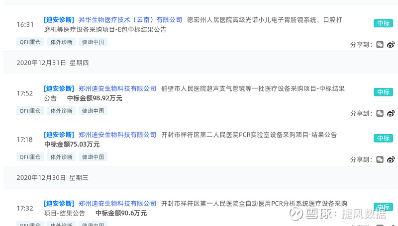 迪安诊断(300244):每股净资产 6.44元,每股净利润 0.71元,历史净利润年均增长 50.34%,预估未来三年净利润年均增长 20.55%,更多数据见:迪安诊断300244核心经营数据 迪安诊断的当前股价 23.22元,市盈率 32.13,未来三年的估值假设和预期收益率如下:15倍PE,预期收益率 -19.65%;20倍PE,预期收益率 7.13%;25倍PE,预期收益率 33.92%;30倍PE,预期收益率 60.7%。 捷风数据2021-01-03根据公开信息搜集发现:【迪安诊断,300244】的昇华生物医疗技术(云南)有限公司《德宏州人民医院高级光谱小儿电子胃肠镜系统、口腔打磨机等医疗设备采购项目-E包中标结果公告》。 以下是【迪安诊断,300244】信息摘要的截图: 数据来源:捷风数据_jiefengnews 接下来,我们小编整理了近期【迪安诊断,300244】的部分经营动态如下,各位大佬可以参考: 1、捷风数据于2021-01-03根据公开信息搜集发现:【迪安诊断,300244】的昇华生物医疗技术(云南)有限公司《德宏州人民医院高级光谱小儿电子胃肠镜系统、口腔打磨机等医疗设备采购项目-E包中标结果公告》; 2、捷风数据于2020-12-31根据公开信息搜集发现:【迪安诊断,300244】的郑州迪安生物科技有限公司《鹤壁市人民医院超声支气管镜等一批医疗设备采购项目-中标结果公告》,公示金额为98.92万元; 3、捷风数据于2020-12-31根据公开信息搜集发现:【迪安诊断,300244】的郑州迪安生物科技有限公司《开封市祥符区第二人民医院PCR实验室设备采购项目-结果公告》,公示金额为75.03万元; 4、捷风数据于2020-12-30根据公开信息搜集发现:【迪安诊断,300244】的郑州迪安生物科技有限公司《开封市祥符区第一人民医院全自动医用PCR分析系统医疗设备采购项目-结果公告》,公示金额为90.6万元; 5、捷风数据于2020-12-30根据公开信息搜集发现:【迪安诊断,300244】的昆山迪安医学检验实验室有限公司《苏州工业园区星湖医院关于检验项目外包服务的中标公告》; 6、捷风数据于2020-12-30根据公开信息搜集发现:【迪安诊断,300244】的重庆迪安医学检验中心有限公司《重庆市合川区妇幼保健院2021年“两癌”TCT服务项目结果公告》。 以下是【迪安诊断,300244】部分经营动态的截图: 数据来源:捷风数据_jiefengnews 了解更多【迪安诊断,300244】的信息,请关注我们捷风数据的动态。 作者:捷风数据_jiefengnews $迪安诊断(sz300244)$ 作者:捷风数据原文链接:https://xueqiu.com/2536037617/167448268 转载请注明:www.51xianjinliu.com » 迪安诊断德宏州人民医院高级光谱小儿电子胃肠镜系统口腔打磨机等医疗设备采购项目-E包中标结果公告 喜欢 (0)or分享 (0)