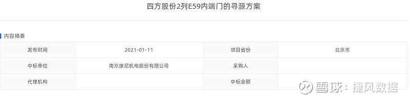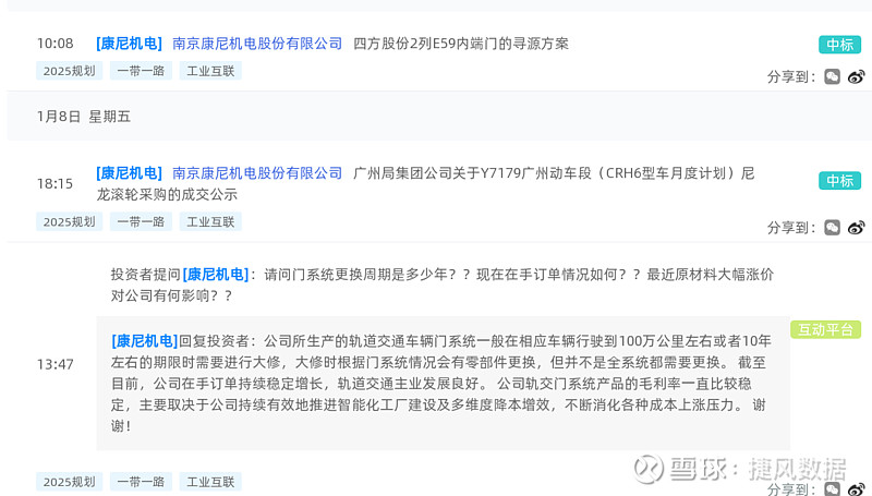 康尼机电(603111):每股净资产 1.93元,每股净利润 -3.22元,历史净利润年均增长 0.0%,预估未来三年净利润年均增长 0.0%,更多数据见:康尼机电603111核心经营数据 康尼机电的当前股价 6.14元,市盈率 -2.54,未来三年的估值假设和预期收益率如下:15倍PE,预期收益率 -886.64%;20倍PE,预期收益率 -1148.86%;25倍PE,预期收益率 -1411.07%;30倍PE,预期收益率 -1673.29%。 捷风数据2021-01-11根据公开信息搜集发现:【康尼机电,603111】的南京康尼机电股份有限公司《四方股份2列E59内端门的寻源方案》。 以下是【康尼机电,603111】信息摘要的截图: 数据来源:捷风数据_jiefengnews 接下来,我们小编整理了近期【康尼机电,603111】的部分经营动态如下,各位大佬可以参考: 1、捷风数据于2021-01-11根据公开信息搜集发现:【康尼机电,603111】的南京康尼机电股份有限公司《四方股份2列E59内端门的寻源方案》; 2、捷风数据于2021-01-08根据公开信息搜集发现:【康尼机电,603111】的南京康尼机电股份有限公司《广州局集团公司关于Y7179广州动车段(CRH6型车月度计划)尼龙滚轮采购的成交公示》; 3、捷风数据于2020-12-31根据公开信息搜集发现:【康尼机电,603111】的南京康尼机电股份有限公司《杭州机场轨道快线站台门系统供货及相关服务站台门系统供货及相关服务[E3300000007000173060001]中标候选人公示》,公示金额为5421.6万元; 4、捷风数据于2020-12-31根据公开信息搜集发现:【康尼机电,603111】的南京康尼科技实业有限公司《中国铁路乌鲁木齐局集团有限公司集中采购成交候选人公示项目名称:客车维修用料项目编号:WTJCZJ2020-287》; 5、捷风数据:【康尼机电,603111】南京康尼新能源汽车零部件有限公司的新能源汽车高压连接器…,项目位于【江苏省】; 6、捷风数据于2020-12-28根据公开信息搜集发现:【康尼机电,603111】的南京康尼机电股份有限公司《广佛地铁列车大修及技改项目康尼车门物料采购》。 以下是【康尼机电,603111】部分经营动态的截图: 数据来源:捷风数据_jiefengnews 了解更多【康尼机电,603111】的信息,请关注我们捷风数据的动态。 作者:捷风数据_jiefengnews $康尼机电(sh603111)$ 作者:捷风数据原文链接:https://xueqiu.com/2536037617/168323723 转载请注明:www.51xianjinliu.com » 康尼机电四方股份2列E59内端门的寻源方案 喜欢 (0)or分享 (0)