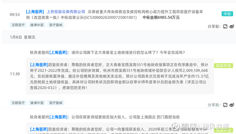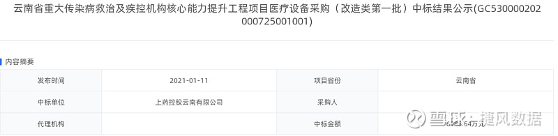 恒瑞医药(600276):每股净资产 5.23元,每股净利润 1.1元,历史净利润年均增长 30.79%,预估未来三年净利润年均增长 28.72%,更多数据见:恒瑞医药600276核心经营数据 恒瑞医药的当前股价 80.59元,市盈率 72.91,未来三年的估值假设和预期收益率如下:15倍PE,预期收益率 -63.61%;20倍PE,预期收益率 -51.48%;25倍PE,预期收益率 -39.35%;30倍PE,预期收益率 -27.22%。 上海医药(601607):每股净资产 14.4元,每股净利润 1.37元,历史净利润年均增长 39.65%,预估未来三年净利润年均增长 12.61%,更多数据见:上海医药601607核心经营数据 上海医药的当前股价 17.25元,市盈率 12.54,未来三年的估值假设和预期收益率如下:15倍PE,预期收益率 70.33%;20倍PE,预期收益率 127.11%;25倍PE,预期收益率 183.88%;30倍PE,预期收益率 240.66%。 捷风数据2021-01-11根据公开信息搜集发现:【上海医药,601607】的上药控股云南有限公司《云南省重大传染病救治及疾控机构核心能力提升工程项目医疗设备采购(改造类第一批)中标结果公示(GC530000202000725001001)》,公示金额为6985.54万元,占上一年营业收入的0.04%。 以下是【上海医药,601607】信息摘要的截图: 数据来源:捷风数据_jiefengnews 接下来,我们小编整理了近期【上海医药,601607】的部分经营动态如下,各位大佬可以参考: 1、捷风数据于2021-01-11根据公开信息搜集发现:【上海医药,601607】的上药控股云南有限公司《云南省重大传染病救治及疾控机构核心能力提升工程项目医疗设备采购(改造类第一批)中标结果公示(GC530000202000725001001)》,公示金额为6985.54万元; 2、捷风数据于2021-01-07根据公开信息搜集发现:【上海医药,601607】的上药控股云南医疗器械有限公司《镇沅彝族哈尼族拉祜族自治县中医院CT设备采购项目中标公告》,公示金额为960.0万元; 3、捷风数据于2021-01-06根据公开信息搜集发现:【上海医药,601607】的上药控股安徽有限公司《疾控中心实验室设备储备及能力建设项目-过氧化氢消毒机等设备采购项目(二次)中标公告》,公示金额为203.0万元; 4、捷风数据于2021-01-05根据公开信息搜集发现:【上海医药,601607】的上药控股如皋有限公司《富皋万泰集团有限公司疫情防控物资储备采购项目-第二批成交公告》,公示金额为175.18万元; 5、捷风数据于2021-01-05根据公开信息搜集发现:【上海医药,601607】的上药控股如皋有限公司《如皋市富皋万泰投资发展有限公司富皋万泰疫情防控物资储备采购项目-第一批成交公告》,公示金额为172.86万元; 6、捷风数据于2021-01-05根据公开信息搜集发现:【上海医药,601607】的上药控股如皋有限公司《富皋万泰集团有限公司疫情防控物资储备采购项目-第三批(1)成交公告》,公示金额为133.66万元。 以下是【上海医药,601607】部分经营动态的截图: 数据来源:捷风数据_jiefengnews 了解更多【上海医药,601607】的信息,请关注我们捷风数据的动态。 作者:捷风数据_jiefengnews $上海医药(sh601607)$ 作者:捷风数据原文链接:https://xueqiu.com/2536037617/168331167 转载请注明:www.51xianjinliu.com » 上海医药云南省重大传染病救治及疾控机构核心能力提升工程项目医疗设备采购改造类第一批中标结果公 喜欢 (0)or分享 (0)