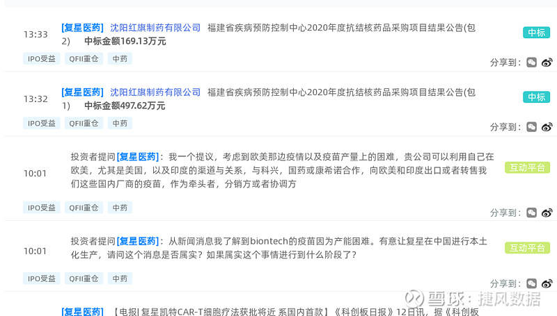 恒瑞医药(600276):每股净资产 5.23元,每股净利润 1.1元,历史净利润年均增长 30.79%,预估未来三年净利润年均增长 28.72%,更多数据见:恒瑞医药600276核心经营数据 恒瑞医药的当前股价 80.59元,市盈率 72.91,未来三年的估值假设和预期收益率如下:15倍PE,预期收益率 -63.61%;20倍PE,预期收益率 -51.48%;25倍PE,预期收益率 -39.35%;30倍PE,预期收益率 -27.22%。 复星医药(600196):每股净资产 11.21元,每股净利润 1.07元,历史净利润年均增长 26.65%,预估未来三年净利润年均增长 17.72%,更多数据见:复星医药600196核心经营数据 复星医药的当前股价 27.63元,市盈率 26.45,未来三年的估值假设和预期收益率如下:15倍PE,预期收益率 -5.24%;20倍PE,预期收益率 26.35%;25倍PE,预期收益率 57.94%;30倍PE,预期收益率 89.53%。 捷风数据2021-01-12根据公开信息搜集发现:【复星医药,600196】的沈阳红旗制药有限公司《福建省疾病预防控制中心2020年度抗结核药品采购项目结果公告(包2)》,公示金额为169.13万元,占上一年营业收入的0.01%。 以下是【复星医药,600196】信息摘要的截图: 数据来源:捷风数据_jiefengnews 接下来,我们小编整理了近期【复星医药,600196】的部分经营动态如下,各位大佬可以参考: 1、捷风数据于2021-01-12根据公开信息搜集发现:【复星医药,600196】的沈阳红旗制药有限公司《福建省疾病预防控制中心2020年度抗结核药品采购项目结果公告(包2)》,公示金额为169.13万元; 2、捷风数据于2021-01-12根据公开信息搜集发现:【复星医药,600196】的沈阳红旗制药有限公司《福建省疾病预防控制中心2020年度抗结核药品采购项目结果公告(包1)》,公示金额为497.62万元; 3、捷风数据于2021-01-07得知【复星医药,600196】办结了有效期为2021-01-26至2026-01-25的污染物排污许可证,该企业主要从事制造业,医药制造业,化学药品制剂制造; 4、捷风数据于2021-01-07得知【复星医药,600196】进行了排污许可证的领取申请,该企业主要从事卫生和社会工作,卫生,基层医疗卫生服务,门诊部(所); 5、捷风数据于2021-01-05根据公开信息搜集发现:【复星医药,600196】的沈阳红旗制药有限公司《云南省传染病医院2020年全省结核药品采购项目A、D标段成交公告》,公示金额为1001.29万元; 6、捷风数据于2021-01-05根据公开信息搜集发现:【复星医药,600196】的沈阳红旗制药有限公司《云南省传染病医院2020年全省结核药品采购项目A、D标段成交公告》,公示金额为943.27万元。 以下是【复星医药,600196】部分经营动态的截图: 数据来源:捷风数据_jiefengnews 了解更多【复星医药,600196】的信息,请关注我们捷风数据的动态。 作者:捷风数据_jiefengnews $复星医药(sh600196)$ 作者:捷风数据原文链接:https://xueqiu.com/2536037617/168492641 转载请注明:www.51xianjinliu.com » 复星医药福建省疾病预防控制中心2020年度抗结核药品采购项目结果公告(包2) 喜欢 (0)or分享 (0)