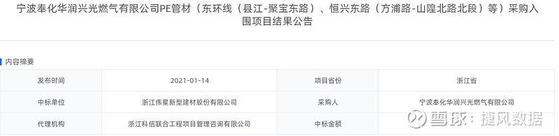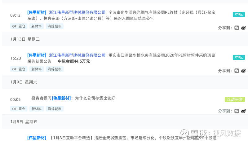 伟星新材(002372):每股净资产 2.29元,每股净利润 0.75元,历史净利润年均增长 30.2%,预估未来三年净利润年均增长 11.04%,更多数据见:伟星新材002372核心经营数据 伟星新材的当前股价 11.3元,市盈率 17.48,未来三年的估值假设和预期收益率如下:15倍PE,预期收益率 13.59%;20倍PE,预期收益率 51.45%;25倍PE,预期收益率 89.31%;30倍PE,预期收益率 127.18%。 捷风数据2021-01-14根据公开信息搜集发现:【伟星新材,002372】的浙江伟星新型建材股份有限公司《宁波奉化华润兴光燃气有限公司PE管材(东环线(县江-聚宝东路)、恒兴东路(方浦路-山隍北路北段)等)采购入围项目结果公告》。 以下是【伟星新材,002372】信息摘要的截图: 数据来源:捷风数据_jiefengnews 接下来,我们小编整理了近期【伟星新材,002372】的部分经营动态如下,各位大佬可以参考: 1、捷风数据于2021-01-14根据公开信息搜集发现:【伟星新材,002372】的浙江伟星新型建材股份有限公司《宁波奉化华润兴光燃气有限公司PE管材(东环线(县江-聚宝东路)、恒兴东路(方浦路-山隍北路北段)等)采购入围项目结果公告》; 2、捷风数据于2021-01-13根据公开信息搜集发现:【伟星新材,002372】的浙江伟星新型建材股份有限公司《重庆市江津区华博水务有限公司2020年PE管材管件采购项目采购结果公告》,公示金额为44.5万元; 3、捷风数据于2021-01-08根据公开信息搜集发现:【伟星新材,002372】的浙江伟星新型建材股份有限公司《2021年度燃气用聚乙烯(PE)注塑管件采购(城燃公司项目)评标结果公示》; 4、捷风数据于2020-12-31根据公开信息搜集发现:【伟星新材,002372】的浙江伟星新型建材股份有限公司《无锡市水务集团有限公司2021年1月-6月PP-R管材管件采购及相关服务项目》,公示金额为368.0万元; 5、捷风数据于2020-12-31根据公开信息搜集发现:【伟星新材,002372】的浙江伟星新型建材股份有限公司《吉林油田矿区供水设施改造项目三期工程管材管件采购项目二标段中标候选人公示》,公示金额为127.91万元; 6、捷风数据于2020-12-28根据公开信息搜集发现:【伟星新材,002372】的天津市伟星新型建材有限公司《塘沽中法2021年度PPR管及管件采购项目》。 以下是【伟星新材,002372】部分经营动态的截图: 数据来源:捷风数据_jiefengnews 了解更多【伟星新材,002372】的信息,请关注我们捷风数据的动态。 作者:捷风数据_jiefengnews $伟星新材(sz002372)$ 作者:捷风数据原文链接:https://xueqiu.com/2536037617/168691899 转载请注明:www.51xianjinliu.com » 伟星新材宁波奉化华润兴光燃气有限公司PE管材东环线县江-聚宝东路恒兴东路方浦路-山隍北 喜欢 (0)or分享 (0)
