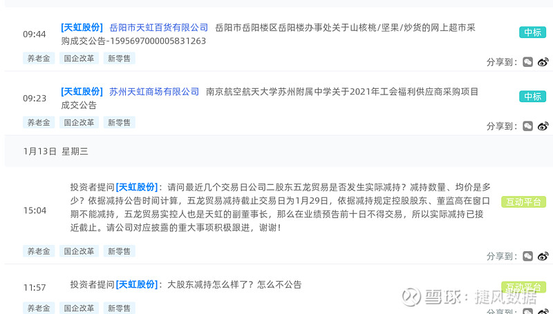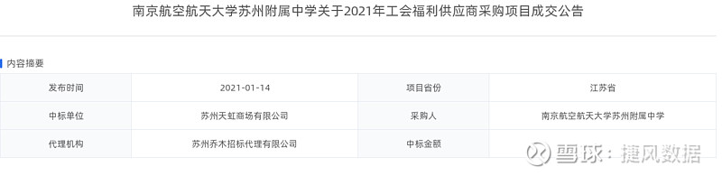天虹股份(002419):每股净资产 5.61元,每股净利润 0.75元,历史净利润年均增长 14.97%,预估未来三年净利润年均增长 5.85%,更多数据见:天虹股份002419核心经营数据 天虹股份的当前股价 9.19元,市盈率 12.49,未来三年的估值假设和预期收益率如下:15倍PE,预期收益率 45.86%;20倍PE,预期收益率 94.48%;25倍PE,预期收益率 143.1%;30倍PE,预期收益率 191.72%。 捷风数据2021-01-14根据公开信息搜集发现:【天虹股份,002419】的苏州天虹商场有限公司《南京航空航天大学苏州附属中学关于2021年工会福利供应商采购项目成交公告》。 以下是【天虹股份,002419】信息摘要的截图: 数据来源:捷风数据_jiefengnews 接下来,我们小编整理了近期【天虹股份,002419】的部分经营动态如下,各位大佬可以参考: 1、捷风数据于2021-01-14根据公开信息搜集发现:【天虹股份,002419】的岳阳市天虹百货有限公司《岳阳市岳阳楼区岳阳楼办事处关于山核桃/坚果/炒货的网上超市采购成交公告-1595697000005831263》; 2、捷风数据于2021-01-14根据公开信息搜集发现:【天虹股份,002419】的苏州天虹商场有限公司《南京航空航天大学苏州附属中学关于2021年工会福利供应商采购项目成交公告》; 3、捷风数据于2021-01-12根据公开信息搜集发现:【天虹股份,002419】的株洲市天虹百货有限公司《中共株洲市委老干部局关于贺卡/卡片的网上超市采购成交公告-1776085000005805451》; 4、捷风数据于2021-01-12根据公开信息搜集发现:【天虹股份,002419】的岳阳市天虹百货有限公司《湖南石油化工职业技术学院关于山核桃/坚果/炒货的网上超市采购成交公告-1569697000005795944》; 5、捷风数据于2021-01-07根据公开信息搜集发现:【天虹股份,002419】的岳阳市天虹百货有限公司《湖南石油化工职业技术学院关于米面杂粮的网上超市采购成交公告-1812697000005769387》,公示金额为17.94万元; 6、捷风数据于2021-01-07根据公开信息搜集发现:【天虹股份,002419】的长沙市天虹百货有限公司《湖南女子学院2021年工会会员元旦、春节节日福利物资采购项目中标公告》。 以下是【天虹股份,002419】部分经营动态的截图: 数据来源:捷风数据_jiefengnews 了解更多【天虹股份,002419】的信息,请关注我们捷风数据的动态。 作者:捷风数据_jiefengnews $天虹股份(sz002419)$ 作者:捷风数据原文链接:https://xueqiu.com/2536037617/168688324 转载请注明:www.51xianjinliu.com » 天虹股份南京航空航天大学苏州附属中学关于2021年工会福利供应商采购项目成交公告 喜欢 (0)or分享 (0)