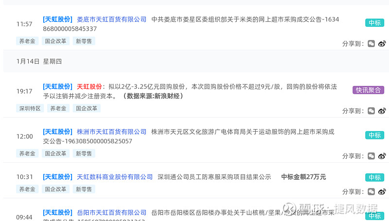 天虹股份(002419):每股净资产 5.61元,每股净利润 0.75元,历史净利润年均增长 14.97%,预估未来三年净利润年均增长 5.85%,更多数据见:天虹股份002419核心经营数据 天虹股份的当前股价 9.19元,市盈率 12.49,未来三年的估值假设和预期收益率如下:15倍PE,预期收益率 45.86%;20倍PE,预期收益率 94.48%;25倍PE,预期收益率 143.1%;30倍PE,预期收益率 191.72%。 捷风数据2021-01-15根据公开信息搜集发现:【天虹股份,002419】的娄底市天虹百货有限公司《中共娄底市娄星区委组织部关于米类的网上超市采购成交公告-1634868000005845337》。 以下是【天虹股份,002419】信息摘要的截图: 数据来源:捷风数据_jiefengnews 接下来,我们小编整理了近期【天虹股份,002419】的部分经营动态如下,各位大佬可以参考: 1、捷风数据于2021-01-15根据公开信息搜集发现:【天虹股份,002419】的娄底市天虹百货有限公司《中共娄底市娄星区委组织部关于米类的网上超市采购成交公告-1634868000005845337》; 2、捷风数据于2021-01-14根据公开信息搜集发现:【天虹股份,002419】的株洲市天虹百货有限公司《株洲市天元区文化旅游广电体育局关于运动服饰的网上超市采购成交公告-1963085000005825057》; 3、捷风数据于2021-01-14根据公开信息搜集发现:【天虹股份,002419】的天虹数科商业股份有限公司《深圳通公司员工防寒服采购项目结果公示》,公示金额为27.0万元; 4、捷风数据于2021-01-14根据公开信息搜集发现:【天虹股份,002419】的岳阳市天虹百货有限公司《岳阳市岳阳楼区岳阳楼办事处关于山核桃/坚果/炒货的网上超市采购成交公告-1595697000005831263》; 5、捷风数据于2021-01-14根据公开信息搜集发现:【天虹股份,002419】的苏州天虹商场有限公司《南京航空航天大学苏州附属中学关于2021年工会福利供应商采购项目成交公告》; 6、捷风数据于2021-01-12根据公开信息搜集发现:【天虹股份,002419】的株洲市天虹百货有限公司《中共株洲市委老干部局关于贺卡/卡片的网上超市采购成交公告-1776085000005805451》。 以下是【天虹股份,002419】部分经营动态的截图: 数据来源:捷风数据_jiefengnews 了解更多【天虹股份,002419】的信息,请关注我们捷风数据的动态。 作者:捷风数据_jiefengnews $天虹股份(sz002419)$ 作者:捷风数据原文链接:https://xueqiu.com/2536037617/168849300 转载请注明:www.51xianjinliu.com » 天虹股份中共娄底市娄星区委组织部关于米类的网上超市采购成交公告-1634868000005845 喜欢 (0)or分享 (0)