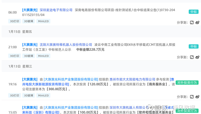 大族激光(002008):每股净资产 7.66元,每股净利润 1.61元,历史净利润年均增长 35.57%,预估未来三年净利润年均增长 3.14%,更多数据见:大族激光002008核心经营数据 大族激光的当前股价 30.21元,市盈率 48.68,未来三年的估值假设和预期收益率如下:15倍PE,预期收益率 -12.29%;20倍PE,预期收益率 16.95%;25倍PE,预期收益率 46.18%;30倍PE,预期收益率 75.42%。 捷风数据2021-01-16根据公开信息搜集发现:【大族激光,002008】的深圳麦逊电子有限公司《深南电路股份有限公司项目-线针测试机1台中标结果公告(1)0730-204011SZ0155/04》。 以下是【大族激光,002008】信息摘要的截图: 数据来源:捷风数据_jiefengnews 接下来,我们小编整理了近期【大族激光,002008】的部分经营动态如下,各位大佬可以参考: 1、捷风数据于2021-01-16根据公开信息搜集发现:【大族激光,002008】的深圳麦逊电子有限公司《深南电路股份有限公司项目-线针测试机1台中标结果公告(1)0730-204011SZ0155/04》; 2、捷风数据于2021-01-15根据公开信息搜集发现:【大族激光,002008】的沈阳大族赛特维机器人股份有限公司《凌云中南工业有限公司EK9水平移载式CMT双机器人焊接工作站(含工装)中标候选人公示》,公示金额为228.7万元; 3、捷风数据于2021-01-12根据公开信息搜集发现:【大族激光,002008】的沈阳大族赛特维机器人股份有限公司《上海凌云工业科技有限公司M3项目焊接机器人工作站及焊接夹具中标候选人公示【C1100000096008056001001/M3项目焊接机器人工作站及焊接夹具】》,公示金额为987.2万元; 4、捷风数据于2021-01-08根据公开信息搜集发现:【大族激光,002008】的大族激光科技产业集团股份有限公司《京东方重庆第6代AMOLED(柔性)生产线项目评标结果公示公告(1)-0714-194BOECQ0001/168》; 5、捷风数据于2021-01-08根据公开信息搜集发现:【大族激光,002008】的大族激光智能装备集团有限公司《激光切割机设备》; 6、捷风数据于2021-01-08根据公开信息搜集发现:【大族激光,002008】的深圳麦逊电子有限公司《深南电路股份有限公司项目-线针测试机1台评标结果公示公告(1)-0730-204011SZ0155/04》。 以下是【大族激光,002008】部分经营动态的截图: 数据来源:捷风数据_jiefengnews 了解更多【大族激光,002008】的信息,请关注我们捷风数据的动态。 作者:捷风数据_jiefengnews $大族激光(sz002008)$ 作者:捷风数据原文链接:https://xueqiu.com/2536037617/168913883 转载请注明:www.51xianjinliu.com » 大族激光深南电路股份有限公司项目-线针测试机1台中标结果公告(1)0730-204011SZ01 喜欢 (0)or分享 (0)