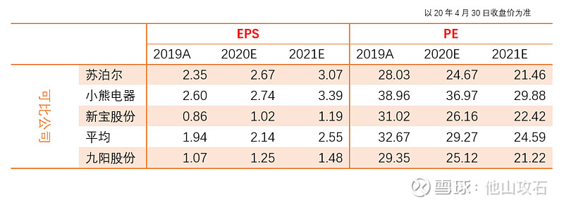 九阳股份(002242):每股净资产 4.6元,每股净利润 0.99元,历史净利润年均增长 25.81%,预估未来三年净利润年均增长 12.94%,更多数据见:九阳股份002242核心经营数据 九阳股份的当前股价 26.01元,市盈率 24.86,未来三年的估值假设和预期收益率如下:15倍PE,预期收益率 -17.75%;20倍PE,预期收益率 9.67%;25倍PE,预期收益率 37.08%;30倍PE,预期收益率 64.5%。 第四部分 估值分析 一、公司估值 对于九阳这样的弱周期性永续经营的消费品公司,采用市盈率估值和DCF估值是合适的。 1、纵向估值对比 从下图看出,九阳当前PE26.28(以2021年1月5日收盘价),处于历史九年和一年高值区域。其历史九年的平均PE约为15.66。 九阳与SharkNinja协同效应的期待,促成了估值新高。由于疫情提供的消费者教育加之相对宽裕的居家休息时间也让用户可以更好地专研并动手制作一些精致食品,因此一些 DIY 美食厨具品类增长迅猛,比如电烤箱、破壁机、电热火锅、电饼档、绞肉机、 空气炸锅、多功能料理锅等等。 资料来源:他山石证券分析软件 2、横向估值对比 下图几个可比公司的横向对比发现:九阳和苏泊尔处于几个公司估值的下部区间。这是因为,这两家公司属于传统小家电龙头企业,线上及线下渠道均衡。 而小熊作为小家电细分市场王者,一直在长尾的网红小品类上深耕细作,公司主营品类在疫情时期增长较快。新宝的线上布局占比也较大。 可比公司横向估值属于合理范围。 2020年25倍PE,考虑到以上公司基本面情况,此估值基本处于合理区间。 估值处于合理偏高位区间。原因如上所述的疫情催生“下厨热”。 3、未来三年业绩预测 4、合理估值区间 请列出估值表,并且做出简要说明。 以下分乐观,中性,悲观三种情形,对九阳进行自由现金流折现估值计算: a.乐观估值 乐观情形假设如下: 近三年自由现金流复合增长为14%,2030年达到稳定状态后永续增长率为4%,这种情形考虑的是我国小家电品类渗透率偏低,户均小家电数量不足 10 台,远低于欧美国家,行业还有很大的发展空间。 资料来源:他山石证券分析软件 b.中性估值 近三年自由现金流复合增长为13%,2030年达到稳定状态后永续增长率为3%. 资料来源:他山石证券分析软件 c.悲观估值 近三年自由现金流复合增长为10%,2030年达到稳定状态后永续增长率为3%. 资料来源:他山石证券分析软件 二、股价弹性、催化剂(可选) 1、消息因素:中报,年报公布 2、业绩因素(变化):中报,年报公布 三、风险提示 1. 宏观经济下行风险:疫情影响下若宏观经济增速下行,则居民消费力或有所受损, 对可选消费品的购买力或许受到影响。 2. 行业增速不及预期:豆浆机、料理机、电饭煲产品的保有量较高,渗透率水平较高,若行业增速下滑则公司受益品类或面临承压。 3. 原材料价格变动风险:公司产品受原材料价格变动影响,若上游原材料涨价,对公司成本转嫁能力或有影响。 4. 短期涨幅过高引发股价调整的风险。 附:主要参考资料 1、 参考书籍及文章: 1)九阳股份2019及2018年年报及IPO文件 2)经营交流纪要:九阳股份2019年报电话会议纪要 20200401 3)【光大家电】九阳股份2020Q1业绩交流会纪要 20200430 2、调研情况(报告和实地调研) 1)华西证券研报 –“内外协调一体,迎接新成长周期”2020年4月11日 3、重要讨论或访谈纪要 @今日话题 $九阳股份(SZ002242)$ 作者:他山攻石原文链接:https://xueqiu.com/5199227742/168918248 转载请注明:www.51xianjinliu.com » 九阳股份投资价值分析报告 – 下 喜欢 (0)or分享 (0)