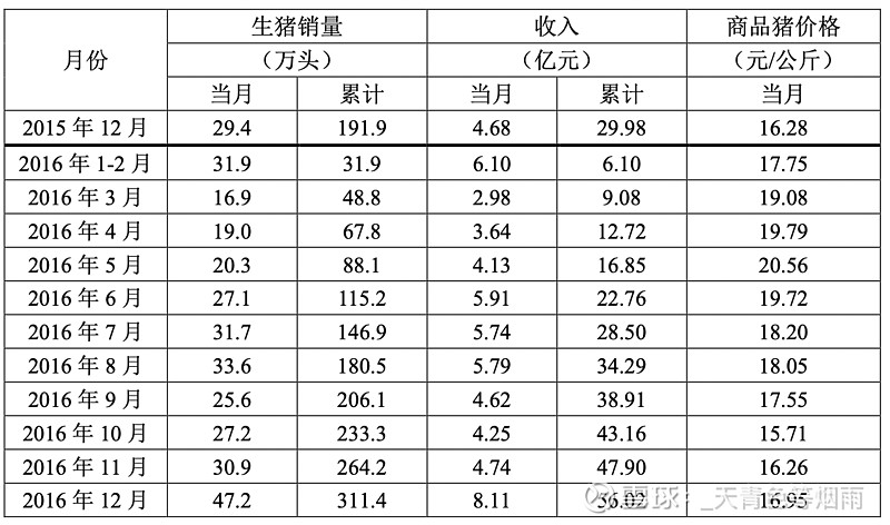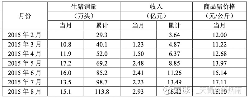 牧原股份(002714):每股净资产 9.37元,每股净利润 2.82元,历史净利润年均增长 51.76%,预估未来三年净利润年均增长 65.23%,更多数据见:牧原股份002714核心经营数据 牧原股份的当前股价 113.71元,市盈率 41.0,未来三年的估值假设和预期收益率如下:15倍PE,预期收益率 -1.29%;20倍PE,预期收益率 31.61%;25倍PE,预期收益率 64.52%;30倍PE,预期收益率 97.42%。 牧原股份2014年1月28日上市: 2020年数据: 2020 年 12 月份,公司销售生猪 264.1 万头,销售收入 66.86 亿元。其中向 全资子公司牧原肉食品有限公司(简称“牧原肉食”)销售生猪 13.7 万头。 2020 年第四季度,公司共销售生猪 623.4 万头,其中商品猪 485.5 万头,仔 猪 127.0 万头,种猪 10.9 万头。 2020 年,公司共销售生猪 1,811.5 万头,其中商品猪 1,152.4 万头,仔猪 594.8 万头,种猪 64.3 万头。 截至 2020 年 12 月底,公司能繁母猪存栏为 262.4 万头,后备母猪存栏为 131.9 万头。 由于农历春节日期的差异,造成 1 月、2 月的销售量在月度间呈现较大的波 动,为了更加客观、真实的反映销售情况,公司将在 3 月份合并披露 1-2 月的销 售情况,敬请留意。 2019年数据: 2019 年,公司共销售生猪 1,025.33 万头,其中商品猪 867.91 万头,仔猪 154.71 万头,种猪 2.71 万头。 进入冬季后,北方地区施工进度受影响,部分猪舍交付延期。截至 2019 年 12 月底,公司能繁母猪存栏为 128.32 万头,后备母猪存栏约 72 万头。 由于农历春节日期的差异,造成 1 月、2 月的销售量在月度间呈现较大的波 动,为了更加客观、真实的反映销售情况,公司将在 3 月份合并披露 1-2 月的销 售情况,敬请留意。 2018年数据: 2018 年,公司共销售生猪 1101.1 万头,其中商品猪 1010.9 万头,仔猪 86.4 万头,种猪 3.8 万头。 2017年数据: 2016年数据: 2015年数据: 2015 年 1-2 月份,公司销售生猪 29.3 万头,销售收入 3.64 亿元。 2015 年 1-2 月份,公司商品猪销售均价 12.00 元/公斤,比 2014 年 12 月下 降 9.5%。 2015 年 1-2 月份,公司商品猪销售价格在 1 月中旬之前基本保持稳定,之后 逐步下降。 关于 2015 年出栏量的说明 : 公司在 2014 年年报中披露:“2015 年,公司计划出栏生猪 200 万头至 260 万头。”2015 年 1-12 月,公司对外销售生猪 191.9 万头;随着新建产能陆续投产, 公司的种猪存栏规模也相应增加,2015 年 12 月 31 日,公司能繁母猪存栏比 2014 年 12 月 31 日增加 11.6 万头;这导致对外生猪销售量受到一定影响。考虑自用 种猪因素后,2015 年公司生猪出栏量为 203.5 万头,与 2014 年年报披露的计划 出栏量相符。 2014年数据: 2014 年 12 月份,公司销售生猪 25.6 万头,销售收入 3.83 亿元。2014 年 12 月份,公司商品猪销售均价 13.26 元/公斤,比上月下降 2.6%。 2014 年 12 月份,公司商品猪销售价格上旬保持稳定,中旬有所回落,下旬基本稳定。 2014 年 11 月份,公司销售生猪 17.2 万头,销售收入 2.76 亿元。2014 年 11 月份,公司商品猪销售均价 13.62 元/公斤,比上月下降 1.3%。 2014 年 11 月份,公司商品猪销售价格上旬保持上涨,中、下旬有所回落。 2014 年 10 月份,公司销售生猪 12.3 万头,销售收入 1.91 亿元。2014 年 10 月份,公司商品猪销售均价 13.8 元/公斤,比上月下降 4.4%。 2014 年 10 月份,公司商品猪销售价格,总体保持稳定,下旬价格有所回落。 2014 年 9 月份,公司销售生猪 16.2 万头,销售收入 2.47 亿元。2014 年 9 月份,公司商品猪销售均价 14.43 元/公斤,比上月下降 1.9%。 2014 年 9 月份,公司商品猪销售价格,在 9 月上、中旬基本保持稳定,下旬价格有所回落后已经企稳。 2014 年 8 月份,公司销售生猪 13.1 万头,销售收入 1.94 亿元。2014 年 8 月份,公司商品猪销售均价 14.71 元/公斤,比上月上升 8.5%。 2014 年 8 月份,公司商品猪销售价格,在 8 月上旬继续上涨,8 月中、下旬呈现小幅波动。 2014 年 7 月份,公司销售生猪 15.8 万头,销售收入 2.26 亿元。 2014 年 7 月份,公司商品猪销售均价 13.56 元/公斤,比上月上升 5.7%,比上年同期下降 4.9%。 2014 年 7 月份,公司商品猪销售价格总体呈现温和上涨。 2014 年 6 月份,公司销售生猪 14.6 万头,销售收入 1.94 亿元。 2014 年 6 月份,公司商品猪销售均价 12.82 元/公斤,比上月上升 0.2%,比 上年同期下降 10.3%。 2014 年 6 月份,公司商品猪销售价格延续 5 月中下旬以来的走势,总体平 稳,围绕月销售均价呈现窄幅波动。 2014 年 5 月份,公司销售生猪 16.0 万头,销售收入 2.24 亿元。 2014 年 5 月份,公司商品猪销售均价 12.79 元/公斤,比上月上升 22.1%, 比上年同期下降 0.3%。 随着“五一”之后全国范围内的猪价反弹,公司 5 月份商品猪销售价格也呈 现快速回升态势;至 5 月后半期,猪价较最高点有所回落,并逐步趋稳。 公司已经在 2014 年 4 月 16 日披露的《2014 年第一季度报告》中预 计公司 2014 年 1-6 月份净利润为亏损 1.0-1.4 亿元。生猪市场价格的不可控性给 公司 2014 年 1-6 月份的经营业绩预计带来很大的困难,一旦有证据表明实际经 营情况与上述业绩预计区间存在差异,公司将及时公告。 2014 年 4 月份,公司销售生猪 18.4 万头,销售收入 2.17 亿元。 2014 年 4 月份,公司商品猪销售均价 10.48 元/公斤,比上月下降 3.8%,比 上年同期下降 13.2%。 2014 年 4 月份,公司商品猪销售价格总体呈现“低位运行”,4 月下旬商品 猪销售价格出现逐步回升态势。 风险: (一)生猪市场价格的大幅波动(下降或上升),都可能会对公司的经营业 绩产生重大影响。如果未来生猪市场价格出现大幅下滑,