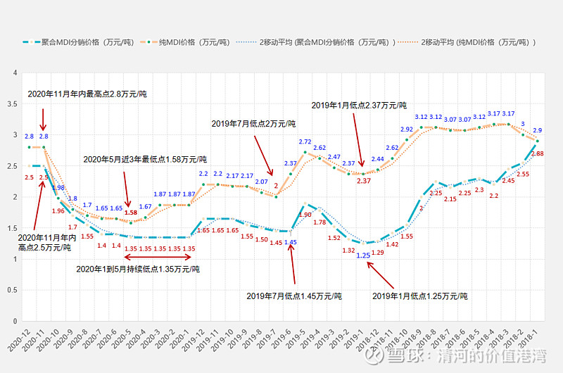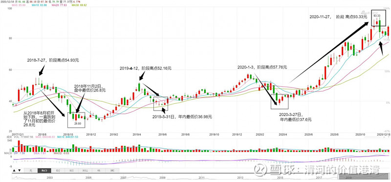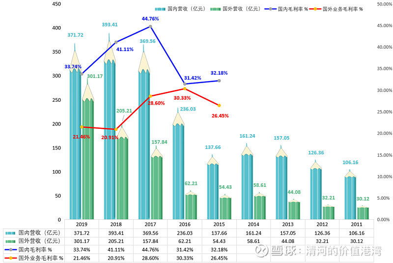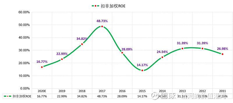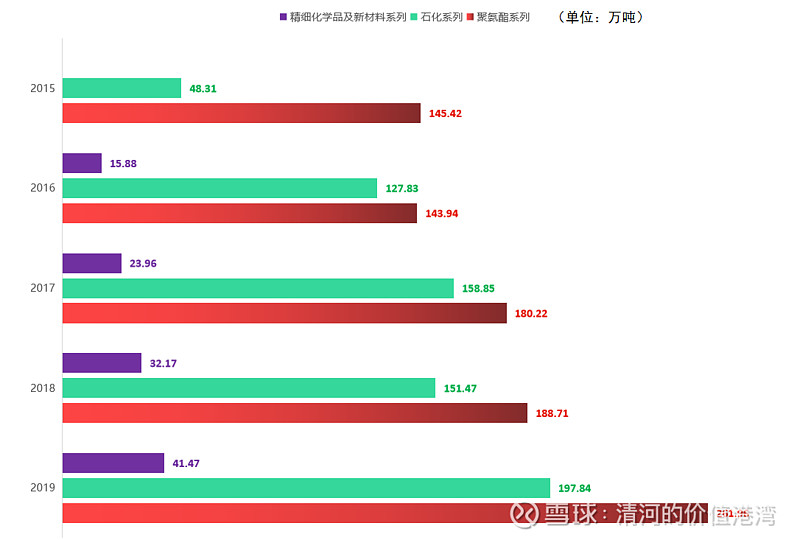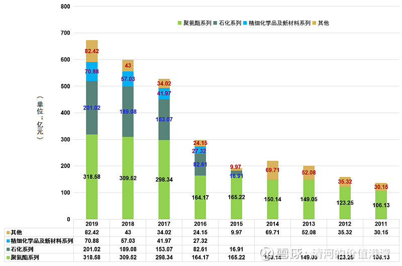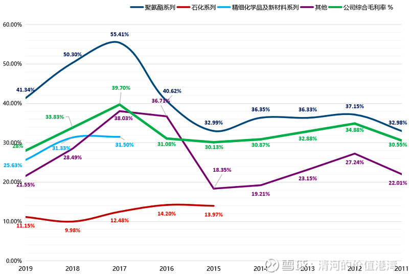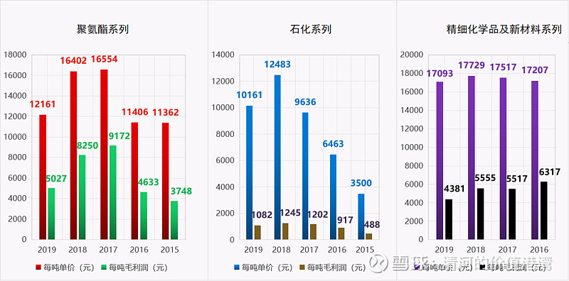万华化学(600309):每股净资产 12.85元,每股净利润 3.88元,历史净利润年均增长 26.74%,预估未来三年净利润年均增长 12.48%,更多数据见:万华化学600309核心经营数据 万华化学的当前股价 41.59元,市盈率 26.38,未来三年的估值假设和预期收益率如下:15倍PE,预期收益率 99.14%;20倍PE,预期收益率 165.52%;25倍PE,预期收益率 231.9%;30倍PE,预期收益率 298.28%。 本文首发于微信公众号:价值港湾,此公众号后续会发布更多公司估值分析文章,欢迎关注。 价值港湾声明:此文章为公司研究,内容仅供参考,不构成投资建议。如投资者据此操作,请自担风险。 一,万华化学主营业务分析 1.1,公司历年主营业务收入分产品类别分析 公司产品主要包括聚氨酯系列(MDI、TDI、聚醚多元醇)、石化系列(丙烯及其下游丙烯酸、环氧丙烷等)、精细化学品及新材料系列(SAP、TPU、PC、PMMA、有机胺、ADI、水性涂料等)以及其他产品,其中聚氨酯系列是公司一直以来的最主要的产品系列。 公司年报从2015年起开始披露石化系列产品的营收和销量情况,从2016年起开始披露精细化学品及新材料系列产品的营收和销量情况,公司主要产品历年营业收入数据如下图所示: (1),公司聚氨酯系列产品营收从2011年的106.13亿元增加到2019年的318.58亿元,年复合增长率为14.8%; (2),公司石化系列产品营收从2015年的16.91亿元增加到2019年的201.02亿元,年复合增长率为85.7%; (3),公司精细化学品及新材料系列产品营收从2016年的27.32亿元增加到2019年的70.88亿元,年复合增长率为37.5%; 过往几年石化系列产品的增长率高于精细化学品及新材料系列和聚氨酯系列,考虑到公司2019年年报披露石化系列和精细化学品及新材料系列都有新项目在建,因此在可以预见的未来几年,预计这两个产品系列营收仍将保持较快增长。 1.2,历年主营业务收入按地区划分的发展情况分析 (1), 公司来自国内的营业收入从2011年的106.16亿元增加到了2019年的371.72亿元,年复合增长率为17%; (2),公司来自国外的营业收入从2011年的30.12亿元增加到了2019年的301.17亿元,年复合增长率为33.4%; 来自国外的营业收入占比从2011年的22.1%逐步增加至2019年的44.76%,显示出海外营收的增长拉动了公司总营收的快速增长(这其中也有2018年万华并表匈牙利BorsodChem带来的2019年国外营收大幅提升的影响,但剔除这一并表因素,万华海外营收增长速度仍远高于国内),预计未来海外营收的持续增加也是万华的长期增长潜力之一。 由上图可知,万华国内营收的毛利率持续高于国外营收,显示出其海外业务仍有较大的利润提升空间。但每年其国内外业务的毛利率变动幅度都比较大,显示出此行业在国内外都具有较强的周期性特点。 1.3,历年毛利率按主营产品类别分析 (1),公司聚氨酯系列产品的毛利率从2011年的32.98%提升到2017年的近年最高点55.14%, 从2018年至2019年逐年降低但仍保持在相对较高的水平; (2),公司精细化学品及新材料系列产品的毛利率从2017年的31.5%降到了2019年的25.65%,呈逐年下降的趋势; (3),公司的石化系列产品毛利率从2015年的13.97%降低到了2019年的11.15%,在三大产品系列里处于最低水平。 (4),公司综合毛利率从2011年的30.55%波动增加到2017年的39.7%,又逐渐跌落至2019年的28%,从2011年到2019年,公司综合毛利率的变化趋势与聚氨酯系列产品的变化趋势相同,由于除聚氨酯产品以外的其他产品毛利率相对较低,因此拉低了公司的综合毛利率。 (5),根据过去几年的发展趋势,可以预期,未来公司石化产品和精细化学品及新材料系列产品的营收占比会进一步提升,而这些产品的毛利率又远低于聚氨酯系列产品的毛利率,因此预计公司综合毛利率水平在未来几年会处于逐渐下降趋势(除非公司的石化产品的毛利率水平在未来几年会有较大幅度提升)。 1.4, 历年主营产品销量变化趋势分析 1.5, 公司主营产品每吨单价和每吨毛利润近5年变化趋势 (1) , 公司聚氨酯系列产品每吨单价从2015年的11362元增加到2017年的16554元,再从2018年的16402元降低到2019年的12161元,呈先升后降态势,每吨毛利润的变动趋势与每吨单价的变动趋势相同,其中2017年较2016年 的吨单价和吨毛利都有较大幅度增长,而2019年相较2018年又较大幅度的下降,这与我们之前看到的公司扣非净利润的变化趋势一致,说明公司当前营收、毛利、净利、的变化趋势都由聚氨酯产品的营收、毛利、净利的变化趋势决定。 (2) , 公司石化系列产品的每吨单价和每吨毛利润从2015到2018年处于同比提升的态势,分别从3500元和488元增加到了12483元和1245元,2019年每吨单价和每吨毛利较2018年同比都有所下降,但是考虑到2019年石化 产品的销售量较2018年有大幅提升,因此石化产品2019年的总毛利额较2018年仍有所提高。 (3),公司精细化学品及新材料系列产品每吨单价从2016年的17207元略降到2019年的17093元,每吨毛利从2016年的6317元降到了2019年的4381元(降低了30.65%),每吨毛利的下降幅度远大于每吨营收的下降幅度。但是考虑到其销量从2016年的15.88万吨增加到了2019年的41.47万吨,(年复合增长率为38%),因此精细化学品及新材料系列产品的总毛利额从2016年 到2019年处于总体增长的趋势,见下图产品类别毛利额分析。 1.6,按主营产品类别毛利额分析 (1),公司聚氨酯系列产品的毛利额从2011年的35亿元增加到了2019年的131.7亿元,其中2011到2017年处于上升态势,2017到2019年处于下降态势。毛利额年复合增长率