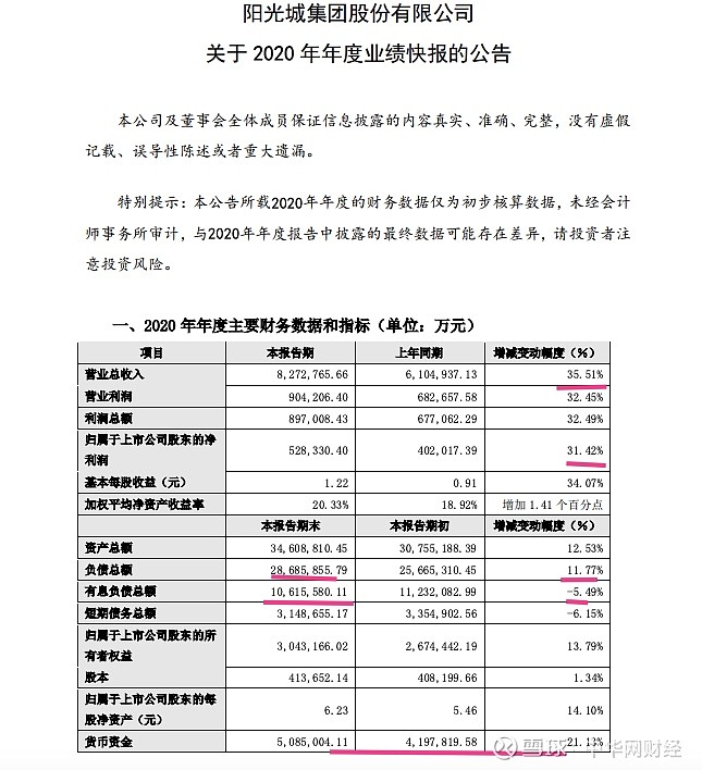 阳光城(000671):每股净资产 4.89元,每股净利润 0.66元,历史净利润年均增长 60.78%,预估未来三年净利润年均增长 35.1%,更多数据见:阳光城000671核心经营数据 阳光城的当前股价 6.98元,市盈率 7.73,未来三年的估值假设和预期收益率如下:15倍PE,预期收益率 249.74%;20倍PE,预期收益率 366.32%;25倍PE,预期收益率 482.9%;30倍PE,预期收益率 599.48%。 中华网财经1月18日讯:在带着对赌条件的险资入股后阳光城或正处于迎来新的阳光之后。 日前,阳光城发布关于2020年年度业绩快报的公告显示,阳光城2020年实现营收827.28亿元,同比增长35.51%;营业利润90.42亿元,同比增长32.45%;归母净利润52.83亿元,同比增长31.42%,基本每股收益1.22元,加权平均净资产收益率20.33%。 整体数据显示,2020年末,阳光城的总资产为3460.88亿元,总负债2868.59亿元较上年提升11.77个百分点,有息负债1061.56亿元,有息负债同比减少5.49%,短期债务总额314.87亿元,同比减少6.15%。 截至2020年末,阳光城的资产负债率82.89%,较去年末下降0.56个百分点,有息资产负债率30.67%,较去年末下降5.85个百分点,净负债率93.38%,较去年末下降44.83个百分点;货币资金为508.5亿元,同比增长21.13%。 公告中,阳光城表示,2020年9月,公司引入战略投资人泰康人寿及泰康养老,优化了公司的股权结构以及治理水平、增强了公司资源整合及获取能力。在保证公司稳健经营的同时,进一步优化资产负债结构,坚持“规模上台阶,品质树标杆”的战略目标不动摇,力求实现优质、稳健、长久的可持续发展。 三类担保额968.32亿元占上市公司权益的362.06% 值得一提的是,同日(1月16日),阳光城接连发布三则担保公告,为参股子公司累计10.62亿元融资担保,分别为岐若企业管理、东莞桂芳园房地产、汇珠实业,提供1.98亿元、5.94亿元、2.7亿元的融资连带责任担保。 中华网财经获悉,克而瑞研究中心报告显示,随着资金压力大增,各大房企积极探寻高效的融资方式,缓解资金压力。2020年11月以来,22家上市房企提供担保事件累计达185次,总额超过1000亿元。报告显示,自2020年11月至2021年1月初,中南建设担保40次,涉及金额203.8亿元;泰禾集团担保4次,涉及金额190.4亿元;阳光城担保19次,涉及169亿元。 中华网财经翻阅阳光城最近一期《关于为参股子公司汇珠实业提供担保的公告》,公告中累计对外担保金额及逾期担保的金额截至本公告披露日,公司及控股子公司对参股公司提供担保实际发生担保金额为157.45亿元,占最近一期经审计合并报表归属母公司净资产58.87%。公司及控股子公司为其他资产负债率超过70%的控股子公司提供担保实际发生担保金额为742.43亿元,占最近一期经审计合并报表归属母公司净资产277.60%。公司及控股子公司为其他资产负债率不超过70%的控股子公司提供担保实际发生担保金额为68.44亿元,占最近一期经审计合并报表归属母公司净资产25.59%。上述三类担保合计实际发生担保金额为968.32亿元,占最近一期经审计合并报表归属母公司净资产362.06%。除上述三类担保,公司不存在其他对外担保。 担保总余额为765.11亿元占上市公司权益的388.38% 而泰禾集团已呈现明显差别。 据泰禾集团此前发布最近一期“担保”公告信息显示,截至目前(2020年12月26日),公司及控股子公司对外担保总余额为7,651,101万元,占公司最近一期经审计归属于母公司所有者权益的388.38%,其中上市公司及其控股子公司对合并报表外单位提供的担保总余额为192,842万元,占公司最近一期经审计归属于母公司所有者权益的9.79%;实质性逾期债务对应的担保余额为408,217万元,其中涉及诉讼的担保金额为106,580万元,因被执行而应承担的担保金额为301,637万元。 值得注意的是,泰禾“违约”事件前,2020年4月18日的一次有关担保公告显示,截至本公告披露日,本公司实际对外担保余额为7,568,052万元,占公司最近一期经审计归属于母公司所有者权益的410.00%。其中,对参股公司实际担保289,044万元,其余均为对全资、控股子公司的担保以及全资、控股子公司之间提供的担保,公司不存在逾期担保的情况。之后事件爆发后泰禾集团便是下面的情况: 依据上述克而瑞数据及最新阳光城新增担保额,可以清晰了解到的是阳光城当前担保金额低于泰禾约10.8亿元,而二级市场也有着不同反应: 负债超监管“红线”、财务归属“橙色”阵营 不过,据2020年8月,央行、住建部共同在北京召开了重点房地产企业座谈会,以期逐步解决房地产行业过热、房企信用风险上升等问题。在本次座谈会中,监管部门首次提出了“三道红线”的管理理念,意在对房地产企业的融资进行进一步的标准化管理,在预防行业系统性风险的同时,为“房住不炒”的管理目标搭建有效的落地路径。 值得注意的是,阳光城为邀参参会的重点房企之一。 会上监管部门确定,为有效实现上述管理目标,“三道红线”以对房企负债管理为管理工具,强调房地产企业需满足:(1)房企剔除预收款的资产负债率不得大于70%;(2)净负债率不得大于100%;(3)现金短债比不得小于1倍。同时,根据企业三道红线的触发情况,将房地产企业划分为“红、橙、黄、绿”四档位,针对差异化档位的企业,对其后续融资进行要求。 具体为,全部“踩线”,为红色档,有息负债不得增加;两项“踩线”,为橙色档,有息负债规模年增速不得超过5%;一项“踩线”,为黄色档,有息负债规模年增速可放宽至10%;若全部指标符合监管层要