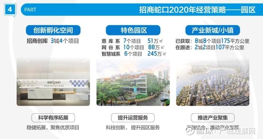 招商蛇口(001979):每股净资产 8.24元,每股净利润 1.89元,历史净利润年均增长 40.47%,预估未来三年净利润年均增长 20.71%,更多数据见:招商蛇口001979核心经营数据 招商蛇口的当前股价 16.77元,市盈率 11.01,未来三年的估值假设和预期收益率如下:15倍PE,预期收益率 197.34%;20倍PE,预期收益率 296.45%;25倍PE,预期收益率 395.56%;30倍PE,预期收益率 494.68%。 新冠肺炎疫情发生以来,随着国际国内经济下行压力的逐步增大,在区域经济中扮演重要角色和承担拉动作用的园区经济承压日重。目前,园区项目发展主要面临以下三个问题:一是园区同质化竞争倾向严重,二是运营成本高和债务压力大,三是专业化服务水平一般。 招商蛇口一直是园区创新的探路者。招商蛇口旗下目前有4座招商创库、7座意库、10座网谷、6座智慧城、以及8座产业新城/小镇,园区类别覆盖孵化器到产业新城。如何保证这些项目的稳健经营?精细化运营是关键。精细化运营推动招商蛇口产业园区提质增效,使得园区通过从园区和企业内部自我提升,来应对上述三个问题。 以招商蛇口的实践作为案例,我们总结了招商蛇口园区运营的“六脉神剑”。需要指出的是,此处的运营不是只局限于针对园区的运营活动,还包括企业运营和资本运营这类通过提升整体经营效率,来推动园区业务与整体业务共同成长的活动。 △招商蛇口2020年园区经营策略(图源:《招商蛇口2019年度业绩发布会暨投资者交流会》) 做强园区产业服务平台,为入驻企业赋能,提供金融服务、人才服务等增值服务,有效助力园区入驻企业的业务开展和公司运营。 招商蛇口案例:招商创库 招商创库(i-COOL)产品是招商局双创示范基地的主要平台、招商局创新中心的主要空间载体。服务对象覆盖国际头部创新中心、人工智能、物联网、芯片设计等行业技术前沿团队,依托网谷、意库园区的丰富场景和产业生态,解决入驻双创示范基地的创新创业企业在创新空间、技术加速、资本扶持、生态社交、场景实验、数字算力六大品类的特色服务需求。 △招商创库 在招商创库设计初期,调研得知双创企业最大的痛点问题集中在:租赁物业空间房租高导致运营成本高、缺资源接口导致好产品找不到合作伙伴。如何降低创新创业企业成本,又能为创新创业企业带来额外增值服务价值成为招商创库的开拓方向。 基于招商蛇口双创建设模式,招商创库从“平台、空间、资源”等维度,构建了“连接一切、赋能于人”的共享生态体系,协同全球产业龙头、400多家合作伙伴、120多家创投机构、20多家行业协会及产学研机构,为创新创业者提供全产业生命周期服务,让客户聚集、聚合,最后发生聚变。 △招商创库构建共享生态体系 除资金、技术之外,丰富的空间场景资源,也是创新创业企业迫切需要的关键资源。招商创库为入驻企业开放空间场景(如停车场、门禁等),企业入驻还可使用42万㎡的蛇口网谷和文创地标南海意库搭建和测试各类场景服务。中小微企业在这里加速实现技术到产品、产品到商品的转化。 对于文创园区来说,通过举办公共创意活动,与园区外的市民相融合,走更加亲民化的路线,园区聚集人气、打响知名度,也进一步提升普通市民的创意消费观念、承担社会责任。例如,台北松山文创园区的成功离不开举办各种各样的展览、创意活动。从 2012 年开始已经连续举办八年的松山文创园区“原创基地节”,旨在吸引居民走到户外,欣赏地景艺术。 △2019松山文创园区基地原创节 招商蛇口案例:南海意库国际市集 意库国际市集COOOL-MART是招商产业为文创园产品系列打造的专属活动IP。以文创园区“南海意库”充满设计气息的园区空间为基础,将创意市集场景、艺文元素与国际文化特色充分结合,让参与者感受到不一样的国际园区文化氛围。蛇口片区亦是深圳外籍人士主要的居住聚集地,意库国际市集因此具有浓郁的片区特色,成为国际文化的融汇地和交流地。 △今年中秋在南海意库举行的“提灯寻月”为主题的市集 南海意库前身是八十年代初三洋老旧厂房,是改革开放最早的三来一补厂房之一,在深圳市“文化立市”的背景下,招商蛇口正式回购三洋厂区,易名为“南海意库”。在“以文带创、以创兴商,以商成文”的宗旨下,南海意库引进多品类和高水平的企业,形成创意界首脑云集的企业集群。成熟的产业聚集和运营经验,成为意库IP的旗舰样板。 △意库国际市集现场 产业园区的服务场景覆盖企业办公、园区社交、园区商业等多个模块,为园区主管单位、入驻企业、园区员工提供一站式服务解决方案。 招商蛇口案例:苏州金融小镇内商业“花园天地”、壹棠服务公寓 2020年9月,苏州金融小镇内,招商蛇口打造的商业“花园天地”及壹棠服务公寓开业。苏州金融小镇由招商蛇口携手苏高新金控联合打造,是江苏省内首家新型金融服务业集聚区载体项目,江苏省省级特色小镇,苏州市级首批特色小镇。 “花园天地商业街区”内引入的品牌与金融小镇的气质非常契合。商业街区周边大院大所林立,科研人才荟萃,得天独厚的资源优势,让大疆科技体验馆的引入更加恰如其分。招商蛇口还将谢金发美术馆带进商业街区,营造商业空间的艺术氛围,打造艺术社交新主场。 △坐镇主入口的大疆科技体验馆,建筑面积2300平,是大疆在国内最大的展厅 △谢金发美术馆 在丰富
