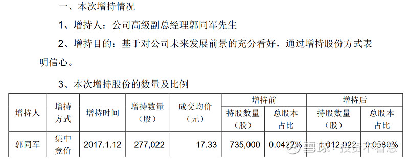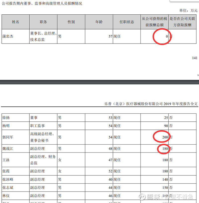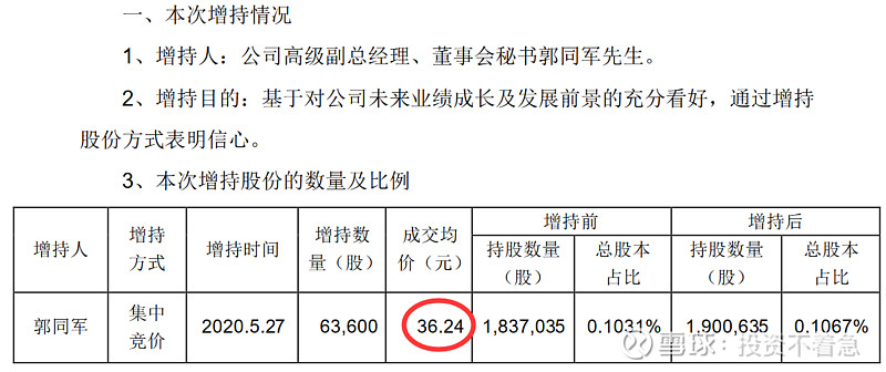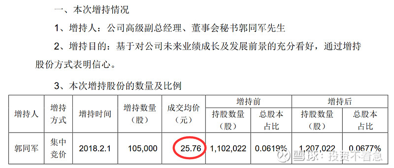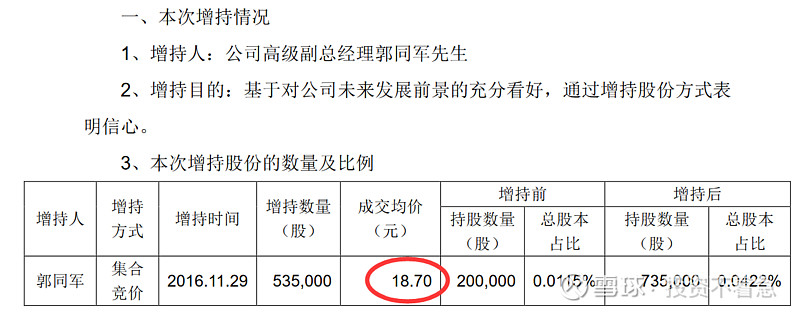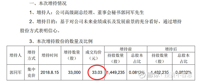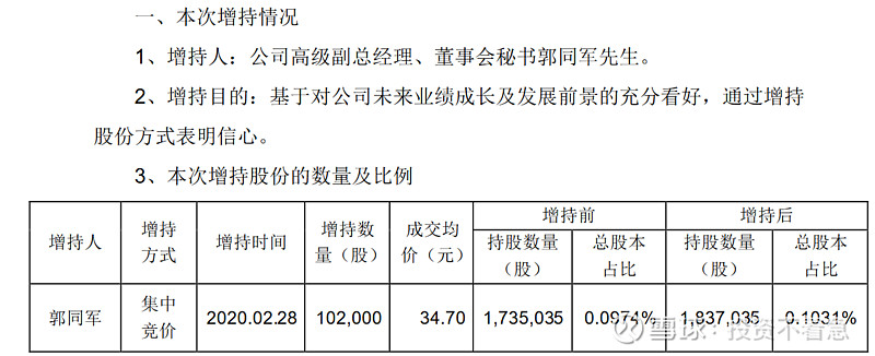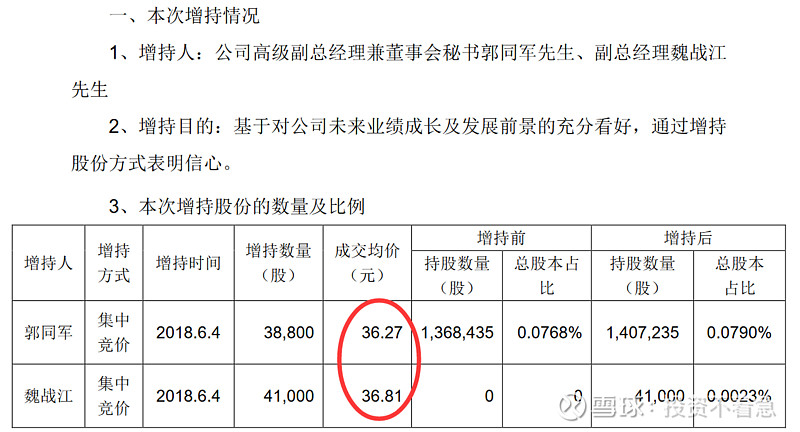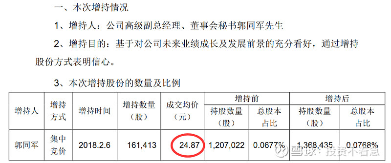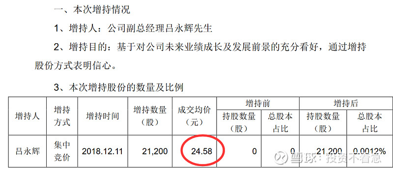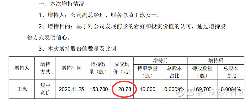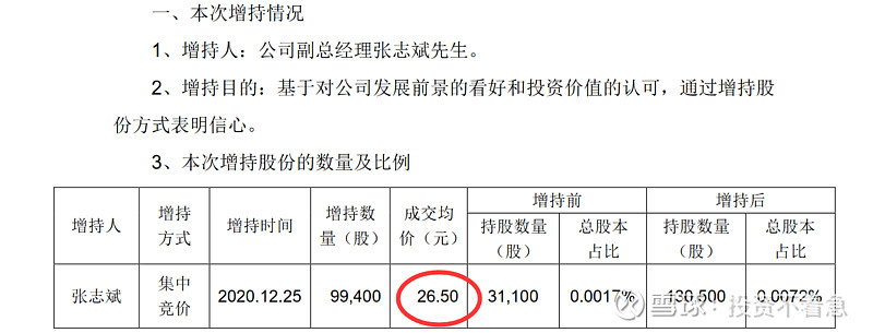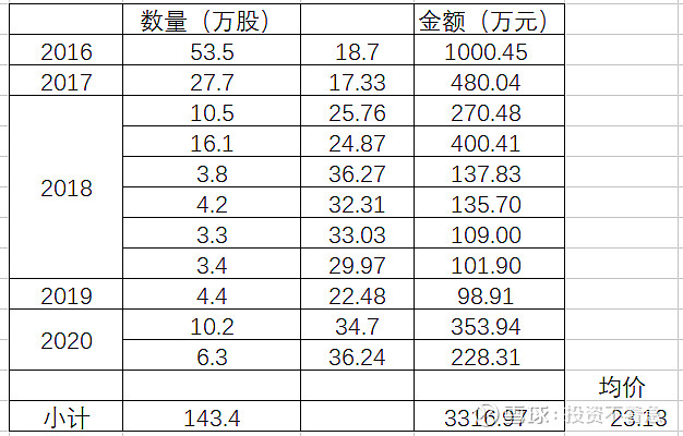 乐普医疗(300003):每股净资产 4.19元,每股净利润 0.68元,历史净利润年均增长 27.9%,预估未来三年净利润年均增长 34.18%,更多数据见:乐普医疗300003核心经营数据 乐普医疗的当前股价 35.77元,市盈率 37.77,未来三年的估值假设和预期收益率如下:15倍PE,预期收益率 -30.71%;20倍PE,预期收益率 -7.61%;25倍PE,预期收益率 15.49%;30倍PE,预期收益率 38.59%。 为什么今天要单独写一篇文章,讲一下乐普医疗管理层的增持历史呢?因为我发现自2014年以来,乐普医疗的主要管理层出现了一路增持的现象,且没有任何减持。这在A股上至少目前我还没有发现第2家公司,如果大家能够找出来,也欢迎分享留言。如果管理层都这样大规模的增持,那只能说明一个问题,管理层认为目前的公司价值至少是合理,甚至是低估的。或者说管理层对公司未来很长一段时间的情况充满信心。在这个过程中,只有中船在持续的减持,我认为这跟他想退出这个公司有关系,或者将初始的投资进行变现,毕竟他也不是搞医疗的,未必愿意在这里一直呆着,挣的也不少了。 为什么我要从2014年开始算呢?因为2014年以后,新的控制权开始逐渐转移到以蒲忠杰为核心的管理层。那下面我就详细梳理一下,自2014年以来每一次的增持情况和价格。 2020年12月25日,乐普医疗副总经理张志斌,通过集中竞价增持9.9万股,成交价26.5元。 2020年11月25日,乐普医疗副总经理及财务总监王勇女士,通过集中竞价增持15.3万股,成交价28.78元。 2020年11月11日(不知道这个日子是蒲总专门挑的留着纪念的,哈哈),乐普医疗董事长蒲忠杰先生通过集中竞价增持105万股,成交均价29.04元。 2020年5月27日乐普医疗副总经理,董事会秘书郭同军先生,通过集中竞价增持6.3万股,成交均价36.24元。 2020年2月28日乐普医疗副总经理及董事会秘书郭同军先生,通过集中竞价增持10.2万股,成交均价34.7元。 2019年6月3日,乐普医疗副总经理及董事会秘书郭同军先生通过集中竞价增持4.4万股,成交均价22.48。 2018年12月11日,公司副总经理李永辉先生通过集中竞价增持2.1万股,成交均价24.58元。 2018年8月20公司副总经理,董事会秘书郭同军先生通过集中竞价增持3.4万股,成交均价29.97元。 2018年8月15日乐普医疗副总经理,董事会秘书郭同军先生,通过集中竞价增持3.3万股,成交均价33.03元。 2018年6月20日,乐普医疗副总经理董事会秘书郭同军先生,通过集中竞价增持4.2万股,成交均价32.31元。 2018年6月4日乐普医疗副总经理兼董事会秘书郭同军先生和副总经理魏占江先生分别增持3.8万股和4.1万股增持,均价大约26.2元。 2018年2月6日乐普医疗副总经理兼董事会秘书郭同军先生,通过集中竞价增持16.1万股,成交均价24.87元。 2018年2月1日,乐普医疗副总经理兼董事会秘书郭同军先生,通过集中竞价增持10.5万股,成交均价25.76元。 2017年7月26日,公司副总经理郭同军先生通过集中竞价增持9万股,成交均价19.98元。 2017年5月4日公司,董事长蒲忠杰先生通过集中竞价增持95.5万股成交,均价18.4元。 2017年2月28日,公司董事长蒲忠杰先生通过集中竞价增持57.5万股,成交均价16.98元。这一天增持了两次,另一次的增持数量是59万股,成交均价为16.96元。 2017年1月12日,乐普医疗副总经理郭同军先生,通过集中竞价增持27.7万股成交均价17.33元。 2016年12月12日,(这里又整一个双12,跟2020年的双11有点呼应啊,我不得不怀疑蒲总喜欢双数了~),乐普医疗董事长蒲忠杰先生,通过集中竞价增持62万股,成交均价18.02元。 2016年11月29日,乐普医疗副总经理郭同军先生,通过集中竞价增持53.5万股,成交均价18.7元。 2015年7月2日,乐普医疗董事长蒲忠杰先生通过其控制的北京厚德一名投资管理有限公司,以集中竞价方式增持60万股,成交均价36.7元。 2014年6月9日,乐普医疗董事长蒲忠杰先生通过资管计划受让725所4,530万股,交易价格16.64元。 到这里我总结出来一张非常重要的标识图,希望大家认真读图,你会发现一些事情。在下面这张图里,我把2014年以来乐普管理层的每次增持的时间用向上的红箭头标出来,做到一张图上。该图使用的是前复权数据,所以已经考虑了分红等因素。 下面我再在这个图上画一个线。 这根线所代表的价格就是当前的成交价27.7元左右,有没有发现最近四年以来管理层增持的价格中枢就是这个价格呢?请大家注意,这些人不是在炒股票哦,因为到目前为止没有任何人减持公司的股票。 同时在乐普的2019年年报中,在员工持股计划中披露,2018年10月份的员工持股计划买入均价为28.86元,这个价格也比现在的价格要贵。 如果你相信乐普医疗是一个长期能够成长的公司,那么在管理层持续增持的价格区间内,一定是谈不上高估的。估值这个东西门派比较多,说实话能估得准的人也特别少,就连巴菲特,芒格这些大师们也从来没有说能对哪个公司进行精确估值。但是他们的确说过,管理层增持或者公司回购是一个好现象。 那么我们在乐普医疗看到的事情就是好现象,还有什么比管理层持续增持自家股票更让人放心的呢?有人说这是管理层,为了稳定股价。那你见过管理层为了稳定股价连续4年买入的吗? 我们再看看2019年披露的管理层的薪酬和这个持股计划做一个对比,我想更有意思。 在总结以上持股的过程中,我发现郭同军同志是除董事长以外连续增持次数最多的,2016年53.5万股,均价18.7元;2017年27.7万股,均价17.33元,2017年9万股,均价19.98元,2018年10.5