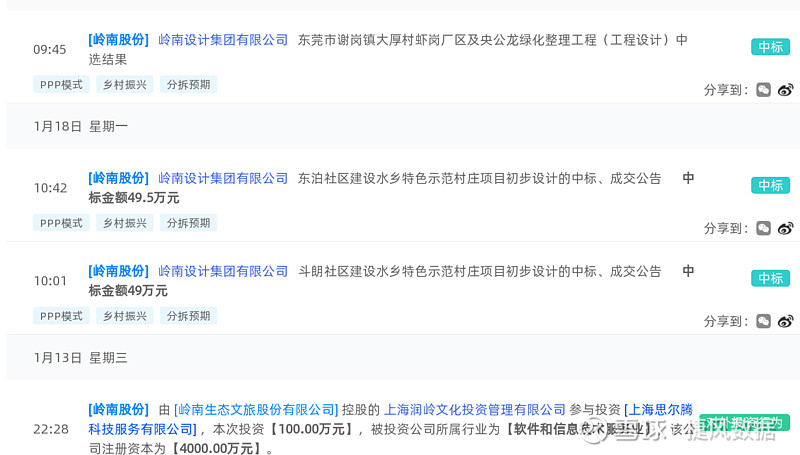 岭南股份(002717):每股净资产 3.01元,每股净利润 0.77元,历史净利润年均增长 42.85%,预估未来三年净利润年均增长 -7.01%,更多数据见:岭南股份002717核心经营数据 岭南股份的当前股价 4.5元,市盈率 13.51,未来三年的估值假设和预期收益率如下:15倍PE,预期收益率 37.59%;20倍PE,预期收益率 83.45%;25倍PE,预期收益率 129.32%;30倍PE,预期收益率 175.18%。 捷风数据2021-01-19根据公开信息搜集发现:【岭南股份,002717】的岭南设计集团有限公司《东莞市谢岗镇大厚村虾岗厂区及央公龙绿化整理工程(工程设计)中选结果》。 以下是【岭南股份,002717】信息摘要的截图: 数据来源:捷风数据_jiefengnews 接下来,我们小编整理了近期【岭南股份,002717】的部分经营动态如下,各位大佬可以参考: 1、捷风数据于2021-01-19根据公开信息搜集发现:【岭南股份,002717】的岭南设计集团有限公司《东莞市谢岗镇大厚村虾岗厂区及央公龙绿化整理工程(工程设计)中选结果》; 2、捷风数据于2021-01-18根据公开信息搜集发现:【岭南股份,002717】的岭南设计集团有限公司《东泊社区建设水乡特色示范村庄项目初步设计的中标、成交公告》,公示金额为49.5万元; 3、捷风数据于2021-01-18根据公开信息搜集发现:【岭南股份,002717】的岭南设计集团有限公司《斗朗社区建设水乡特色示范村庄项目初步设计的中标、成交公告》,公示金额为49.0万元; 4、捷风数据于2021-01-13根据公开信息搜集发现:【岭南股份,002717】的岭南设计集团有限公司《资格预审结果公示(2)》; 5、捷风数据于2021-01-11根据公开信息搜集发现:【岭南股份,002717】的上海恒润数字科技集团股份有限公司《(非重点)浙江广电象山影视基地三期(中国海影城)新建项目数字体验馆系统集成总承包项目数字体验馆系统集成总承包项目[Y3300000007000127020001]中标结果公告》; 6、捷风数据于2021-01-08根据公开信息搜集发现:【岭南股份,002717】的湖南本农环境科技有限公司《平江县三阳乡万古村湛坳(江东水库上游)历史遗留重金属废渣整治(EPC)项目中标候选人公示》。 以下是【岭南股份,002717】部分经营动态的截图: 数据来源:捷风数据_jiefengnews 了解更多【岭南股份,002717】的信息,请关注我们捷风数据的动态。 作者:捷风数据_jiefengnews $岭南股份(sz002717)$ 作者:捷风数据原文链接:https://xueqiu.com/2536037617/169165109 转载请注明:www.51xianjinliu.com » 岭南股份东莞市谢岗镇大厚村虾岗厂区及央公龙绿化整理工程工程设计中选结果 喜欢 (0)or分享 (0)
