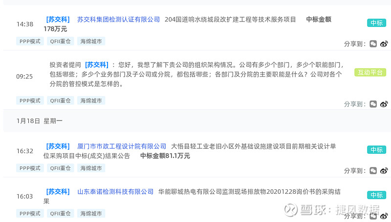 苏交科(300284):每股净资产 4.66元,每股净利润 0.77元,历史净利润年均增长 24.23%,预估未来三年净利润年均增长 18.31%,更多数据见:苏交科300284核心经营数据 苏交科的当前股价 9.76元,市盈率 13.93,未来三年的估值假设和预期收益率如下:15倍PE,预期收益率 63.31%;20倍PE,预期收益率 117.75%;25倍PE,预期收益率 172.18%;30倍PE,预期收益率 226.62%。 捷风数据2021-01-19根据公开信息搜集发现:【苏交科,300284】的苏交科集团检测认证有限公司《204国道响水绕城段改扩建工程等技术服务项目》,公示金额为178.0万元,占上一年营业收入的0.03%。 以下是【苏交科,300284】信息摘要的截图: 数据来源:捷风数据_jiefengnews 接下来,我们小编整理了近期【苏交科,300284】的部分经营动态如下,各位大佬可以参考: 1、捷风数据于2021-01-19根据公开信息搜集发现:【苏交科,300284】的石家庄市政设计研究院有限责任公司《滦南县老城区基础设施提升改造工程勘察设计(项目代码:2011-130224-89-01-110655)中标候选人公示》,公示金额为153.0万元; 2、捷风数据于2021-01-19根据公开信息搜集发现:【苏交科,300284】的苏交科集团检测认证有限公司《204国道响水绕城段改扩建工程等技术服务项目》,公示金额为178.0万元; 3、捷风数据于2021-01-18根据公开信息搜集发现:【苏交科,300284】的厦门市市政工程设计院有限公司《大悟县轻工业老旧小区外基础设施建设项目前期相关设计单位采购项目中标(成交)结果公告》,公示金额为81.1万元; 4、捷风数据于2021-01-18根据公开信息搜集发现:【苏交科,300284】的山东泰诺检测科技有限公司《华能聊城热电有限公司监测现场排放物20201228询价书的采购结果》; 5、捷风数据于2021-01-18根据公开信息搜集发现:【苏交科,300284】的山东泰诺检测科技有限公司《华能聊城热电有限公司环境检测技术服务20201229询价书的采购结果》; 6、捷风数据于2021-01-18根据公开信息搜集发现:【苏交科,300284】的中山市水利水电勘测设计咨询有限公司《嵩山路、海西三路(东岳西路至铁橛山路)工程竣工测量及数据入库竞价结果公告》,公示金额为5.98万元。 以下是【苏交科,300284】部分经营动态的截图: 数据来源:捷风数据_jiefengnews 了解更多【苏交科,300284】的信息,请关注我们捷风数据的动态。 作者:捷风数据_jiefengnews $苏交科(sz300284)$ 作者:捷风数据原文链接:https://xueqiu.com/2536037617/169225835 转载请注明:www.51xianjinliu.com » 苏交科204国道响水绕城段改扩建工程等技术服务项目 喜欢 (0)or分享 (0)