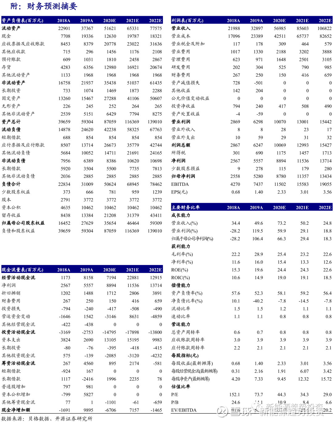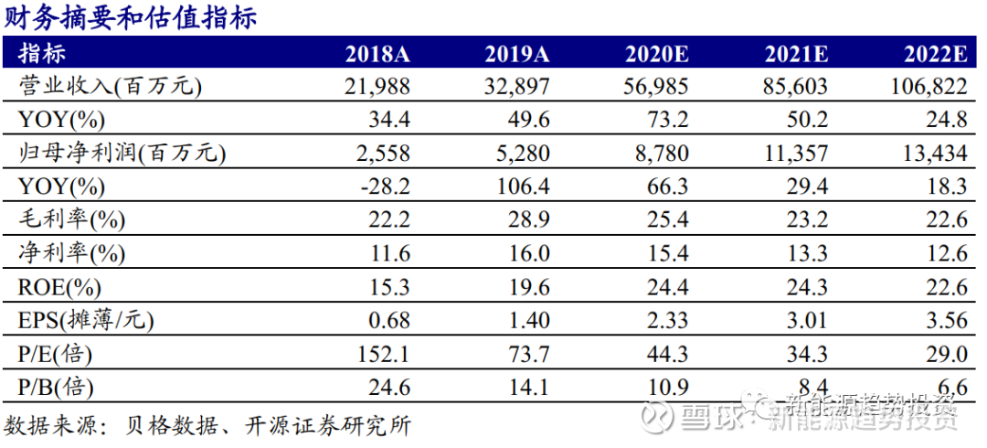 隆基股份(601012):每股净资产 6.84元,每股净利润 0.93元,历史净利润年均增长 37.79%,预估未来三年净利润年均增长 45.29%,更多数据见:隆基股份601012核心经营数据 隆基股份的当前股价 24.52元,市盈率 21.26,未来三年的估值假设和预期收益率如下:15倍PE,预期收益率 74.49%;20倍PE,预期收益率 132.65%;25倍PE,预期收益率 190.81%;30倍PE,预期收益率 248.97%。 核心观点 加快高效电池布局,隆基再投15GW电池产能,实现三环节全领先。 2021年1月18日,隆基股份控股子公司与陕西省西咸新区签订合作协议:隆基股份将投建15GW电池项目,投资额约80亿元,该产能计划将于2022年投产。我们估计该电池路线为N型高效电池,龙头企业加快高效电池扩产,占据下一有利地位。目前电池环节迎来技术变革,HJT及TOPcon电池可以达到23.5%~24%的转化效率,虽然PERC电池依然最具备性价比,但终究将被高效电池替代。隆基股份作为组件硅片双龙头,紧紧抓住电池变革机遇,实现全产业链领先:硅片成本领先+电池技术领先+组件规模领先。因公司在光伏产业强大的综合竞争力,我们上调盈利预测,预计公司2020~2022年EPS为2.33(+0.20)、3.01(+0.17)、3.56(+0.20)元,归母净利润为87.8(+7.6)、113.6(+6.3)、134.3(+7.7)亿元,对应当前股价的PE为44.3、34.3、29.0倍,维持“买入”评级。 光伏发展成本导向,一体化战略方向明确。 无论效率提升或者成本优化,降本是光伏发展长期目标,目前各厂商纷纷加快一体化产业布局,追求多环节自产自供。隆基股份在硅片和组件端取得双龙头地位优势后,加快电池产能配套,实现全硅片-电池-组件全产业链一体化。且公司在组件和硅片取得优势竞争地位的情况下,电池扩产实现自供难度更低,龙头一体化优势将快速显现。 平价周期起点,单晶王者领军迈入新时代。 为响应“3060”号召,近期各省市发布新能源“十四五”规划,相比于“十三五”目标,多地区提出翻倍目标,且以央企为主的新能源建设主体积极响应,对新能源发展做出积极部署。叠加欧美市场政策刺激,全球光伏朝向质量并重方向发展,龙头稳健的经营管理模式、精耕细作的技术沉淀以及长期积累的优秀品牌口碑,成为隆基股份最强的竞争壁垒,我们持续看好隆基股份的卓越竞争力,继续推荐。 风险 提示 光伏装机量不及预期,原材料价格波动超预期,技术推进不及预期。 此公众号为开源证券新能源研究团队授权稿件,如需转载,请注明出处。 报告发布日期:2021年1月18日(原报告名称:《加速高效电池扩产,强化一体化竞争优势》) 隆基股份相关报告往期链接 隆基股份(601012.SH):高瓴资本受让6%股份,龙头领军进入平价时代【开源新能源】 开源新能源丨隆基股份(601012.SH):光伏王者延续扩展趋势,涨价压力下凸显核心竞争力 隆基股份(601012.SH):与通威股份强强联手,保供应促成长,龙头再出发【开源新能源】 免 责 声 明 开源证券股份有限公司是经中国证监会批准设立的证券经营机构,由陕西开源证券经纪有限责任公司变更延续的专业证券公司,已具备证券投资咨询业务资格。 本报告仅供开源证券股份有限公司(以下简称“本公司”)的机构或个人客户(以下简称“客户”)使用。本公司不会因接收人收到本报告而视其为客户。本报告是发送给开源证券客户的,属于机密材料,只有开源证券客户才能参考或使用,如接收人并非开源证券客户,请及时退回并删除。 本报告是基于本公司认为可靠的已公开信息,但本公司不保证该等信息的准确性或完整性。本报告所载的资料、工具、意见及推测只提供给客户作参考之用,并非作为或被视为出售或购买证券或其他金融工具的邀请或向人做出邀请。本报告所载的资料、意见及推测仅反映本公司于发布本报告当日的判断,本报告所指的证券或投资标的的价格、价值及投资收入可能会波动。在不同时期,本公司可发出与本报告所载资料、意见及推测不一致的报告。客户应当考虑到本公司可能存在可能影响本报告客观性的利益冲突,不应视本报告为做出投资决策的唯一因素。本报告中所指的投资及服务可能不适合个别客户,不构成客户私人咨询建议。本公司未确保本报告充分考虑到个别客户特殊的投资目标、财务状况或需要。本公司建议客户应考虑本报告的任何意见或建议是否符合其特定状况,以及(若有必要)咨询独立投资顾问。在任何情况下,本报告中的信息或所表述的意见并不构成对任何人的投资建议。在任何情况下,本公司不对任何人因使用本报告中的任何内容所引致的任何损失负任何责任。若本报告的接收人非本公司的客户,应在基于本报告做出任何投资决定或就本报告要求任何解释前咨询独立投资顾问。 本报告可能附带其它网站的地址或超级链接,对于可能涉及的开源证券网站以外的地址或超级链接,开源证券不对其内容负责。本报告提供这些地址或超级链接的目的纯粹是为了客户使用方便,链接网站的内容不构成本报告的任何部分,客户需自行承担浏览这些网站的费用或风险。 开源证券在法律允许的情况下可参与、投资或持有本报告涉及的证券或进行证券交易,或向本报告涉及的公司提供或争取提供包括投资银行业务在内的服务或业务支持。开源证券可能与本报告涉及的公司之间存在业务关系,并无需事先或在获得业务关系后通知客户。 本报告的版权归本公司所有。本公司对本报告保留一切权利。除非