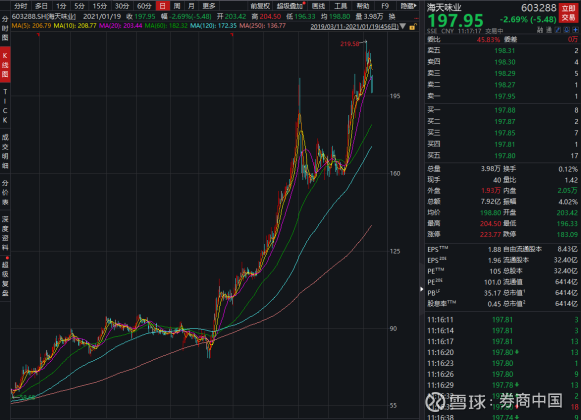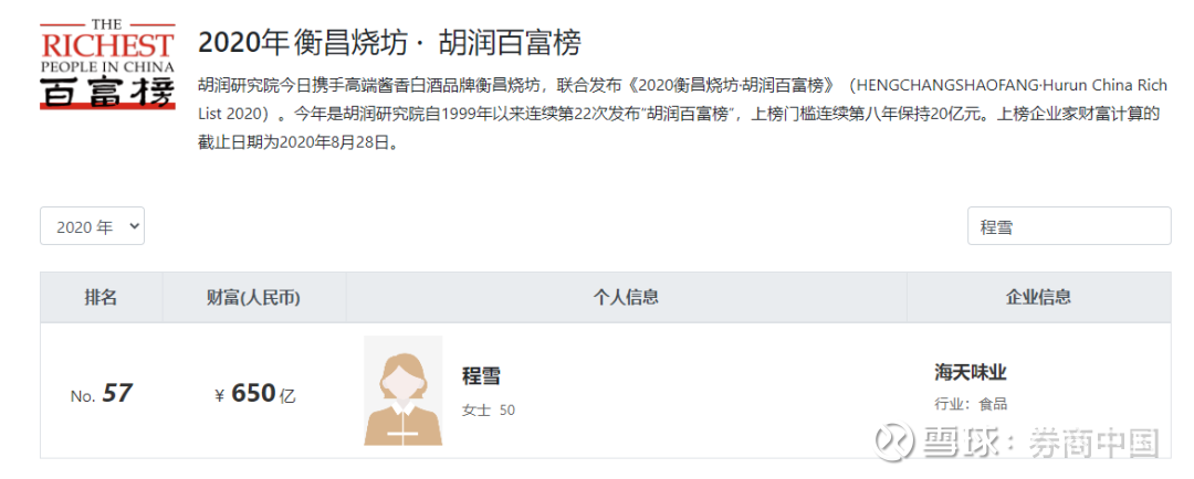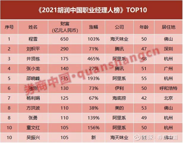 海天味业(603288):每股净资产 5.58元,每股净利润 1.62元,历史净利润年均增长 25.56%,预估未来三年净利润年均增长 19.32%,更多数据见:海天味业603288核心经营数据 海天味业的当前股价 94.21元,市盈率 50.19,未来三年的估值假设和预期收益率如下:15倍PE,预期收益率 -56.18%;20倍PE,预期收益率 -41.58%;25倍PE,预期收益率 -26.97%;30倍PE,预期收益率 -12.36%。 在刚刚过去不久的2020年,“打工人”成为年度热词刷爆全网。比起白手起家的创业老板,“打工人”又该如何实现财富自由? 1月19日,胡润研究院发布《2021胡润中国职业经理人榜》,列出中国前50名最成功的职业经理人。其中,海天味业50岁的程雪以650亿元财富成为“中国职业经理人首富”;来自腾讯的刘炽平和阿里系的井贤栋则分别以290亿元和175亿元排名第二、第三位。 哪家公司的“造富神话”最为成功?答案是阿里系。虽然蚂蚁集团上市搁浅,但在此次51(5人并列第47位)人的榜单中,阿里系共有16人上榜,占比达到31.37%。另外,海天味业贡献成功经理人的数量也多达6人。 胡润百富董事长兼首席调研官胡润表示,从职业经理人榜可以发现几条成功之路:比较常见的是直接进入早期创业团队,跟着团队一步步做大;或者先到成熟的世界500强企业积累经验,合适的时候再加入快速成长的企业。“上我们这个职业经理人榜必须要靠股权价值,不能只靠收入,所以高收入的金领几乎不可能上榜。” 2021年刚刚开局,加油吧,打工人! 海天味业程雪成“职业经理人首富” 在“自主创业+融资+IPO”的标准造富路径之外,职业经理人能否通过“打工”实现阶级晋升?答案显然是肯定的。 1月19日,胡润研究院发布《2021胡润中国职业经理人榜》,列出中国前50名最成功的职业经理人。其中,海天味业50岁的程雪以650亿元财富成为“中国职业经理人首富”,也是前十名榜单中三位女士中的一位。 回顾2020年,在大消费板块风生水起之际,素有“酱油界的茅台”之名的海天味业股价也一路飙升。从2020年3月76.16元/股的低价不断走高,在当年9月突破200元/股。1月8日,海天味业股价更是达到219.58元/股的高点。 作为海天味业的副董事长、常务副总裁,以及公司第四大股东,程雪的对外公开信息并不多,相当低调。据海天味业披露信息,程雪早在1997年就加入公司,历任企业策划总监、副总裁、董事等职。 2015年,程雪在《福布斯》杂志发布的亚洲最具影响力女性商界领袖50人榜单中排名第四。在《财富》杂志“2019年中国最具影响力的25位商界女性”中,程雪同样榜上有名。在此前胡润研究院公布的2020胡润百富榜中,程雪排名第57位。 在2020年12月底,海天味业发布一致行动人变更暨公司实际控制人变更的公告,程雪与庞康、陈军阳、吴振兴、黄文彪五人签署了《一致行动协议》,五人组共同成为海天味业的实际控制人。公告显示,程雪持有海天味业共1.03亿股,持股比例3.172%。按海天味业2020年12月31日的交易均价200.4元/股计算,该部分股份市值即已超过200亿元。 阿里系占比超三成 除了程雪夺得2020年“打工皇帝”之位外,胡润研究院这份职业经理人榜单中还有哪些“大佬”现身? 报告显示,目前中国有9亿16至59周岁的劳动年龄人口。登上今年胡润中国职业经理人榜的门槛为40亿元,其中有11位女性,占比超过1/5;平均年龄50岁,平均在目前公司工作17年。 单就前十名榜单来看,其门槛为105亿元,最年轻的为海底捞总经理杨利娟,现年42岁;55岁的邵晓峰最为年长,其余上榜人士的年龄集中在47-53岁之间。 除了程雪之外,腾讯首席战略投资官刘炽平和蚂蚁集团董事长井贤栋则分别以290亿元和175亿元排名第二、第三位。“微信之父”张小龙排在第4位,财富值为140亿元;排名第五的邵晓峰同样来自阿里系,他2005年加入阿里巴巴任集团网络安全部总监,后调任集团秘书长职务。 胡润指出,中国女职业经理人很成功,前50名中国职业经理人中,五分之一都是女性,高于胡润百富榜上白手起家女企业家15%的比例,包括第一名海天味业的程雪和前十名中的另两位:海底捞杨利娟和阿里系童文红。 实际上,在程雪之外,另两位前十女性的传记颇为传奇。海底捞杨利娟“从17岁女服务员到首席运营官”的传奇生涯,已被多次纳入经典商业案例。童文红则是菜鸟网络董事长,与杨利娟同样有着基层起点——阿里的行政前台,被称为阿里“最励志”的合伙人。 不难发现,在前十榜单中,阿里系独占四席。而在一共51人的榜单中(5人并列第47位),阿里系共有16人上榜,独占三成以上。虽然此次蚂蚁集团上市受阻,但阿里的造富效应仍不可小觑。此外,海天味业也为榜单贡献了6名“打工皇帝”。 股权价值成就最强“打工人” 此次胡润研究院公布的这份职业经理人榜单,不仅对“打工人”们起到激励作用,对企业的“掌门人”也具有重要意义。 胡润百富董事长兼首席调研官胡润表示:“我们这份榜单主要是给中国的职业经理人和企业掌门人看,希望能让职业经理人了解,为企业创造价值能为自己带来财富,让企业掌门人了解,做好企业激励机制能为企业创造更大的价值。这两方面都做得好,就是我们榜单上这50位中国最成功‘打工人’”。 具体来看,此次列入榜单的50位“打工人”分别来自24家企业,全部位列胡润中国500强,其中11家位列胡润世界500强。胡润指出,“如果企业激励机制没有做好,优秀的员工可能会像许家印当年那