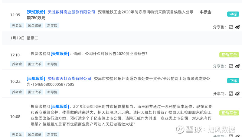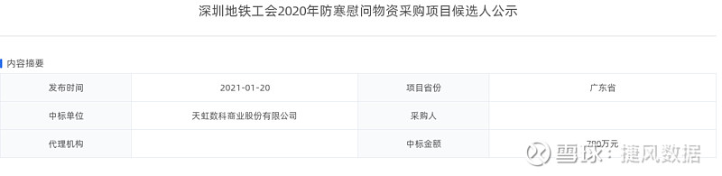 天虹股份(002419):每股净资产 5.61元,每股净利润 0.75元,历史净利润年均增长 14.97%,预估未来三年净利润年均增长 5.85%,更多数据见:天虹股份002419核心经营数据 天虹股份的当前股价 9.19元,市盈率 12.49,未来三年的估值假设和预期收益率如下:15倍PE,预期收益率 45.86%;20倍PE,预期收益率 94.48%;25倍PE,预期收益率 143.1%;30倍PE,预期收益率 191.72%。 捷风数据2021-01-20根据公开信息搜集发现:【天虹股份,002419】的天虹数科商业股份有限公司《深圳地铁工会2020年防寒慰问物资采购项目候选人公示》,公示金额为780.0万元,占上一年营业收入的0.04%。 以下是【天虹股份,002419】信息摘要的截图: 数据来源:捷风数据_jiefengnews 接下来,我们小编整理了近期【天虹股份,002419】的部分经营动态如下,各位大佬可以参考: 1、捷风数据于2021-01-20根据公开信息搜集发现:【天虹股份,002419】的天虹数科商业股份有限公司《深圳地铁工会2020年防寒慰问物资采购项目候选人公示》,公示金额为780.0万元; 2、捷风数据于2021-01-19根据公开信息搜集发现:【天虹股份,002419】的娄底市天虹百货有限公司《娄底市娄星区乐坪街道办事处关于贺卡/卡片的网上超市采购成交公告-1646868000005877605》; 3、捷风数据于2021-01-18根据公开信息搜集发现:【天虹股份,002419】的长沙市天虹百货有限公司《华融湘江银行总行第2次集采会结果公示》; 4、捷风数据于2021-01-15根据公开信息搜集发现:【天虹股份,002419】的南昌市天虹商场有限公司《江西移动省公司本部2021春节慰问品采购项目_成交候选人公示》; 5、捷风数据于2021-01-15根据公开信息搜集发现:【天虹股份,002419】的娄底市天虹百货有限公司《中共娄底市娄星区委组织部关于米类的网上超市采购成交公告-1634868000005845337》; 6、捷风数据于2021-01-14根据公开信息搜集发现:【天虹股份,002419】的株洲市天虹百货有限公司《株洲市天元区文化旅游广电体育局关于运动服饰的网上超市采购成交公告-1963085000005825057》。 以下是【天虹股份,002419】部分经营动态的截图: 数据来源:捷风数据_jiefengnews 了解更多【天虹股份,002419】的信息,请关注我们捷风数据的动态。 作者:捷风数据_jiefengnews $天虹股份(sz002419)$ 作者:捷风数据原文链接:https://xueqiu.com/2536037617/169306676 转载请注明:www.51xianjinliu.com » 天虹股份深圳地铁工会2020年防寒慰问物资采购项目候选人公示 喜欢 (0)or分享 (0)