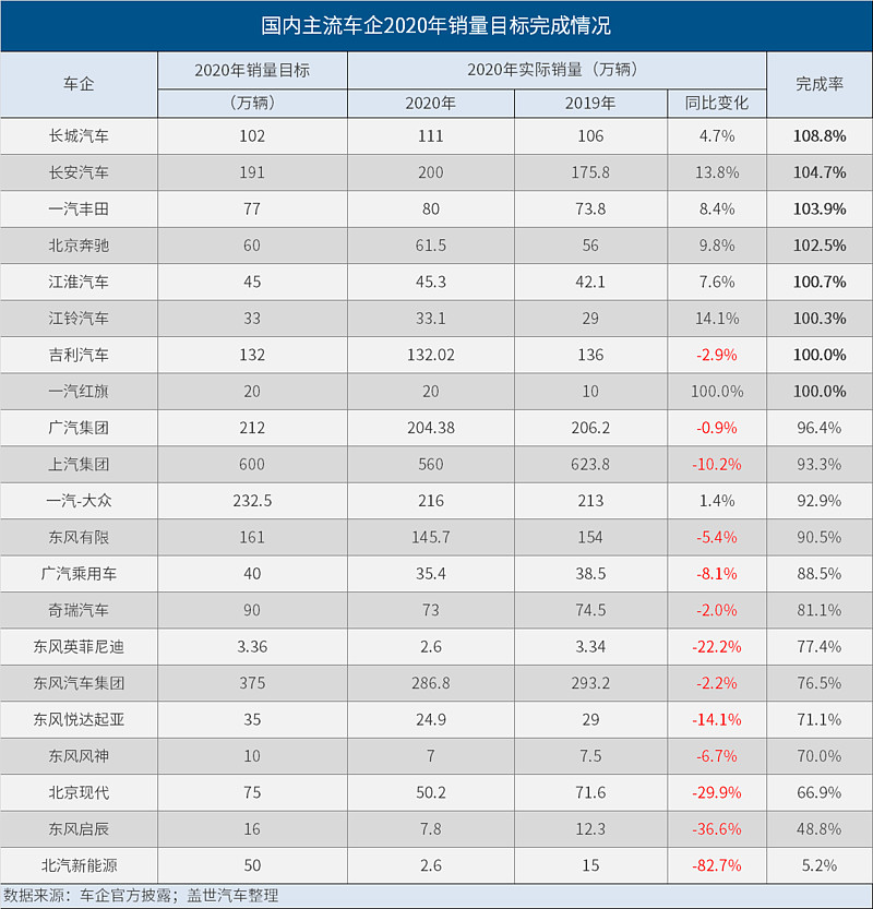 长安汽车(000625):每股净资产 9.07元,每股净利润 0.14元,历史净利润年均增长 9.2%,预估未来三年净利润年均增长 99.66%,更多数据见:长安汽车000625核心经营数据 长安汽车的当前股价 10.26元,市盈率 -15.67,未来三年的估值假设和预期收益率如下:15倍PE,预期收益率 62.91%;20倍PE,预期收益率 117.21%;25倍PE,预期收益率 171.52%;30倍PE,预期收益率 225.82%。 长城汽车(601633):每股净资产 5.81元,每股净利润 0.57元,历史净利润年均增长 20.62%,预估未来三年净利润年均增长 9.11%,更多数据见:长城汽车601633核心经营数据 长城汽车的当前股价 8.26元,市盈率 17.96,未来三年的估值假设和预期收益率如下:15倍PE,预期收益率 34.46%;20倍PE,预期收益率 79.28%;25倍PE,预期收益率 124.09%;30倍PE,预期收益率 168.91%。 2020年各大车企销量目标完成情况如何?2021年他们又有怎样的目标和规划呢? 回首2020年,在新冠疫情突发和整体经济下行的大环境下,我国汽车市场全年以产销2522.5万辆和2531.1万辆,同比下降2.0%和1.9%的成绩告终,该降幅较2019年分别收窄5.5和6.3个百分点,整体表现可谓大大好于预期。 在整体车市回暖的情势下,那些在年初设定销量目标的车企,最终的完成情况怎么样呢?盖世汽车通过对已公开全年销量成绩的20多家车企进行梳理发现:2020年,完成或超额完成全年销量目标的企业有8家,完成率在80%之上的有6家,完成率低于80%的企业有5家,其中完成率最低者仅有5.2%。 8家车企完成或超额完成目标,最高者长城汽车(601633)达108.8% 统计数据显示, $长城汽车(SH601633)$ 、$长安汽车(SZ000625)$ 、一汽丰田、北京奔驰、江淮汽车(600418)以及$江铃汽车(SZ000550)$ 均实现了超额完成,吉利汽车(00175)和一汽红旗则刚刚好完成。 数据显示,长城汽车(601633)2020年累计销量111万辆,较2019年的106万辆增长4.7%,超额完成其102万辆年度销量目标,达到108.8%,成为计入统计中完成率最高的车企。不过,需要指出的是,2020年3月,在经济下行压力叠加新冠疫情的影响下,长城汽车(601633)将2020年的销量目标从此前制定的111万辆调整至102万辆,同时净利润从此前的47亿元下调至40.5亿元,但2021年及2022年考核目标未进行调整。 与长城汽车(601633)下调销量目标不同,长安汽车(000625)2020年的经营目标是力争实现汽车产销超191万辆,相比2019年销量增加8%。值得欣慰的是,在自主和合资版块的共同发力下,长安汽车(000625)超额完成了这一目标。数据显示,2020年,长安汽车(000625)集团共计销售新车200万辆,相较于2019年同期的175.8万辆,增长13.8%。其中,长安汽车(000625)系中国品牌汽车2020年总销量为150.4万辆,同比增长12.9%。合资板块中,长安福特2020年累计销售新车25.3万辆,同比增长37.7%;长安马自达总销量为13.7万辆,同比增长2.8%。 一汽丰田2020年全年累计销量达80万辆,同比增长8.4%,超额完成2020年77万辆的销量目标,目标达成率为103.9%。一汽丰田汽车销售有限公司党委书记、总经理胡绍航曾表示,到2022年,一汽丰田将成为年销百万辆、客户超千万、营业收入过千亿的汽车企业。为了实现这一目标,尽快推出新的车型,进一步完善目前的产品线成为一汽丰田的重要工作。 2020年的疫情可以说没有影响中国豪华车市场的销量表现,北京奔驰就是典型代表。2020年,北京奔驰累计销量达61.5万辆,同比增长9.8%,超额完成60万辆年度销量目标,完成率为102.5%。值得一提的是,目前北京奔驰8款国产乘用车型为奔驰品牌在华销量贡献了超过3/4份额。为进一步提升本土研发生产能力,2021年新的戴姆勒中国研发技术中心计划正式投入运营。 江淮汽车(600418)2020年全年累计销量为45.3万辆,同比增长7.6%,超额完成年初设定的45万辆销量目标。从细分品类看,江淮商用车2020年累计销售29.8万辆,同比增长10.58%;其中,轻型货车2020年累计销售21.3万辆,同比增长15.6%。重型货车2020年累计销售5.4万辆,同比增长41.88%,继续保持高速扩张态势。乘用车方面,2020年累计销量15.6万辆,同比下滑4.19%。由此来看,占集团销量份额近2/3的商用车板块是江淮汽车(600418)全年销量实现同比增长同时顺利完成全年销量目标的重要砝码,而江淮乘用车板块显然需要更多努力。 与江淮汽车(600418)一样,江铃汽车(000550)2020年也依靠着商用车板块实现了同比14.1%的销量增长,全年新车销量33.1万辆,超额完成了其33万辆年销目标。产销数据显示,江铃汽车(000550)2020年轻型客车与卡车的销量占比超过五成,SUV成为唯一下滑的板块。江铃汽车(000550)总裁王文涛强调称,“江铃汽车(000550)一直以商用车业务作为立身之本,在乘用车销售网络和能力方面还很欠缺。为了弥补这一短板,江铃汽车(000550)正在积极建设一个乘用车销售专业团队,更深层次的帮助经销商改善销售网络,内部的话还要加强销售公司的培训升级,引进更多的人才。” 除了上述6家超额完成年度销量目标的车企外,吉利汽车(00175)和一汽红旗则刚好完成各自设定的目标。2020年,吉利汽车(00175)累计销量132万辆,刚好达到其调整后132万辆的销量目标(调整前为141万辆)。据悉,2021年,吉利汽车(00175)销量目标为153万辆,同比增长16%。中国一汽在2020年12月25日表示,一汽红旗在提前11天完成20万产量后,销量也提前一周达成年度20万销量目标,同比增长100%。据了解,一汽红旗在2018年突破3万辆,2019年突破10万辆,2020年销量翻了一倍。2021年,一汽红旗将挑战年销量40万辆,而这本是一汽红旗2022年要达成的销量目标。 13家车