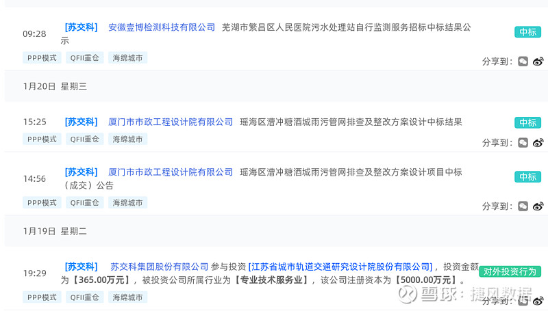 苏交科(300284):每股净资产 4.66元,每股净利润 0.77元,历史净利润年均增长 24.23%,预估未来三年净利润年均增长 18.31%,更多数据见:苏交科300284核心经营数据 苏交科的当前股价 9.76元,市盈率 13.93,未来三年的估值假设和预期收益率如下:15倍PE,预期收益率 63.31%;20倍PE,预期收益率 117.75%;25倍PE,预期收益率 172.18%;30倍PE,预期收益率 226.62%。 捷风数据2021-01-21根据公开信息搜集发现:【苏交科,300284】的安徽壹博检测科技有限公司《芜湖市繁昌区人民医院污水处理站自行监测服务招标中标结果公示》。 以下是【苏交科,300284】信息摘要的截图: 数据来源:捷风数据_jiefengnews 接下来,我们小编整理了近期【苏交科,300284】的部分经营动态如下,各位大佬可以参考: 1、捷风数据于2021-01-21根据公开信息搜集发现:【苏交科,300284】的安徽壹博检测科技有限公司《芜湖市繁昌区人民医院污水处理站自行监测服务招标中标结果公示》; 2、捷风数据于2021-01-20根据公开信息搜集发现:【苏交科,300284】的厦门市市政工程设计院有限公司《瑶海区漕冲糖酒城雨污管网排查及整改方案设计中标结果》; 3、捷风数据于2021-01-20根据公开信息搜集发现:【苏交科,300284】的厦门市市政工程设计院有限公司《瑶海区漕冲糖酒城雨污管网排查及整改方案设计项目中标(成交)公告》; 4、捷风数据于2021-01-19根据公开信息搜集发现:【苏交科,300284】的石家庄市政设计研究院有限责任公司《滦南县老城区基础设施提升改造工程勘察设计(项目代码:2011-130224-89-01-110655)中标候选人公示》,公示金额为153.0万元; 5、捷风数据于2021-01-19根据公开信息搜集发现:【苏交科,300284】的苏交科集团检测认证有限公司《204国道响水绕城段改扩建工程等技术服务项目》,公示金额为178.0万元; 6、捷风数据于2021-01-18根据公开信息搜集发现:【苏交科,300284】的厦门市市政工程设计院有限公司《大悟县轻工业老旧小区外基础设施建设项目前期相关设计单位采购项目中标(成交)结果公告》,公示金额为81.1万元。 以下是【苏交科,300284】部分经营动态的截图: 数据来源:捷风数据_jiefengnews 了解更多【苏交科,300284】的信息,请关注我们捷风数据的动态。 作者:捷风数据_jiefengnews $苏交科(sz300284)$ 作者:捷风数据原文链接:https://xueqiu.com/2536037617/169408810 转载请注明:www.51xianjinliu.com » 苏交科芜湖市繁昌区人民医院污水处理站自行监测服务招标中标结果公示 喜欢 (0)or分享 (0)