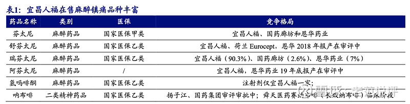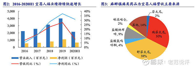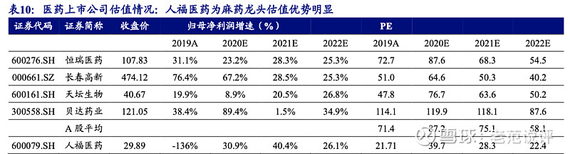 恒瑞医药(600276):每股净资产 5.23元,每股净利润 1.1元,历史净利润年均增长 30.79%,预估未来三年净利润年均增长 28.72%,更多数据见:恒瑞医药600276核心经营数据 恒瑞医药的当前股价 80.59元,市盈率 72.91,未来三年的估值假设和预期收益率如下:15倍PE,预期收益率 -63.61%;20倍PE,预期收益率 -51.48%;25倍PE,预期收益率 -39.35%;30倍PE,预期收益率 -27.22%。 人福医药(600079):每股净资产 6.93元,每股净利润 -1.81元,历史净利润年均增长 0.0%,预估未来三年净利润年均增长 0.0%,更多数据见:人福医药600079核心经营数据 人福医药的当前股价 13.02元,市盈率 -7.8,未来三年的估值假设和预期收益率如下:15倍PE,预期收益率 -308.53%;20倍PE,预期收益率 -378.03%;25倍PE,预期收益率 -447.54%;30倍PE,预期收益率 -517.05%。 一、高质量内生增长的麻醉细分领域龙头 1、资产重组深度绑定管理层利益 人福医药向宜昌人福管理层定增+配套融资购买宜昌人福管理层 13%股权。原人 福医药总裁兼宜昌人福董事长李杰担任人福医药董事长,原人福医药副总裁、葛店 人福董事长邓霞飞先生担任上市公司总裁。 目前重组后公司灵魂人物李杰持股比例约 6%(考虑配套融资后),同时任职公 司董事长,理顺股权结构,深度绑定管理层利益;麻药最大分销商国药股份,持股宜 昌人福 20%,利益高度一致。 机制理顺,多科室推广,业绩有望持续快速增长。2015-2019 年收入复合增速 17.8%,利润复合增速 21.5%,2019 年收入 40 亿元,同比增速 28.3%,净利润 11.3 亿元,同比增长 41.3%,业绩提速明显,且利润端高于收入端增速。新冠疫情短期影响手术量,宜昌人福增速有减缓,预计 2021 年将恢复。 收入构成:舒芬、瑞芬合计占比 68%,逐步替代芬太尼,为收入主要来源,氢吗 啡酮、纳布啡放量迅速,分别占比 4%、9%,预计未来占比将稳步提升。 2、潜心研发,打造国内最强精麻药平台 宜昌人福为麻醉镇痛领域龙头,公司靠芬太尼赢得生存,靠瑞芬太尼、舒芬太尼 获得发展,而氢吗啡酮和纳布啡 2017 年纳入国家医保后快速放量,为中期持续快速 增长注入动力。 研发创新是第一生产力,公司积极布局未来。麻醉镇痛领域,宜昌人福积极布局 麻醉镇痛新药、缓释片以及透皮贴剂等高端制剂,其中羟考酮缓释片、吗啡-6-葡萄 糖苷酸、舒芬太尼透皮贴等上市后有望成为销售额几个亿到十亿的大品种。 公司积极布局麻醉镇静领域,从“麻醉镇痛”向“镇痛+镇静”大麻药拓展,公 司现有麻醉镇静品种包括瑞马唑仑、咪达唑仑、右美托咪定等。2020 年 7 月,宜昌 人福与全球同步的 1 类新药——注射用苯磺酸瑞马唑仑国内获批上市,打破了全球 镇静药物领域将近 30 年无创新药上市的局面。 麻醉镇静研发管线丰富,其中 1 类新药磷丙泊酚报产在审评。此外,2020 年 6 月,宜昌人福与四川大学华西医院签署“超长效局麻药”专利许可与合作开发技术合 同。此次签约许可的两项专利:一种季铵盐类化合物及其制备方法与用途和一种季 铵盐类化合物及其制备方法与用途,专利排他许可费用+合作开发合同金额为 2.5 亿。 3、多科室推广&新品获批,业绩持续快速成长可期 1)、 芬太尼系列:受益 ICU 等多科室推广和手术量增加,有望持续快速增长 芬太尼系列镇痛效果是吗啡几十到上百倍,起效快、术后苏醒快以及副作用临床 最常用麻醉镇痛药物。芬太尼、阿芬太尼、舒芬太尼和瑞芬太尼由于价格和临床效果 不同,满足不同人群和不同场景临床需求。 芬太尼是最早上市的芬太尼类镇痛药,存在明显呼吸抑制作用,属于中低端麻醉 镇痛药,目前主要在二级以下医院使用。瑞芬和舒芬放量初期主要受益于对芬太尼 的替代,目前增长主要受益多科室推广和手术量的增加。瑞芬医保取消手术麻醉限 制并纳入 2018 版基药目录,瑞芬和舒芬在手术麻醉以外科室快速成长。 2)、 氢吗啡酮:非手术科室镇痛潜力品种,替代吗啡 氢吗啡酮为宜昌人福独家品种,2012 年获批,主要在疼痛科和肿瘤科,与芬太 尼系列不构成竞争。未来市场主要替代吗啡,相比吗啡,镇痛效果好,副作用小,有 望逐步替代吗啡。2016 年氢吗啡酮全球销售额约 2 亿美元,美国主要用在难治癌症 疼痛。国内癌痛病人主要以口服吗啡治疗,但容易引发便秘,对晚期癌症患者带来极 大不便。氢吗啡酮为注射剂,无明显副作用,国内用在癌痛领域刚刚起步,有望逐步 改变口服镇痛的理念。 2019 年宜昌人福氢吗啡酮销售金额 1.5 亿元,同比增速 52%,2017 年进医保后 快速放量。2020 年新冠疫情影响销售,前三季度 PDB 样本医院销售额约 8000 万元, 同比增速约 12%,预计 2021 年氢吗啡酮有望重回高增长。 同等效力的氢吗啡酮单价是吗啡 6 倍左右,换算销量比例,目前氢吗啡酮用量 仅为吗啡 25%左右,且未来肿瘤镇痛理念的普及,氢吗啡酮市场存较大空间。 3)、 纳布啡:独家白处方麻醉镇痛药,市场空间超 20 亿 纳布啡为宜昌人福独家品种,2013 年获批,临床用于缓解各种疾病引起的中重 度疼痛,也可用于复合麻醉的辅助用药,2017 年纳入国家医保目录,2019 年销售额 3.7 亿元,同比增速 76%。 白处方镇痛药市场空间大,纳布啡和布托啡诺最具市场潜力。纳布啡镇痛效果接 近吗啡,且安全性高,为二类精神药品,其内脏镇痛效果好,非常适合妇产科镇痛, 在国外已经广泛用于术前镇痛和无痛分娩。 纳布啡 2017 年纳入国家医保后放量迅速,2018-2019 年销售金额分别为 2.1 亿元、3.7 