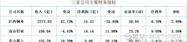 南山铝业(600219):每股净资产 3.26元,每股净利润 0.15元,历史净利润年均增长 21.58%,预估未来三年净利润年均增长 14.49%,更多数据见:南山铝业600219核心经营数据 南山铝业的当前股价 2.06元,市盈率 18.87,未来三年的估值假设和预期收益率如下:15倍PE,预期收益率 63.91%;20倍PE,预期收益率 118.55%;25倍PE,预期收益率 173.19%;30倍PE,预期收益率 227.83%。 江西铜业(600362):每股净资产 14.82元,每股净利润 0.71元,历史净利润年均增长 2.35%,预估未来三年净利润年均增长 15.2%,更多数据见:江西铜业600362核心经营数据 江西铜业的当前股价 13.16元,市盈率 18.47,未来三年的估值假设和预期收益率如下:15倍PE,预期收益率 23.72%;20倍PE,预期收益率 64.96%;25倍PE,预期收益率 106.21%;30倍PE,预期收益率 147.45%。 有色金属应用是十分广泛,不管是5G,半导体,汽车,建筑,家电,新能源,还是军事,航天,航空等都离不开重要的有色金属,这里选取了三家比较有代表性且用广泛的有色金属予以说明下有色金属板块的投资逻辑和方法,这三种有色金属是铜、铝、稀土,分别有代表性的公司是江西铜业,南山铝业,北方稀土三家公司,同时也欢迎说出你心目中哪种有色金属更重要和哪家公司更具有投资价值。 $江西铜业(SH600362)$ $南山铝业(SH600219)$ $北方稀土(SH600111)$ #股民的日常# 有色金属 从三家公司主营业务范围来看: 江西铜业,是集合铜的采选,冶炼,加工,贸易为一体的大型全产业链集团公司,公司生产的精炼铜占据全国产量的15%左右,市占率非常高。同时,江西铜业是国内铜箔最大的生产企业,江西铜业的铜箔产品广泛应用于锂电,5G等领域,江西铜业可以说是国内铜领域的绝对龙头。 江西铜业采矿区 南山铝业,高端铝制品龙头,南山铝业的产品主要应用于航空大飞机,汽车轻量化,高铁,船舶,香烟包装,医用包装等。公司稳健推进航空和汽车领域的认证和供货范围,目前对空客,波音,罗罗等航空巨头和宝马,通用,一汽大众等汽车巨头供货持续增加,这里最重要的看点在于很有可能成为中国大飞机的核心供应商。 南山铝业 北方稀土,公司是中国乃至全世界最大的稀土供应商,是中国六大稀土供应商的龙头老大。 稀土是战略性资源,稀土是磁体,电池,荧光粉,催化剂,电机必不可少的原材料,尤其是在军事装备领域,稀土是很多高端装备,尤其是导弹,航空器等战略武器的核心原材料之一。 北方稀土是稀土龙头 从三家核心数据来看Q3: 从收入和净利润来看,江西铜业收入为2272.83亿元,净利润为15.32亿元,分别同比增长32.73%和下降25.80%;南山铝业收入为156.04亿元,净利润为14.14亿元,分别同比下降4.43%和增长11.96%;北方稀土收入为155.29亿元,净利润为5.08亿元,分别同比增长10.26%和10.13%。 通过收入和净利润的对比发现,江西铜业是典型的增收不增利,收入大幅度提高的同时,利润却出现了大幅度的下降,从侧面可以看出产品结构存在巨大问题,但是其整体收入是真的高。 南山铝业表现比较出色,在收入微降的同时,净利润却实现了大幅度的提高,充分说明南山铝业的产品结构是出色的,技术含量较高,所以利润增长比较明显。 北方稀土虽然实现了收入和利润的同时增长,但是利润的增长仅为收入增长的一半,没有实现同比例增长。 所以,从收入和利润的角度来看,我更看好南山铝业未来的表现。 Q3核心数据 从表中各自的市盈率,净利率,ROE等财务管理指标来看,目前北方稀土的估值明显高估,已经达到了90多倍,南山铝业估值相对较低,只有23.20倍,江西铜业相对居中。但是,从另外两项赚钱能力指标上看,作为各自行业龙头的江西铜业,南山铝业,北方稀土赚钱能力跟国外发达国家同类企业相比,还是处于偏低水平。 数据分析 有色板块投资逻辑: 有色板块是典型的周期板块,估值整体相对较低,当经济向好时或者世界各国超发货币时都会迎来不错的投资机会,超发货币必然带来大宗商品的上涨,经济向好对有色产品需求大幅度提升,这些都是投资有色板块的理由。 铝制品 但是,需要注意的是,本轮上涨有着明显特点,那就是强者恒强,龙头不断新高,边缘不受待见,有色已经启动了一轮,现在进入到第二轮的冲高阶段,如果没有把握,不要高位接盘,等到回调再入不迟,一般一个板块的强势崛起都会有三个波次的行情,所以不用急。 稀土属于战略资源 当然,还有其他有色龙头值得关注,比如洛阳钼业,华友钴业等等,以后还会介绍,有什么不一样的观点,欢迎一起讨论。 #光伏大涨隆基股份等多股创新高# #苹果概念股大跌蓝思科技遭重挫# 作者:就是个小姐姐原文链接:https://xueqiu.com/6352552736/169541262 转载请注明:www.51xianjinliu.com » 有色金属三巨头江西铜业南山铝业北方稀土谁的潜力更大你更看好谁呢 喜欢 (0)or分享 (0)
