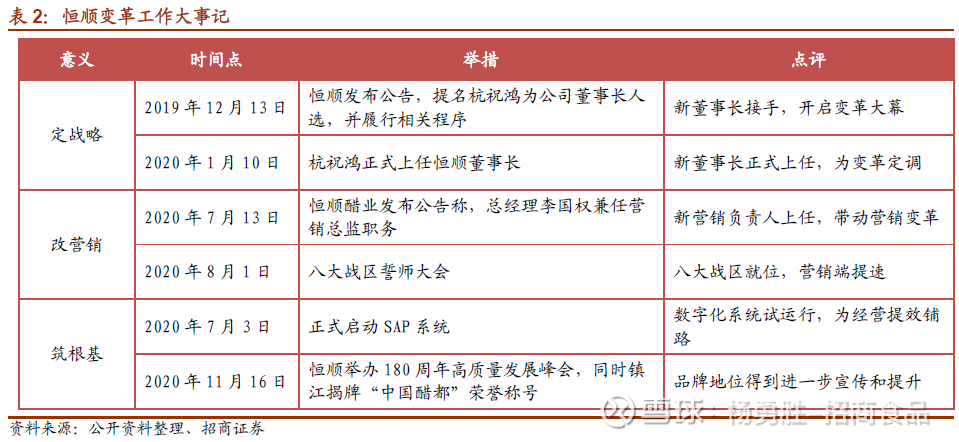 恒顺醋业(600305):每股净资产 2.8元,每股净利润 0.39元,历史净利润年均增长 20.51%,预估未来三年净利润年均增长 14.09%,更多数据见:恒顺醋业600305核心经营数据 恒顺醋业的当前股价 17.23元,市盈率 40.07,未来三年的估值假设和预期收益率如下:15倍PE,预期收益率 -49.75%;20倍PE,预期收益率 -33.0%;25倍PE,预期收益率 -16.24%;30倍PE,预期收益率 0.51%。 恒顺作为食醋龙头企业,在行业正快速发展,格局尚未成型的关键阶段,毅然主动提出变革,彰显其引领行业的决心。在过去一年中,恒顺通过战略定调、营销改制、筑建根基三方面举措,提振企业精神面貌,推动营销及渠道端动力,未来引人期待。但变革非一蹴而就,需行稳而致远,未来可展望公司在经营提效、战略推进、长效激励等方面的稳步落地。从5年周期视角看,随着变革的深入,公司收入体量有望加速增长,带动盈利能力提升,逐步消化估值。我们预计公司20-22年EPS为 0.32、0.38、0.48元,维持“强烈推荐-A”评级。 报告正文 行业赛道优质,头部竞争激烈,变革应运而生。食醋行业属于具有高壁垒,增长性稳健的优质赛道,行业长青潜力大。消费者对品牌认知性更强,产品升级为行业主要驱动力,但发展阶段仍早于酱油,需要龙头不断进行消费者教育及引领。当前竞争格局分散,头部企业机会更大。而随着各跨界调味品企业纷纷加码食醋行业,在带来行业高景气的同时,也加剧了头部企业间的竞争。龙头恒顺面对行业当前阶段下的机遇与挑战,主动开启变革,体现出其引领行业的决心。 变革元年:战略定调,营销改制,筑建根基。战略定调上,公司确立“做深醋业、做高酒业、做宽酱业”的经营战略,坚持做好主业发展。营销改制上,公司重新规划战区,打造样板市场,增加渠道把控力,提高目标与奖励,激发营销动力。筑建根基上,公司引入SAP系统,利用数字化管理系统为企业的现代化经营打好基础。同时公司强化品牌优势,加大品牌投入与建设,梳理产品矩阵,为实施大单品策略提前铺路。 变革看点:变革动力足,过程需稳健,关注费效比,期待餐渠拓展、单品策略、长效激励。当前亮点来看,公司变革决心强,执行力有所保障。同时在营销端激励加码,充分调动起内外部的积极性与战斗力。未来展望上,整体变革需每阶段稳步推进,未来仍需关注费效比的持续优化,同时期待公司餐饮渠道扩展,大单品战略落实,以及长效激励落地等方面为公司经营带来的实质性改善效果。 价值审视:收入上台阶,利润再加速。从3年变革顺利完成+2年效果显现的5年周期看:1)收入端:各级市场向上发展,成熟度逐次提升,可推算1倍以上的空间;2)利润端:公司产品结构提升将贡献毛利率提升,费用效率优化及规模效应将进一步改善净利率水平,可期待更高的利润增长空间。 投资建议:变革清晰营销提速,关注阶段性显效,看空间持续打开,维持“强烈推荐-A”评级。恒顺作为行业龙头,在关键时点主动提出变革,公司上下精神面貌显著改善,战略清晰执行力强。当前营销端改制先行,经营管理体系逐步跟进,未来在变革进程中需持续验证经营改善效果的真实体现。过去较低的净利率对公司估值有所束缚,当前变革不断推进有望加速收入空间的持续打开,提升规模效应。若变革阶段性目标顺力达成,可实现经营边际的持续改善,推进净利率稳步提升,估值水平逐步消化。我们预计公司20-22年EPS为 0.32、0.38、0.48元,维持“强烈推荐-A”评级。 风险提示:需求不及预期,内部变革不及预期。 引言 2020年1月10日,随着恒顺集团新董事长的正式上任,公司的变革大幕就此拉开,市场对这家拥有180年悠久历史的老牌醋企也增添了更多的关注与期待。我们在2018年的深度报告《厉兵秣马燎原志,百年恒顺再飘香》中,曾对当时的恒顺提出过展望,期望公司内部管理优化、渠道管控提效,提升员工与渠道的经营动力,有效提升盈利能力,实现困境下的反转,充分享受业绩弹性与龙头红利带来的双重收益。 站在当下时点,行业有了新变化,恒顺的领路人已就位,变革蓄势待发,本报告希望在恒顺变革元年收官之际,从一个新的视角来看恒顺的进阶之路。我们将从以下问题着手进行探讨: 变革元年都做了哪些? 三年变革看点在哪里? 如何审视恒顺的价值? 本篇报告中,我们将通过对恒顺本次变革的解析,以及对其未来发展空间的测算,来重新发掘这家老牌企业的新价值。 一、优质赛道,竞争加剧 过去10年食醋行业经历了快速的增长,随着餐饮消费扩容,产品功能性的开发,行业未来仍有较高的增长空间,但整体格局分散,集中度相对较低。面对格局尚未成型的优质赛道,各大调味品企业纷纷加入试图分得一杯羹,使得龙头间竞争更加激烈。我们认为恒顺在当下时点选择开启变革之路,体现出其渴望积极破局,引领行业的决心。 1.1行业发展:优质赛道高壁垒,产品升级提空间 醋生意:越陈越香,行业长青的高壁垒好生意。食醋生产属于发酵工艺,不同区域存在风味的独特性,铸就了天然的口味壁垒。相比酱油,醋的使用场景更多的在于终端食客的蘸与拌,口味印记更深,消费者更愿意支付品牌溢价,也为龙头醋企带来了极高的品牌壁垒。根据中国调味品协会《中国调味品著名品牌企业50强/100强》统计,2018年,调味品行业百强中食醋企业收入63.11亿元,自2010年以来复合增速10.9%,实现快速发展。醋的可替代品非常少,并且更具健康属性,行业