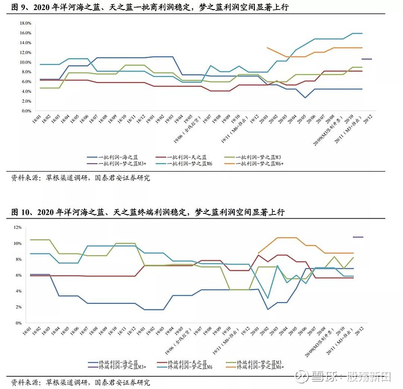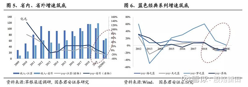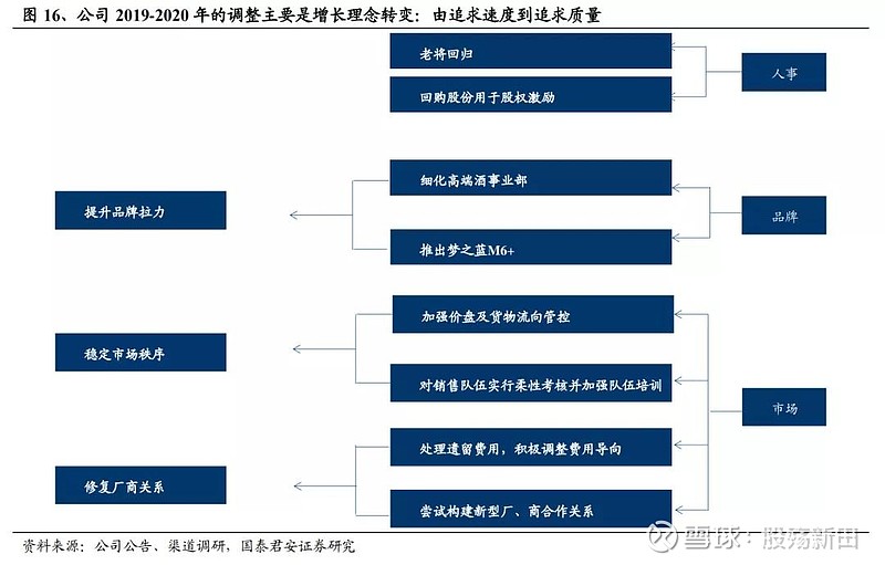 洋河股份(002304):每股净资产 24.07元,每股净利润 5.38元,历史净利润年均增长 47.08%,预估未来三年净利润年均增长 5.12%,更多数据见:洋河股份002304核心经营数据 洋河股份的当前股价 86.1元,市盈率 15.78,未来三年的估值假设和预期收益率如下:15倍PE,预期收益率 8.98%;20倍PE,预期收益率 45.3%;25倍PE,预期收益率 81.63%;30倍PE,预期收益率 117.95%。 核心结论: 维持“增持”评级,上调目标价至220元。考虑疫情将延迟梦之蓝新品进入高速放量期的时间节点,调整盈利预测,预计2020-22年EPS分别为4.97元/5.44元(-0.29元)/6.19元(-0.33元),参照行业均值并考虑估值切换,给予洋河2021年41倍PE,上调目标价至220元(前值200元),维持“增持”评级。 短期看,疫情影响2021Q1销售表现,但幅度有限。我们判断春节疫情防控之下海之蓝、天之蓝动销或受短暂冲击,梦之蓝M3控量力度或加大,根据我们测算,公司2021Q1收入增速有望维持在5%-13%,疫情对公司单季度收入增速影响有限。 经营拐点已现,洋河正重回增长轨道。结合渠道调研信息,我们判断洋河自2020年三季度已迎来经营层面拐点,收入、利润增速环比提振趋势不会因为疫情而改变;同时,疫情之下产品换代依旧顺利,预计2021年梦之蓝M6+将进入放量阶段,水晶版M3将覆盖旧版本体量,海之蓝、天之蓝有望恢复正增长,预计2022年蓝色经典整体有望重回放量阶段,长期看,梦之蓝系列将持续把握消费升级红利,海之蓝、天之蓝在渠道恢复后能实现可持续增长。 催化剂:1)海、天升级:公司可能会进一步推进海之蓝、天之蓝换代,市场对公司未来业绩弹性预期有望进一步提升;2)股权激励落地:公司已回购股份用于激励骨干,销售队伍积极性将进一步提升。 风险因素:食品安全、疫情持续恶化,流动性持续收紧。 正文 1. 增速趋势向上,经营拐点已现 1.1. 洋河收入、利润增速趋势向上 公司收入、利润增速呈现环比提振趋势。公司2020Q1之后收入、利润增速开始环比提升,2020Q3收入、利润增速首次转正,增速拐点已出现;根据草根调研估测,2020年前三季度,海之蓝、天之蓝及梦之蓝累计收入降幅逐季收窄,我们估测梦之蓝及天之蓝在2020Q3收入增速已转正,预计2020年梦之蓝系列将实现收入正增长。 1.2. 经营拐点已现,基本面筑底回升 2020Q1、Q2是洋河的至暗时刻,基本面阶段性筑底。2020年春节之后疫情形势严峻,对白酒需求有明显影响,公司依旧坚持既定战略,积极推进产品革新与渠道梳理,调整导致公司2020H1省内、省外收入双位数下滑,蓝色经典收入双位数下滑,调整导致公司市占率处于历史底部,海之蓝、天之蓝收入占比明显降低。 2020Q3洋河渠道推力明显恢复,经营拐点出现。就草根调研来看,库存方面,经过接近一年的控货与自然动销,洋河蓝色经典库存处于历史低位,海之蓝、天之蓝库存基本控制在1个季度内,梦之蓝渠道库存控制在2个月左右,渠道销售压力明显减缓,价格体系方面,控货叠加低费用投放,洋河海之蓝、天之蓝价盘已稳定,梦之蓝M3、M6受益换代价格明显上行,目前海之蓝、天之蓝。M3+及M6+一批商渠道利润稳定在4%、8%、10%、13%,渠道利润空间已打开,梦之蓝M6+为代表的次高端单品动销开始加速,因此我们认为洋河渠道推力正快速恢复,销售表现向好。 2. 2021Q1疫情影响可控,产品换代有序进行 2021年初疫情反复,对河北等省份白酒消费产生直接影响,其余省份则加大对宴席消费管控力度进而对春节用酒需求产生间接影响,但我们认为,疫情对洋河的影响尚可控:从区域层面讲,河北收入占洋河体量在3%左右,疫情对洋河的直接冲击有限,产品层面,因疫情而加强的管控主要影响个人宴席消费,根据草根渠道调研,洋河天之蓝及以上单品个人宴请占比低于4成,受影响部分主要在于海之蓝。我们依据不同消费场景受损程度对洋河2021Q1收入表现进行测算,认为公司2021Q1收入增速区间在5%-13%,概率期望值在8%,疫情对公司单季度收入增速影响相对有限。 另外,疫情对洋河产品升级的影响也较有限。我们认为,江苏省为代表的华东市场消费升级趋势仍在,苏酒次高端价位仍在快速扩容,而产品升级已解决渠道推力问题,疫情反复只是延长新单品形成消费者复购的时间,不改升级趋势。 插个福利了!!! 低价+低估值+底部启动=下一只黑马。马振华带领100多位研究员分析了所有行业的估值,与历史大行情启动前做了详细对比。一共有10只备选黑马,其中一只获得全员一致看好,预期收益在5倍左右! 由于监管原因不方便直接公开代码,这里暗号:黑马。同过(徽)信::z q y三个字母加上9 8 2 0 0了解黑马收益50%以上 3. 洋河调整深度考:理念转变铸就新洋河 3.1. 核心是理念转变:由追求速度到追求质量 我们认为,洋河2019年6月以来的系统性调整本质是公司增长理念的转变。公司调整主要集中在人事、品牌、市场三大方面:人事上,任命刘化霜为销售公司董事长并且回购股份用于激励中层销售人员;产品及品牌方面,持续捕捉消费升级红利,细化高端酒运营并且推出梦之蓝M6+及水晶版梦之蓝M3进行产品升级;市场方面,通过柔性考核、清理前期遗留费用来修复厂、商关系,通过改变费用投放并结合控货来改善渠道利润。整体而言,公司由追求销售增速、销售体量转变为追求品牌价值提升及厂商共赢,换言之,从追求增速到追求高质量、可持续增长。 3.2. 调整尚在中途,疫情之下眼望长远 我们通过梳理公司调整路线发现,公司调