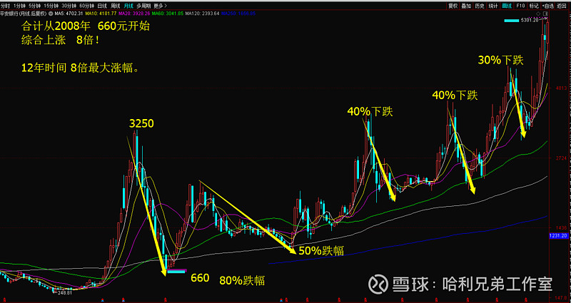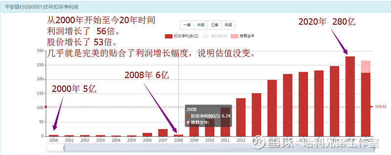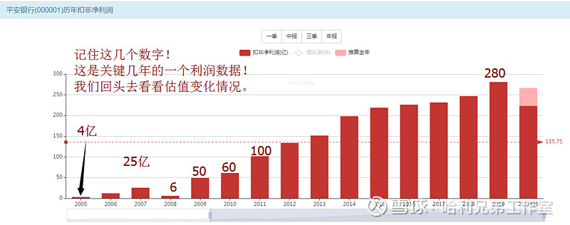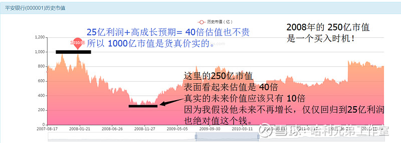 招商银行(600036):每股净资产 22.3元,每股净利润 3.13元,历史净利润年均增长 26.51%,预估未来三年净利润年均增长 14.28%,更多数据见:招商银行600036核心经营数据 招商银行的当前股价 31.63元,市盈率 8.82,未来三年的估值假设和预期收益率如下:15倍PE,预期收益率 121.54%;20倍PE,预期收益率 195.38%;25倍PE,预期收益率 269.23%;30倍PE,预期收益率 343.07%。 中国平安(601318):每股净资产 36.83元,每股净利润 8.41元,历史净利润年均增长 31.19%,预估未来三年净利润年均增长 15.17%,更多数据见:中国平安601318核心经营数据 中国平安的当前股价 71.44元,市盈率 8.74,未来三年的估值假设和预期收益率如下:15倍PE,预期收益率 169.75%;20倍PE,预期收益率 259.67%;25倍PE,预期收益率 349.58%;30倍PE,预期收益率 439.5%。 平安银行(000001):每股净资产 14.07元,每股净利润 1.54元,历史净利润年均增长 37.98%,预估未来三年净利润年均增长 14.11%,更多数据见:平安银行000001核心经营数据 平安银行的当前股价 13.41元,市盈率 9.23,未来三年的估值假设和预期收益率如下:15倍PE,预期收益率 155.95%;20倍PE,预期收益率 241.27%;25倍PE,预期收益率 326.58%;30倍PE,预期收益率 411.9%。 纸上得来终觉浅 • “读书无用论”在证券市场也是甚嚣尘上! • 背后的真相是什么呢? • 首要的一点是,可能你读的书还真是不够多,思考也没有进入到某个深度,所以这是造成你觉得无用的一个现象。 • 其次很重要的一点是:你只会人云亦云,而不会举一反三。人云亦云的本质是照本宣科,生搬硬套,举一反三的本质是理论要结合实际,一切从实际出发,具体问题具体分析,实事求是的来进行真理检验。 • 这就是“大傻瓜做价值投资”整个系列的初衷,我们读了太多的经典,他们会给你很多笼统的概念— 比如 :以20倍的估值买入一个好公司是一个划算的投资; 好公司+好价格=闭眼买入持有。这些话乍听起来是没错的,而且也都是大师们实际运用过的智慧分享,但是如果仅仅是读了这些话,我们最终依旧还是一只人云亦云的鹦鹉。因此,我们要亲身下场看看,到底多少倍的估值才是真正的市场表现?到底什么样的公司是好公司?什么样子的价格是好价格?闭眼买入的时候发生了什么?持有时间需要多久才能看到效果?一大堆的问题等着我们去挖掘出答案。 000001平安银行 书上的内容都太空泛了 写文章最喜爱的就是渲染,所以,你会看到很多情绪化的内容:哇塞! 30年110倍,大牛股啊,要是在其中某一年买入持有,能有什么样子的收获,诸如此类的话我们认为并没有什么营养,只会更多的误导大众。我们来实际看看这其中有什么样子的一些真实数据?数学是最科学的;所以用数据说话是最客观的结论。 第一个15年 第二个15年 不要光看空洞诱人的数据 • 1990年上市买入! 至今收益 100倍。 • 1996年熊市买入!至今收益 50倍。 • 2005年改革买入!至今收益20倍。 • 2008年危机买入!至今收益8倍。 • 2012年熊市买入!至今收益5倍。 • 2015年股灾买入!至今收益2.6倍。 • 这些数据毫无意义!太空洞了! • 没有任何的基础,就好像,在不讨论出身背景和时代环境的前提下去评论一个人物的功过是非一样,毫无科学道理。 • 我们需要更多的基础数据来观察这其中的本质。 牛股真正的上涨时间只有6% 只有2年时间! 很可惜!这就是现实! 也就是 6%的时间是真正的上涨,创造财富! 1996-1997年,1年多时间上涨15倍。 2006-2007年,1年多时间上涨13倍。 如果删除掉这2年,这6%的时间,股价从2007年的巅峰至今2020年,仅仅只有60%的涨幅。 牛股70%的时间都在下跌 评价一个人,不要看他在顶峰的时候,而要看他跌入低谷的一个反弹力。 这30年历史中,经历过的下跌为: • 1993-1996;下跌3年,跌幅60%。 • 1997-2005;下跌8年,跌幅83%。 • 2007-2009;下跌2年,跌幅80%。 • 2009-2012;下跌3年,跌幅50%。 • 2015-2016;下跌2年,跌幅40%。 • 2017-2018;下跌1年,跌幅40%。 • 2019-2020;下跌半年,跌幅30%。 • 30年里,下跌年份加起来20年! • 整整20年的时间都在下跌,都在经历财富缩水。 看看你经历了什么? 假设我们以100万作为一个买入基准,看看我们中间经历了什么? • 1 你需要持有长达30年的时间,不能卖出,然后看着他赚钱,亏钱,又赚钱的净值来回波动。 • 2 30年时间里,有20年时间都在亏钱,也就是这20年里睁开眼看账户一直在缩水。 • 2 最短的亏损周期是1-2年,就可以重新看到开始赚钱增值,最长的亏损周期是8年,8年时间里几乎每个月财富都在缩水蒸发。 • 3 缩水幅度是多少呢?最少最少 30%,最多最多 80%,也就是,你需要在1-2年,甚至8年的时间里面,慢慢的看到自己的资金从100万,缩水到 50万,再缩水到20万! • 4 赚钱嗨起来能让你疯狂到什么程度呢?1997和2007年,你会经历两次10倍身家暴涨的过程,这2年,如果你是一个容易被钱所影响的人,那么恭喜你这两年你会非常的开心, 因为你可能从100万身家,突然变成1000万身家,但是,除去这2年之外的28年,你的日子会非常非常的寡淡,平淡到让你看不到丝毫的赚钱乐趣。 • 5 一年之内暴涨十倍,然后又花了8年时间让你缩水80%,几乎回到起点,这样一个过山车足以让人心脏病不知道发作几次了。 • 如果以上这些你都可以接受,那么恭喜你,30年之后,你才有资格享受这个100倍的资产回报,难怪清华的校训叫做:厚德载物!要是我们的德行不够厚的话,根本承载不了这么多的过山车呢。 股价真正的推动力 看看这几个利润数据 