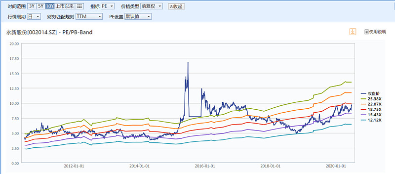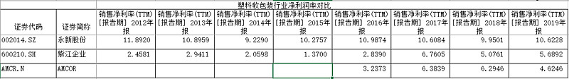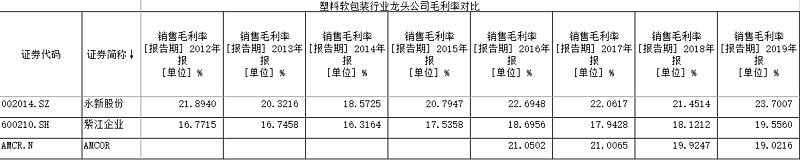 永新股份(002014):每股净资产 3.69元,每股净利润 0.54元,历史净利润年均增长 13.79%,预估未来三年净利润年均增长 13.55%,更多数据见:永新股份002014核心经营数据 永新股份的当前股价 9.32元,市盈率 17.44,未来三年的估值假设和预期收益率如下:15倍PE,预期收益率 27.24%;20倍PE,预期收益率 69.66%;25倍PE,预期收益率 112.07%;30倍PE,预期收益率 154.48%。 先写结论: 永新股份是塑料软包装行业龙头公司,公司负债率低,经营稳健,公司下游是消费日化医药行业,需求稳定,上游是石油化工,今年受益于原油价格大幅下滑,公司盈利能力处于景气周期。公司历史最低PE估值为12倍左右,估值回到12倍概率较低,且相比其它行业受疫情影响,今年公司受影响较小,股权激励确保未来三年业绩增速,属于低估值适当增长的小市值龙头公司!值得关注。 投资要点: 1. 2020年6月20日公司出了股权激励,以2019年为基数,2020年-2022年复合增长率13%,参与人员为高管12人,股权激励数量为1040万股,占总股本2.06%,行权价4.44元每股。 2. 公司主要产品是塑料包装,上游原材料主要以石油化工品为主,原材料占总成本比例为77%,下游为食品日用医药行业,需求稳定,油价下跌利好公司毛利率提升。 3. 公司高比例分红,派息率近5年保持70%以上,累计分红金额超过上市融资额,是A股少有的良心公司,公司现金流持续向好,经营性现金流净额/净利润达到1.6倍。 4. 研发费用占营收比例逐年提升,增强公司竞争力,海外业务恢复两位数增长,随着竞争力持续提升,公司估值有提升可能,参照国外巨头安姆科20-30倍的估值区间,永新股份存在戴维斯双击的可能。 一 塑料包装行业分析 塑料软包装主要指用纸、铝箔、纤维、塑料薄膜以及他们的复合物所制成的袋、盒包封等包装形式,在下游食品加工业、医药用品、洗涤用品和农药等行业被广泛应用,上游主要是聚乙烯薄膜、流延聚丙烯薄膜、双向拉伸聚丙烯薄膜等和石油紧密相关的原材料产业。从软包装行业应用结构来看,最大的应用是食品饮料,占软包总消耗量的 70%左右。 图表1:塑料软包装产业链图 根据凯度消费者指数报告, 2018 年快速消费品销售额同比增长 4.3%。 此外, 根据博思数据, 2015 年中国塑料软包装行业的产值约为 769.7 亿元,同比增长 5.4%,2010-2015 年复合增长率达 9.57%。假设 2016-2018 这 3 年的行业复合增速放缓至 5%,估计 2018 年中国塑料软包装行业的产值在 900 亿元左右。 图表2:塑料软包装行业规模 1 行业财务特征: 塑料软包装行业公司毛利率普遍较低,毛利率在20%左右。 图表3:塑料软包装行业毛利率对比 塑料软包装行业公司净利润率也普遍较低,永新股份净利润率最高10%左右。 图表4:塑料软包装行业净利润率对比 2 竞争格局 市场集中度低,但行业竞争激烈,多因素促使行业资源向头部企业聚集。 我国塑料软包装行业的市场集中度很低, 第一梯队的企业主要包括永新股份(17 年收入 20.09 亿)、紫江企业(17 年软包业务收入 12.45 亿)、江苏彩华包装(17 年估计收入约 7-8 亿)、以及全球龙头安姆科的中国区业务(估计和永新股份收入体量相当),4 家公司合计市场份额约达 7%-10%,竞争格局较为分散。 总体来看,环保政策趋严、下游品牌客户的成长、劳动力成本的上升和产业升级带来的挤出效应都在逐步使得行业内资源向头部企业集中,头部企业与下游中高端客户的关系也更加紧密。 3 行业政策 07年12月31日,国务院颁布“限塑令”,在全国范围内禁止生产、销售、使用厚度小于 0.025 毫米的塑料购物袋,并要求提高废塑料的回收利用水平,限塑令主要针对超薄塑料购物袋,而对于符合耐用、易回收的塑料制品并无影响。 图表5:限塑令相关政策 4 行业未来发展趋势 目前塑料软包装行业转型升级迫在眉睫。主要体现在两个方面:1)行业对消费者的保护和客户对安全的更高要求都为全行业带来挑战。全行业普遍倡导清洁生产和绿色发展,尤其是必须适应对挥发性有机化合物(VOCs)排放控制的要求,对全行业都产生影响。2)随着互联网技术和运用的普及,物联网、大数据应用的不断推广,大数据在包装领域的创新应用、智能化包装业成为包装发展的必选题。 二 公司概况 1 历史沿革、控股股东及主要高管情况 黄山永新股份有限公司成立于 1992 年,主要生产经营真空镀铝膜、塑胶彩印复合软包装材料、药品包装材料、多功能高阻隔薄膜等高新技术产品,用于食品、日化、医药等必需消费品类领域。公司多年精专塑料软包装行业,通过与多个产业技术中心及团队的长期合作,逐渐在新材料运用、产品设计及创新、产业链的协同配套等多个方面积累出核心优势,是行业中当之无愧的领军企业。 图表6:永新股份发展历程 公司持股 5%以上的股东分别是黄山永佳投资和奥瑞金。截至 2020 年一季度,第一大股东黄山永佳投资持股 31.7%,永佳投资的第一大股东是黄山市供销集团。第二大股东为金属包装龙头奥瑞金持股比例为 24.18%。在 2015-2016 年期间,奥瑞金及其控股股东基于对永新内在价值的认可,以及拓展包装业务的意图,通过二级市场总计买入公司股权比例 24.2%,平均买入成本 11.51 元/股(考虑除息和除权)。 2 公司商业模式及主营业务情况 公司主要生产经营真空镀膜、多功能薄膜、彩印复合软包装材料、纸基复合包装材料、新型医药包装材料、塑料制品、精细化工产品等高新技术产品,主要用于食品