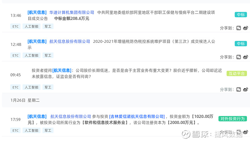 航天信息(600271):每股净资产 5.97元,每股净利润 0.87元,历史净利润年均增长 16.71%,预估未来三年净利润年均增长 17.0%,更多数据见:航天信息600271核心经营数据 航天信息的当前股价 20.67元,市盈率 20.17,未来三年的估值假设和预期收益率如下:15倍PE,预期收益率 1.12%;20倍PE,预期收益率 34.82%;25倍PE,预期收益率 68.53%;30倍PE,预期收益率 102.24%。 捷风数据2021-01-27根据公开信息搜集发现:【航天信息,600271】的航天信息股份有限公司《2020-2021年增值税防伪税控系统维护项目(第三次)成交候选人公示》。 以下是【航天信息,600271】信息摘要的截图: 数据来源:捷风数据_jiefengnews 接下来,我们小编整理了近期【航天信息,600271】的部分经营动态如下,各位大佬可以参考: 1、捷风数据于2021-01-27根据公开信息搜集发现:【航天信息,600271】的华迪计算机集团有限公司《中共阿里地委组织部阿里地区干部职工保健与慢病平台二期建设项目成交公告》,公示金额为208.6万元; 2、捷风数据于2021-01-27根据公开信息搜集发现:【航天信息,600271】的航天信息股份有限公司《2020-2021年增值税防伪税控系统维护项目(第三次)成交候选人公示》; 3、捷风数据于2021-01-26根据公开信息搜集发现:【航天信息,600271】的航天信息股份有限公司西藏分公司《中国移动西藏公司财务部2020年防伪税控增值税销项发票管理系统维保服务项目_中选候选人公示》; 4、捷风数据于2021-01-26根据公开信息搜集发现:【航天信息,600271】的四川航天信息有限公司《四川省司法行政戒毒系统信息系统整体运维服务项目公开招标结果公告》; 5、捷风数据于2021-01-26根据公开信息搜集发现:【航天信息,600271】的华迪计算机集团有限公司《中征动产融资登记服务有限责任公司转发平台改造升级项目中标候选人公示》,公示金额为334.72万元; 6、捷风数据于2021-01-26根据公开信息搜集发现:【航天信息,600271】的湖北航天信息技术有限公司《监利县电化教育馆监利市电教馆班班通(75寸)采购项目中标(成交)结果公告》,公示金额为397.56万元。 以下是【航天信息,600271】部分经营动态的截图: 数据来源:捷风数据_jiefengnews 了解更多【航天信息,600271】的信息,请关注我们捷风数据的动态。 作者:捷风数据_jiefengnews $航天信息(sh600271)$ 作者:捷风数据原文链接:https://xueqiu.com/2536037617/170077773 转载请注明:www.51xianjinliu.com » 航天信息2020-2021年增值税防伪税控系统维护项目第三次成交候选人公示 喜欢 (0)or分享 (0)