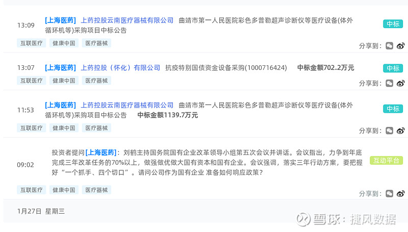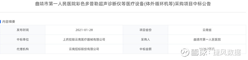 恒瑞医药(600276):每股净资产 5.23元,每股净利润 1.1元,历史净利润年均增长 30.79%,预估未来三年净利润年均增长 28.72%,更多数据见:恒瑞医药600276核心经营数据 恒瑞医药的当前股价 80.59元,市盈率 72.91,未来三年的估值假设和预期收益率如下:15倍PE,预期收益率 -63.61%;20倍PE,预期收益率 -51.48%;25倍PE,预期收益率 -39.35%;30倍PE,预期收益率 -27.22%。 上海医药(601607):每股净资产 14.4元,每股净利润 1.37元,历史净利润年均增长 39.65%,预估未来三年净利润年均增长 12.61%,更多数据见:上海医药601607核心经营数据 上海医药的当前股价 17.25元,市盈率 12.54,未来三年的估值假设和预期收益率如下:15倍PE,预期收益率 70.33%;20倍PE,预期收益率 127.11%;25倍PE,预期收益率 183.88%;30倍PE,预期收益率 240.66%。 捷风数据2021-01-28根据公开信息搜集发现:【上海医药,601607】的上药控股云南医疗器械有限公司《曲靖市第一人民医院彩色多普勒超声诊断仪等医疗设备(体外循环机等)采购项目中标公告》,公示金额为1139.7万元,占上一年营业收入的0.01%。 以下是【上海医药,601607】信息摘要的截图: 数据来源:捷风数据_jiefengnews 接下来,我们小编整理了近期【上海医药,601607】的部分经营动态如下,各位大佬可以参考: 1、捷风数据于2021-01-28根据公开信息搜集发现:【上海医药,601607】的上药控股云南医疗器械有限公司《曲靖市第一人民医院彩色多普勒超声诊断仪等医疗设备(体外循环机等)采购项目中标公告》; 2、捷风数据于2021-01-28根据公开信息搜集发现:【上海医药,601607】的上药控股(怀化)有限公司《抗疫特别国债资金设备采购(1000716424)》,公示金额为702.2万元; 3、捷风数据于2021-01-28根据公开信息搜集发现:【上海医药,601607】的上药控股云南医疗器械有限公司《曲靖市第一人民医院彩色多普勒超声诊断仪等医疗设备(体外循环机等)采购项目中标公告》,公示金额为1139.7万元; 4、捷风数据于2021-01-27根据公开信息搜集发现:【上海医药,601607】的厦门中益药业有限公司《福建经发-公开招标-2021-JF103-电动牙科椅及牙科治疗机结果公告》,公示金额为57.0万元; 5、捷风数据于2021-01-27根据公开信息搜集发现:【上海医药,601607】的上药控股佛山有限公司《佛山市中医院三水医院购置高端便携式可移动心脏超声系统+购买无创肝纤维化诊断仪(ZFXL2020067)的中标结果公告》,公示金额为62.9万元; 6、捷风数据于2021-01-25根据公开信息搜集发现:【上海医药,601607】的上药控股云南医疗器械有限公司《云南省第一人民医院鼻功能诊断系统等采购项目-包号002:鼻动力系统中标候选人公示》。 以下是【上海医药,601607】部分经营动态的截图: 数据来源:捷风数据_jiefengnews 了解更多【上海医药,601607】的信息,请关注我们捷风数据的动态。 作者:捷风数据_jiefengnews $上海医药(sh601607)$ 作者:捷风数据原文链接:https://xueqiu.com/2536037617/170227030 转载请注明:www.51xianjinliu.com » 上海医药曲靖市第一人民医院彩色多普勒超声诊断仪等医疗设备(体外循环机等)采购项目中标公告 喜欢 (0)or分享 (0)