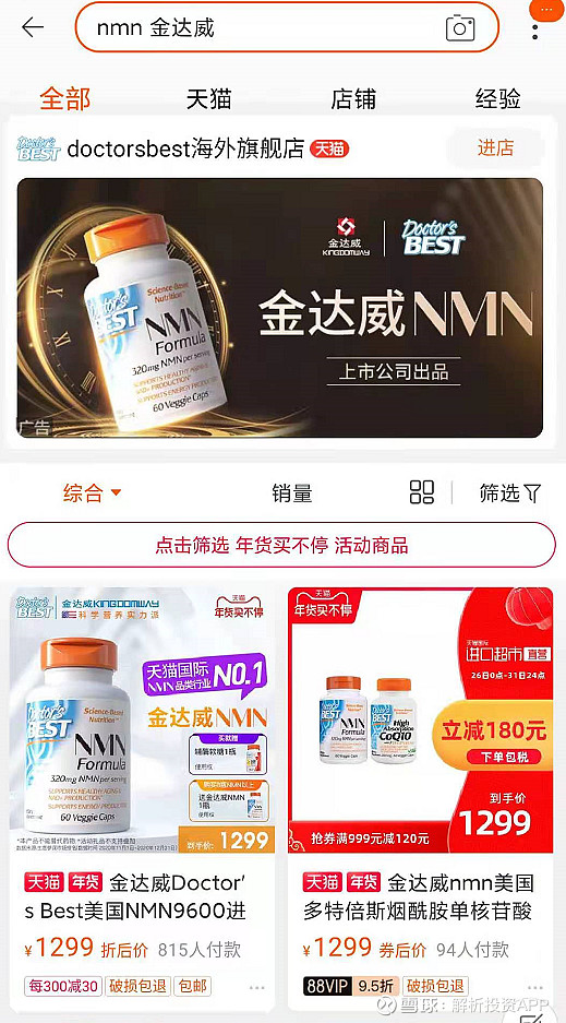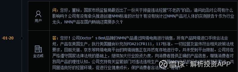 金达威(002626):每股净资产 4.9元,每股净利润 1.11元,历史净利润年均增长 35.93%,预估未来三年净利润年均增长 28.26%,更多数据见:金达威002626核心经营数据 金达威的当前股价 18.57元,市盈率 20.29,未来三年的估值假设和预期收益率如下:15倍PE,预期收益率 89.18%;20倍PE,预期收益率 152.24%;25倍PE,预期收益率 215.3%;30倍PE,预期收益率 278.36%。 最近,红极一时的“不老药”NMN迎来严监管。 1月19日,消息称国家市场监管总局已印发《关于排查违法经营“不老药”的函》,明确在我国境内烟酰胺单核酸(NMN)不能作为食品进行生产和经营,并要求对相关经营者进行全面排查。 该文件指出,NMN在我国未获得药品、保健食品、食品添加剂和新食品原料许可,即在我国境内,NMN不能作为食品进行生产和经营。 作为NMN概念股龙头,金达威在2020年7月份表示上线一款NMN产品,股价也因此迎来10天8涨停,单月涨幅高达125%。 受此消息影响,1月20日,NMN概念龙头股金达威股价大跌近9%。 金达威在回复投资者问询时表示,公司Doctor’sBest品牌的NMN产品通过跨境电商进行销售,所有产品跨境进口手续合法合规,产品在美国生产,执行美国膳食补充剂FDA21CFR111,117标准。一切经营及宣传符合相关政策法规要求,目前天猫、京东等跨境电商平台的跨境销售正在井然有序地进行中,并未受到平台限制。 解析君也亲自到电商平台去查看,金达威的NMN产品确实是在正常销售,售价为1299元/瓶。 此次市场监管总局发文规范国内NMN市场,可以让国内违规经营的小厂商退出,整治市场乱象。金达威能否借此机会来塑造品牌力,提升影响力,打造另外一个利润爆发点呢? 01 金达威,主要从事食品营养强化剂原料和保健食品的生产与销售,是国内食品营养强化剂龙头,全球最大的辅酶Q10生产企业、六大维生素A供应商之一。 公司成立于1997年,早期的金达威主要产品为食品营养强化剂、饲料添加剂,与业内其他公司新和成、浙江医药等相比,存在业务单一、产品价格波动大等问题。 2011年在深交所上市后,公司通过外延并购逐步向下游保健品行业延伸。 2015-2018年先后收购或参股了Doctor’sBest、ProSupps、Zipfizz和Labrada,切入膳食营养补充剂、运动营养和体重管理领域,收购Vitatech打造中游生产加工基地,参股iHerb加码下游渠道销售。 目前,金达威已经形成了从上游原料供应到中游生产加工,再到下游渠道销售的大健康全产业链。 02 金达威的业务构成主要有三大类,营养保健食品、维生素A系列、辅酶Q10系列。 从收入比例来看,2020H1营养保健食品收入8.29亿元,占比51.57%,是最大的收入来源;维生素A系列、辅酶Q10系列收入分别为3.76亿元、3.15亿元,占比23.41%、19.58%。 从利润比例来看,三者相差不多,各占30%左右。 分地区来看,公司的境外销售收入占比高达78.08%,境内收入占比21.92%,一方面是因为公司的辅酶Q10、维生素A产品出口占比非常大,另一方面公司收购的保健品公司主要在国外,在国外拥有较好的市场。 03 下面我们主要就金达威的三大业务逐一分析。 先说说营养保健食品,根据《中华人民共和国食品安全法释义》,保健品是指具有保健功能或者以补充维生素、矿物质等营养物质为目的的食品。即适宜于特定人群食用,具有调节机体功能,不以治疗疾病为目的,并且对人体不产生任何急性、亚急性或慢性危害的食品。 国际上并没有保健品的说法,参照Euromonitor的统计口径,保健品产品分为四类:膳食补充剂、传统滋补类保健品、运动营养品、体重管理产品。 中国的保健品市场起步比较晚,但发展非常快。2018年中国保健品市场规模达到2575亿元,同比增长8.4%,成为全球第二大保健品消费市场,仅次于美国。 因为中老年人是保健品消费的主力军,未来随着人口老龄化速度加快,保健品市场需求将保持稳定增长。截至2018年底,我国65岁以上人口已经达到1.67亿人,占比11.9%。根据世界卫生组织发布的《中国老龄化与健康国家评估报告》,中国人口老龄化进程要明显快于其他中低收入国家,到2040年,60岁及以上人口的比例将从2010年的12.4%上升至28%。 另外,80后90后青年群体也逐渐成为保健品消费主力之一。现代都市生活节奏加快,许多人经常加班、熬夜导致出现各种早衰综合症,年轻人都在为“未老先衰”而焦虑担忧。根据速途研究院报告,超过一半的90后有使用保健品的习惯。 2018年我国人均保健品消费支出为30美元,仅为美国的1/7,未来还有较大提升空间。从渗透率来看,我国保健品渗透率仅为20%左右,其中粘性用户仅有10%,而美国的保健品渗透率达到50%以上,日本渗透率在40%左右。 金达威拥有完整的保健品产业链,通过收购Doctor’sBest切入传统膳食营养补充剂,后者是美国知名保健品品牌公司,多个产品在亚马逊、iHerb等跨境电子商务网站销量排名靠前。通过收购Vitatech打造中游生产加工基地,参股Labrada切入运动营养和体重管理领域,收购ProSupps加码运动营养产品,收购Zipfizz聚焦80、90后年轻消费群体,参股iHerb加码下游渠道销售。 公司加强数字营销、社会化媒体等多种营销手段,品牌力不断提升,产品有望在未来进一步放量。 从NMN产品来看,机构预测每覆盖1%的国内保健人群市场,对应的市场规模为304亿元,随着抗衰老产品未来市场不断推广,如果覆盖率达到3%,市场规模将达到千亿。 根据金达威三季报,报告期内美国子公司的NMN共销售24238瓶,销售收入3073万元。当然了,公