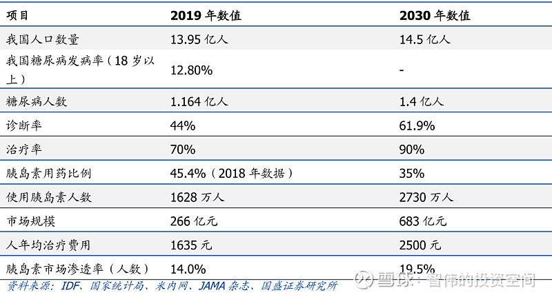 通化东宝(600867):每股净资产 2.46元,每股净利润 0.41元,历史净利润年均增长 35.47%,预估未来三年净利润年均增长 18.73%,更多数据见:通化东宝600867核心经营数据 通化东宝的当前股价 10.46元,市盈率 25.35,未来三年的估值假设和预期收益率如下:15倍PE,预期收益率 -1.59%;20倍PE,预期收益率 31.21%;25倍PE,预期收益率 64.01%;30倍PE,预期收益率 96.81%。 在进入2021年之际,笔者在布局今年的投资赛道时无意中发现了胰岛素这一“消费刚性”的医药领域投资赛道,经过大量分析之后看好 #通化东宝# 这只老白马,有点王者归来的意思,具体分析思路如下: 一、市场容量巨大,国内市场加速扩容 根据国际糖尿病联合会IDF官网的数据统计2019年,全球糖尿病已经查明的患者数量为4.36亿人,到2045年预计上升至7亿人;其中中国糖尿病患者占了1.16亿人,是全球糖尿病患者最多的国家,这个数字到2030年预计会是1.4亿人。 从增速的角度而言,由于我国已经成为中等收入国家,得益于强大的基础设施建设以及具有比较优势的政治体制,将来跨越中等收入陷阱的可能性极大,未来几年稳步向高收入国家靠拢;因此糖尿病患者的比例将会明显上升,增速将会超过其他发展中国家。 二、糖尿病患者进入治疗流程后的“不可逆性”,极大的提高了客户粘性 以上是2018年发布的《国家基层防止糖尿病指南》对于控糖治疗的流程图;根据我和几个内分泌科医生的聊天得知,糖尿病治疗的过程基本上是不可逆的,一旦确诊,最终都会走向胰岛素多次注射的结局。而如下图显示,目前治疗糖尿病的药物中,胰岛素占据了半壁江山。而总的市场规模在700亿左右 到2030年仅仅胰岛素的市场规模就将达到683亿元 三、这个赛道上谁在分蛋糕? 根据米内网的数据现实,赛道上目前三家外资还是占据主导,但国内两家巨头但份额正在不断扩展。其中通化东宝占据了龙头但地位,2018年份额达到了9.42%,而甘李药业位居第二,占了8.76% 从二代胰岛素的竞争格局来看,国内市场通化东宝与珠海联邦两家各占半壁江山。 三代胰岛素国内厂家涉及的产品仅为甘精胰岛素,占了三代产品43.01%的份额,甘李药业独占鳌头,但是从市场渠道的沉淀及产能情况而言,通化东宝大有后来居上的潜力。 因此,胰岛素赛道总体而言,通化东宝可以说坐稳了王者的宝座。 四、如何选取合适标的 笔者认为在胰岛素赛道上甘李药业和通化东宝是仅有的两个黄金标的,但最终选择通化东宝但原因是由于估值但差异及近期通化东宝展现出的一些积极的因素。 根据Wind行情软件显示,甘李药业截止周五1月29日,收盘价为146.4元,动态PE为69倍、EPS为2.12元;而通化东宝收盘价为11.18元,动态PE为24.5倍、EPS为0.46元;从估值的角度,通化东宝的股价明显被低估(股价差了十几倍而EPS只差了五倍不到)。 周五,通化东宝发布了回购公告,拟以自有资金1.6亿元以不超过16元的价格回购股票;说明大股东都认为目前的股价严重偏离了估值! 员工持股计划的股票期权行权价格也定在了14.31元每股,也远高于目前的股价,所以基本可以得出结论,目前通化东宝的二级市场价格大概率底部运行,未来的上涨空间巨大!建仓正当时! #通化东宝# #甘李药业# #胰岛素# #糖尿病# 作者:智伟的投资空间原文链接:https://xueqiu.com/9206953941/170509357 转载请注明:www.51xianjinliu.com » 为什么看好胰岛素这个赛道 最佳标的通化东宝 喜欢 (0)or分享 (0)
