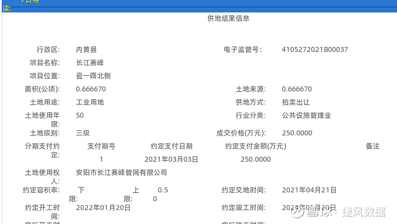 长江电力(600900):每股净资产 6.6元,每股净利润 1.03元,历史净利润年均增长 13.6%,预估未来三年净利润年均增长 0.71%,更多数据见:长江电力600900核心经营数据 长江电力的当前股价 17.07元,市盈率 16.67,未来三年的估值假设和预期收益率如下:15倍PE,预期收益率 -7.75%;20倍PE,预期收益率 23.0%;25倍PE,预期收益率 53.76%;30倍PE,预期收益率 84.51%。 捷风数据:【长江电力,600900】安阳市长江赛峰管网有限公司在河南省安阳市内黄县拿了面积为6666平方米成交金额为250.0万元土地类型为工业用地的地块,该地块楼面价为750.0元/平方米。 以下是【长江电力,600900】拿地信息摘要的截图: 数据来源:捷风数据_jiefengnews 接下来,我们小编整理了近期【长江电力,600900】的部分经营动态如下,各位大佬可以参考: 1、捷风数据:【长江电力,600900】安阳市长江赛峰管网有限公司在河南省安阳市内黄县拿了面积为6666平方米成交金额为250.0万元土地类型为工业用地的地块,该地块楼面价为750.0元/平方米; 2、捷风数据于2021-01-16根据公开信息搜集发现:【长江电力,600900】的三峡高科信息技术有限责任公司《大渡河硬梁包电站基建管理系统运行维护第2轮询价书的采购结果》,公示金额为67.0万元; 3、捷风数据于2021-01-12根据公开信息搜集发现:【长江电力,600900】的重庆两江城市电力建设有限公司《中冶建工集团有限公司西彭混凝土生产基地10KV专用配电工程专业分包中标公告》; 4、捷风数据于2021-01-11根据公开信息搜集发现:【长江电力,600900】的重庆三峡水利电力建设有限公司《万州区塘坊新城区渝巴路东二段工程项目电力线路迁移工程施工中选候选人公示》,公示金额为512.8万元; 5、捷风数据于2021-01-04根据公开信息搜集发现:【长江电力,600900】的重庆两江综合能源服务有限公司《重庆工商大学电动汽车充电桩建设结果公告》,公示金额为49.0万元; 6、捷风数据于2020-12-25根据公开信息搜集发现:【长江电力,600900】的重庆三峡水利电力建设有限公司《110千伏周家坝变电站新建工程线路部分工程施工中选候选人公示》,公示金额为363.49万元。 以下是【长江电力,600900】部分经营动态的截图: 数据来源:捷风数据_jiefengnews 了解更多【长江电力,600900】的信息,请关注我们捷风数据的动态。 作者:捷风数据_jiefengnews $长江电力(sh600900)$ 作者:捷风数据原文链接:https://xueqiu.com/2536037617/170616912 转载请注明:www.51xianjinliu.com » 长江电力在河南省安阳市内黄县拿了6666平方米土地工业用地 喜欢 (0)or分享 (0)