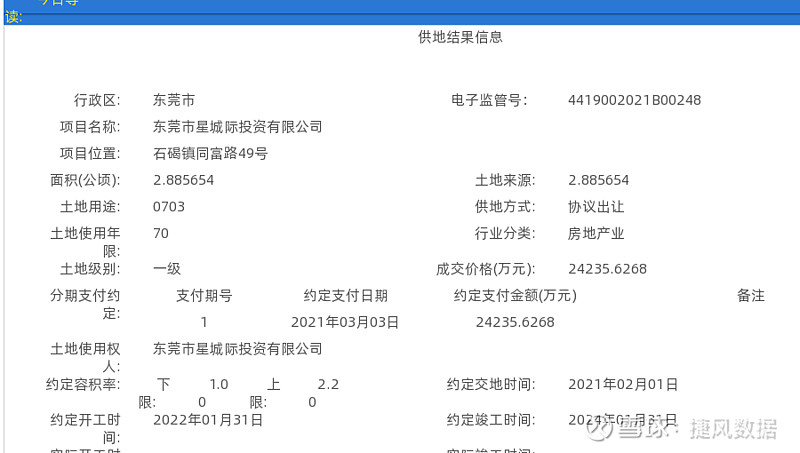 新城控股(601155):每股净资产 13.0元,每股净利润 4.69元,历史净利润年均增长 48.78%,预估未来三年净利润年均增长 28.62%,更多数据见:新城控股601155核心经营数据 新城控股的当前股价 29.02元,市盈率 5.9,未来三年的估值假设和预期收益率如下:15倍PE,预期收益率 415.81%;20倍PE,预期收益率 587.75%;25倍PE,预期收益率 759.69%;30倍PE,预期收益率 931.63%。 捷风数据:【新城控股,601155】东莞市星城际投资有限公司在广东省东莞市拿了面积为28856平方米成交金额为24235.63万元土地类型为住宅用地的地块,该地块楼面价为3817.57元/平方米。 以下是【新城控股,601155】拿地信息摘要的截图: 数据来源:捷风数据_jiefengnews 接下来,我们小编整理了近期【新城控股,601155】的部分经营动态如下,各位大佬可以参考: 1、捷风数据:【新城控股,601155】东莞市星城际投资有限公司在广东省东莞市None拿了面积为28856平方米成交金额为24235.63万元土地类型为住宅用地的地块,该地块楼面价为3817.57元/平方米; 2、捷风数据:【新城控股,601155】上海鸿泽房地产开发有限公司在浙江省嘉兴市平湖市拿了面积为18000平方米成交金额为24948.0万元土地类型为住宅用地的地块,该地块楼面价为6300.0元/平方米; 3、捷风数据:【新城控股,601155】盱眙鸿熠房地产开发有限公司的盱眙县第六实验幼儿园,项目位于【江苏省】; 4、捷风数据:【新城控股,601155】永州新城恒悦房地产开发有限公司在湖南省永州市None拿了面积为118646平方米成交金额为33410.0万元土地类型为住宅用地的地块,该地块楼面价为938.64元/平方米; 5、捷风数据:【新城控股,601155】上海富铭房地产开发有限公司在江苏省南通市如皋市拿了面积为31017平方米成交金额为53271.7万元土地类型为住宅用地的地块,该地块楼面价为7806.82元/平方米; 6、捷风数据于2021-01-22根据公开信息搜集发现:【新城控股,601155】的江苏筑森建筑设计有限公司《中国电信股份有限公司常州分公司高铁新城新科创大楼D501室装修深化设计服务采购项目中选人公示》。 以下是【新城控股,601155】部分经营动态的截图: 数据来源:捷风数据_jiefengnews 了解更多【新城控股,601155】的信息,请关注我们捷风数据的动态。 作者:捷风数据_jiefengnews $新城控股(sh601155)$ 作者:捷风数据原文链接:https://xueqiu.com/2536037617/170615892 转载请注明:www.51xianjinliu.com » 新城控股在广东省东莞市拿了28856平方米土地住宅用地 喜欢 (1)or分享 (0)