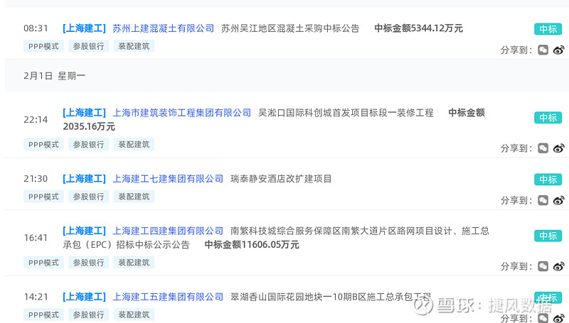 上海建工(600170):每股净资产 2.83元,每股净利润 0.29元,历史净利润年均增长 23.03%,预估未来三年净利润年均增长 16.21%,更多数据见:上海建工600170核心经营数据 上海建工的当前股价 3.23元,市盈率 7.79,未来三年的估值假设和预期收益率如下:15倍PE,预期收益率 111.36%;20倍PE,预期收益率 181.81%;25倍PE,预期收益率 252.26%;30倍PE,预期收益率 322.71%。 捷风数据2021-02-02根据公开信息搜集发现:【上海建工,600170】的苏州上建混凝土有限公司《苏州吴江地区混凝土采购中标公告》,公示金额为5344.12万元,占上一年营业收入的0.03%。 以下是【上海建工,600170】信息摘要的截图: 数据来源:捷风数据_jiefengnews 接下来,我们小编整理了近期【上海建工,600170】的部分经营动态如下,各位大佬可以参考: 1、捷风数据于2021-02-02根据公开信息搜集发现:【上海建工,600170】的苏州上建混凝土有限公司《苏州吴江地区混凝土采购中标公告》,公示金额为5344.12万元; 2、捷风数据于2021-02-01根据公开信息搜集发现:【上海建工,600170】的上海市建筑装饰工程集团有限公司《吴淞口国际科创城首发项目标段一装修工程》,公示金额为2035.16万元; 3、捷风数据于2021-02-01根据公开信息搜集发现:【上海建工,600170】的上海建工七建集团有限公司《瑞泰静安酒店改扩建项目》; 4、捷风数据于2021-02-01根据公开信息搜集发现:【上海建工,600170】的上海建工四建集团有限公司《南繁科技城综合服务保障区南繁大道片区路网项目设计、施工总承包(EPC)招标中标公示公告》,公示金额为11606.05万元; 5、捷风数据于2021-02-01根据公开信息搜集发现:【上海建工,600170】的上海建工五建集团有限公司《翠湖香山国际花园地块一10期B区施工总承包工程》; 6、捷风数据于2021-02-01根据公开信息搜集发现:【上海建工,600170】的上海建工一建集团有限公司《嘉定区档案馆新建工程》,公示金额为21663.37万元。 以下是【上海建工,600170】部分经营动态的截图: 数据来源:捷风数据_jiefengnews 了解更多【上海建工,600170】的信息,请关注我们捷风数据的动态。 作者:捷风数据_jiefengnews $上海建工(sh600170)$ 作者:捷风数据原文链接:https://xueqiu.com/2536037617/170673118 转载请注明:www.51xianjinliu.com » 上海建工苏州吴江地区混凝土采购中标公告 喜欢 (0)or分享 (0)