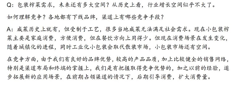 涪陵榨菜(002507):每股净资产 3.53元,每股净利润 0.84元,历史净利润年均增长 33.13%,预估未来三年净利润年均增长 9.28%,更多数据见:涪陵榨菜002507核心经营数据 涪陵榨菜的当前股价 27.96元,市盈率 36.47,未来三年的估值假设和预期收益率如下:15倍PE,预期收益率 -41.19%;20倍PE,预期收益率 -21.59%;25倍PE,预期收益率 -1.98%;30倍PE,预期收益率 17.62%。 投资记录10 涪陵榨菜 昨天以41元每股卖掉余下的3/1的三环集团,上次卖掉是28.9元,卖得早了点,在大大大老板来潮州之前的事了,也没想到,他来了之后,这票涨了这么多(真贵人也),我在2019年6月中旬以17.7元买入,之后到2020年8月第一次卖出。 没有只涨不跌的股票,也没有只跌不升的股票。 觉得涨多了就卖,没什么好留恋,如果是好公司,以后大把机会可以接回来。 同时也卖出了剩余的海康威视的1/2,这个金额太少了,没意义,下一次全部清仓掉。 榨菜写了一半,下半截考虑了好久,就不再摆数字了。我其实持仓在上涨到46元时候已经卖掉了24%,我的卖出动作已经替榨菜做了估值,我认为目前榨菜到了收割的时候,越涨越卖。如果到60元的话,我估计会选择再减仓甚至于清仓。后面再涨的话,就让别人去赚吧,我保守一点。实在没股票可买,就空仓买理财等下一个机会。 我认为,定增和成长空间的估计这两个因素对估值和持股起决定作用。如果你觉得榨菜的成长空间已达天花板,定增33亿对开拓市场和保持份额作用甚微,那么不再持有,就是你的选择了;或者你觉得榨菜其实也不像人们所说的那样不乐观,定增33亿会如管理层所讲的对榨菜生产稳定性及增收带来良性作用,那么你大可不必紧张,安心持有就是。让我们来看一些数据以及管理层自己如何说吧! 据涪陵榨菜2020年非公开发行A股股票预案中的数字:包装榨菜的销量由2013年的18.6万吨提升到2019年的27.84万吨,6年复合增长率达到6.95%;到2024年预计包装榨菜行业销量达到39.77万吨,未来5年复合增长率达到7.39%,据此推算,到2026年,包装榨菜行业销量有望达到46万吨。从预计的复合增长率来看,不管是7%还是8-9%,都觉得行业空间不大了。 上面截图来自2020年涪陵榨菜公司负责人与机构电话会议问答,涉及行业增长空间,作为企业内部方面,他们也坦言,要依靠优势,拓展新的应用场景,占领渠道,引导消费,扩大消费量。这个已经间接承认公司确实碰到行业空间这个瓶颈,并已提前采取措施积极减少带来的影响。重点还是看营销,看接下来的裂变和下沉进行得如何?得渠道者得天下。 至于定增这一块,首先一个,我对于实干的企业家永远持钦佩的态度,我自己做过实业,知道其中的艰辛,光受苦还不够,成功的企业家比普通人更优秀的品质是前瞻的眼光,以及永不言输的精神。 涪陵榨菜此次大手笔定增,必有其深层考虑的道理,首先应该值得肯定,是加分项目。 但是,作为投资者,看待企业的活动,宜从自己的角度出发,毕竟我们不是做企业的。企业做他们该做的,我们做我们应该做的事。 这个什么意思呢?企业做很多事,是从长期利益出发,短期间内可能无法产生收益,但这样做是对的;反映在财报数字上,定增可能会造成因为资产增加,营收短时间内跟不上,周转率下降,反映在股价上,可能是某个时间段长期不涨,或者甚至下跌。所以这个时候的投资可能会成为企业的陪跑者,这个就见仁见智了。企业是好企业,股票是好股票,但投资价值的大小就得好好计算一下了。 做为结尾,放一个疑问,为什么是我的朋友在吃涪陵榨菜?我自己为什么不吃? 其实不是我不吃,我也很喜欢吃饭配点下饭菜的。 我家里买菜的事情是领导在安排,我让她买点榨菜来吃过,买过一次。尝过之后,都觉得好吃,真心好吃。领导说,不能经常吃,为啥,怕防腐剂!此事就作罢了,榨菜没再上我家餐桌。然后,这几天,我在看这家公司,读到财报里面说,涪陵榨菜不加防腐剂,我如获至宝,跟领导抗议,领导慢悠悠地说,不加防腐剂?那它怎长那么俊俏啊?还这么脆!我不相信,你相信么? 看来,要上全民的餐桌,营销要更细致啊,而且还是可以争取的。毕竟还有很多象我这般的摇摆状态的消费者,任重道远啊! 本文发于同名公众号:半杯卡布 略有增删,欢迎交流 投资记录系列 $涪陵榨菜(SZ002507)$ $力合科技(SZ300800)$ $丸美股份(SH603983)$ 作者:半杯卡布原文链接:https://xueqiu.com/7803896818/170697780 转载请注明:www.51xianjinliu.com » 原来是我的朋友在吃涪陵榨菜下 喜欢 (0)or分享 (0)