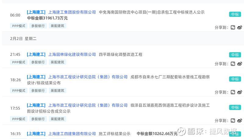 上海建工(600170):每股净资产 2.83元,每股净利润 0.29元,历史净利润年均增长 23.03%,预估未来三年净利润年均增长 16.21%,更多数据见:上海建工600170核心经营数据 上海建工的当前股价 3.23元,市盈率 7.79,未来三年的估值假设和预期收益率如下:15倍PE,预期收益率 111.36%;20倍PE,预期收益率 181.81%;25倍PE,预期收益率 252.26%;30倍PE,预期收益率 322.71%。 捷风数据2021-02-03根据公开信息搜集发现:【上海建工,600170】的上海建工集团股份有限公司《中免海南国际物流中心项目(一期)总承包工程中标候选人公示》,公示金额为31961.73万元,占上一年营业收入的0.16%。 以下是【上海建工,600170】信息摘要的截图: 数据来源:捷风数据_jiefengnews 接下来,我们小编整理了近期【上海建工,600170】的部分经营动态如下,各位大佬可以参考: 1、捷风数据于2021-02-03根据公开信息搜集发现:【上海建工,600170】的上海建工集团股份有限公司《中免海南国际物流中心项目(一期)总承包工程中标候选人公示》,公示金额为31961.73万元; 2、捷风数据于2021-02-02根据公开信息搜集发现:【上海建工,600170】的上海园林绿化建设有限公司《四平路绿化调整改造工程》; 3、捷风数据于2021-02-02根据公开信息搜集发现:【上海建工,600170】的上海市政工程设计研究总院(集团)有限公司《成都市自来水七厂三期配套输水管线工程勘察设计/标段结果公布》; 4、捷风数据于2021-02-02根据公开信息搜集发现:【上海建工,600170】的上海市政工程设计研究总院(集团)有限公司《临泽县五湖嘉苑西侧道路工程初步设计及施工图设计招标公告成交公示》; 5、捷风数据于2021-02-02根据公开信息搜集发现:【上海建工,600170】的上海建工四建集团有限公司《施工评标结果公示》,公示金额为10262.66万元; 6、捷风数据于2021-02-02根据公开信息搜集发现:【上海建工,600170】的上海市政工程设计研究总院(集团)有限公司《临港水厂配套道路工程中标候选人公示》,公示金额为102.23万元。 以下是【上海建工,600170】部分经营动态的截图: 数据来源:捷风数据_jiefengnews 了解更多【上海建工,600170】的信息,请关注我们捷风数据的动态。 作者:捷风数据_jiefengnews $上海建工(sh600170)$ 作者:捷风数据原文链接:https://xueqiu.com/2536037617/170791333 转载请注明:www.51xianjinliu.com » 上海建工中免海南国际物流中心项目(一期)总承包工程中标候选人公示 喜欢 (0)or分享 (0)