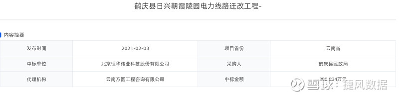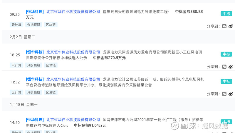 恒华科技(300365):每股净资产 3.2元,每股净利润 0.68元,历史净利润年均增长 45.86%,预估未来三年净利润年均增长 27.2%,更多数据见:恒华科技300365核心经营数据 恒华科技的当前股价 13.36元,市盈率 27.8,未来三年的估值假设和预期收益率如下:15倍PE,预期收益率 4.75%;20倍PE,预期收益率 39.67%;25倍PE,预期收益率 74.59%;30倍PE,预期收益率 109.5%。 捷风数据2021-02-03根据公开信息搜集发现:【恒华科技,300365】的北京恒华伟业科技股份有限公司《鹤庆县日兴朝霞陵园电力线路迁改工程-》,公示金额为380.83万元,占上一年营业收入的0.34%。 以下是【恒华科技,300365】信息摘要的截图: 数据来源:捷风数据_jiefengnews 接下来,我们小编整理了近期【恒华科技,300365】的部分经营动态如下,各位大佬可以参考: 1、捷风数据于2021-02-03根据公开信息搜集发现:【恒华科技,300365】的北京恒华伟业科技股份有限公司《鹤庆县日兴朝霞陵园电力线路迁改工程-》,公示金额为380.83万元; 2、捷风数据于2021-02-02根据公开信息搜集发现:【恒华科技,300365】的北京恒华伟业科技股份有限公司《龙源电力天津龙源风力发电有限公司滨海新区小王庄风电项目勘察设计公开招标中标候选人公示》,公示金额为270.5万元; 3、捷风数据于2021-02-02根据公开信息搜集发现:【恒华科技,300365】的北京恒华伟业科技股份有限公司《龙源电力设计公司江苏盱眙一期、盱眙河桥等6个风电场风机平台及检修道路地形测绘及风机平台排水、绿化规划服务询价采购结果公告》; 4、捷风数据于2021-01-18根据公开信息搜集发现:【恒华科技,300365】的北京恒华伟业科技股份有限公司《国网天津市电力公司2021年第一批业扩工程(服务)招标采购推荐的中标候选人公示》,公示金额为91.04万元; 5、捷风数据于2021-01-12根据公开信息搜集发现:【恒华科技,300365】的北京恒华伟业科技股份有限公司《天津市第三殡仪馆改扩建工程10KV电源线工程设计中标结果公示》,公示金额为6.85万元; 6、捷风数据于2021-01-12根据公开信息搜集发现:【恒华科技,300365】的北京恒华伟业科技股份有限公司《山西地方电力有限公司营销信息化系统接口项目招标中标候选人公示》。 以下是【恒华科技,300365】部分经营动态的截图: 数据来源:捷风数据_jiefengnews 了解更多【恒华科技,300365】的信息,请关注我们捷风数据的动态。 作者:捷风数据_jiefengnews $恒华科技(sz300365)$ 作者:捷风数据原文链接:https://xueqiu.com/2536037617/170834275 转载请注明:www.51xianjinliu.com » 恒华科技鹤庆县日兴朝霞陵园电力线路迁改工程- 喜欢 (1)or分享 (0)