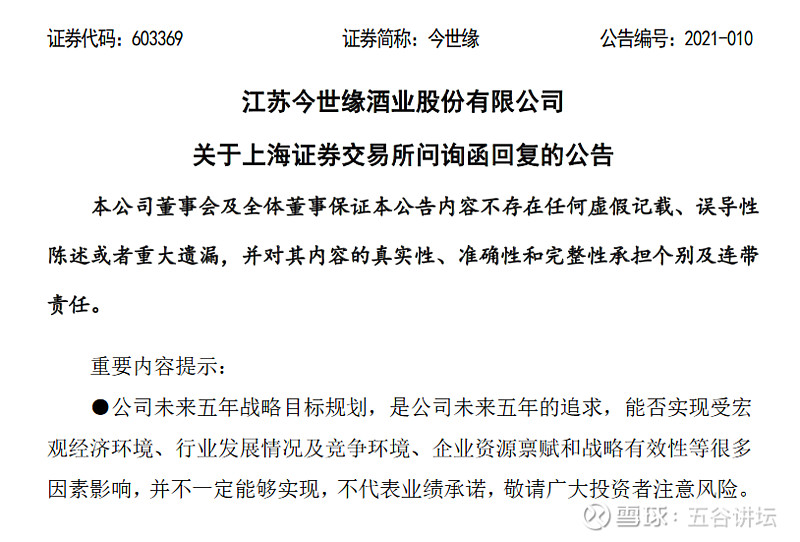今世缘(603369):每股净资产 5.56元,每股净利润 0.92元,历史净利润年均增长 11.62%,预估未来三年净利润年均增长 24.05%,更多数据见:今世缘603369核心经营数据 今世缘的当前股价 29.86元,市盈率 26.46,未来三年的估值假设和预期收益率如下:15倍PE,预期收益率 -12.04%;20倍PE,预期收益率 17.28%;25倍PE,预期收益率 46.61%;30倍PE,预期收益率 75.93%。 日前,今世缘发布了《关于上海证券交易所(下称“上交所”)问询函回复的公告》,针对未来五年战略目标规划等一系列问题进行了详细说明。 1月13日,今世缘方面表示,按照“市场引领工厂,工厂保障市场”的思路,统筹推进市场开拓和工厂建设工作,深化营销与管理变革,坚持和完善公司治理,做强做大市场,做实做优管理,做美做亮工厂,到2025年努力实现营收过百亿(争取150亿元)。 为了开好局、起好步,今世缘预计2021年营收目标59亿元左右,争取66亿元,还确立了由“白酒”+“缘文化”两大业务战略和八大关键战略举措。 同日,上交所紧急发布了《关于今世缘有关信息披露事项的问询函》,并指出,预计经营业绩将对今世缘未来经营产生重大影响,但今世缘在披露上述预测性信息时,未提供充分、客观的事实依据与预测基础。 然而,今世缘先后于1月20日晚间和1月27日晚间,发布了延期回复问询函的公告,直到2月1日晚间才“姗姗来迟”,将回复公告发了出来。 今世缘方面也坦言,战略目标只是公司的追求,并不一定能够实现,更不代表业绩承诺,敬请广大投资者注意投资风险。 确定百亿目标是为了鼓舞士气? 从白酒行业层面来看,伴随着消费升级,次高端及以上价格带产品增长明显,但最终将会回到“品牌+品质”这一白酒竞争的本质,名酒高端化势不可挡。 同时,未来白酒行业竞争激烈程度及竞争成本将进一步提升,企业呈现挤压式增长,企业追求高质量可持续增长将成为新常态。 数据显示,2015年到2019年白酒行业实际收入增长1.04%,复合增长率0.25%,而行业协会预测行业“十四五”营收增幅在6.3%左右。 行业集中度继续提升,产销量基本呈现缓慢下降趋势。但是,上市公司增速高于非上市公司,其中有品牌力、产品力、渠道力优势的企业将会获益。 以今世缘为例,2016年到2019年,销售增速分别约为20.9%、38.31%、42.7%和47.2%,平均增速在37.8%左右。 今世缘方面认为,公司自身次高端白酒占比60%以上,将享受次高端市场持续扩容的红利,而行业协会预测未来五年行业景气度回升,公司争取进一步提升行业竞争力。 但是,新冠疫情“外防输入、内防反弹”的压力仍然很大且可能会持续很长一段时间,行业面临消费场景和消费习惯改变的风险,今世缘面临省内市场竞争加剧和省外市场开拓难的问题。 “但考虑到目标既要切合实际又要起到鼓舞士气的作用,不宜比历史增速低很多,将一般目标确定在100亿元。”今世缘方面如上表示。 另外,在行业方面,预计景气度回升、次高端扩容、酱香崛起及同行业发展历程;而在企业方面,产品力、品牌力等方面具有优势提升,内部自报内生目标加20%的并购占比,今世缘从乐观的角度确定了未来五年营收150亿元的争取目标。 然而,白酒行业资深营销专家蔡学飞却告诉《五谷财经》,“喊出百亿目标的酒企,今世缘不是第一个,也不会是最后一个,很多酒企无论是在正式场合还是非正式场合喊出较为不切实际的目标,主要还是喊给资本市场、投资方看的。” 发力清雅酱香型白酒 众所周知,白酒行业拥有浓香型、清香型、酱香型、绵柔型、馥郁香型、芝麻香型等多种类型的白酒,但从目前来看,酱香型白酒可以说“红透半边天”,且仍将持续下去。 据权图酱酒工作室数据统计,2019年我国酱酒销量占白酒销量约8%,对比2001年的0.2%有显著提升;酱酒销售收入约1350亿元,约占白酒收入的20%。 目前,酱香型白酒在河南、北京、山东、上海、浙江、广西等公司省外重点目标市场消费趋势已经形成。 基于此,消费者、投资者、企业都对酱香型白酒“趋之若鹜”,在山东、安徽、江苏、福建等地,白酒企业也开始生产、推广酱香型白酒了,就连今世缘也不例外。 据悉,今世缘酿造的清雅酱香型白酒新产品(国缘V9),在2019年8月上市,单一产品2020年已实现销售1.28亿元。 随着消费方式、消费水平的持续升级,消费者不再将价格与品牌作为酒类购买的唯一指标,而是追逐更加理性和个性化的消费。 今世缘副董事长、副总经理吴建峰认为,消费者的多元化需求将催生更多不同风格流派、各具特色的酱香型白酒。 在今世缘的主导之下,2月17日,中国酒业协会团体标准审查委员会正式批准发布了《清雅酱香型白酒》团体标准(T/CBJ2107-2020),规定了清雅酱香型白酒的术语和定义、产品分类、技术要求、生产加工过程的卫生要求、检验方法、检验规则等。该标准已于2020年4月1日起实施。 作为一种新流派酱香型白酒,清雅酱香型白酒是今世缘参与白酒业“头部竞争”的战略产品,也会为引领和加大清雅酱香型白酒在行业的推广与应用提供了标准支撑。 “今世缘将进一步扩大清雅酱香酒的酿造规模,打造出品质更好、更稳定的产品,与传统酱香型白酒共同推动中国白酒业的高质量发展。”对于未来的发展,吴建峰充满信心。 作者:五谷讲坛原文链接:https://xueqiu.com/5319637674/170936097 转载请注明:www.51xianjinliu.com » 今世缘未来五年争取150亿收入称不一定能实现发力清雅酱酒 