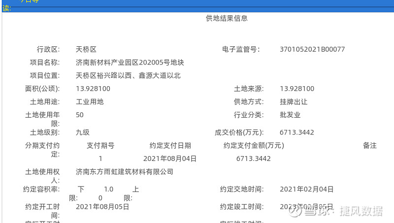 东方雨虹(002271):每股净资产 5.89元,每股净利润 1.01元,历史净利润年均增长 41.97%,预估未来三年净利润年均增长 29.83%,更多数据见:东方雨虹002271核心经营数据 东方雨虹的当前股价 30.42元,市盈率 23.13,未来三年的估值假设和预期收益率如下:15倍PE,预期收益率 8.99%;20倍PE,预期收益率 45.32%;25倍PE,预期收益率 81.65%;30倍PE,预期收益率 117.98%。 捷风数据:【东方雨虹,002271】济南东方雨虹建筑材料有限公司在山东省济南市天桥区拿了面积为139281平方米成交金额为6713.34万元土地类型为工业用地的地块。 以下是【东方雨虹,002271】拿地信息摘要的截图: 数据来源:捷风数据_jiefengnews 接下来,我们小编整理了近期【东方雨虹,002271】的部分经营动态如下,各位大佬可以参考: 1、捷风数据:【东方雨虹,002271】济南东方雨虹建筑材料有限公司在山东省济南市天桥区拿了面积为139281平方米成交金额为6713.34万元土地类型为工业用地的地块; 2、捷风数据于2021-02-04根据公开信息搜集发现:【东方雨虹,002271】的深圳东方雨虹防水工程有限公司《前海交易广场南区施工总承包Ⅱ标项目防水专业分包工程中标公示》; 3、捷风数据:【东方雨虹,002271】岳阳东方雨虹防水技术有限责任公司的岳阳东方雨虹防水技术有限责任公司沥青卷材车间沥青烟气处理装置升级改造项目,项目位于【湖南省】; 4、捷风数据:【东方雨虹,002271】济南东方雨虹建筑材料有限公司的济南东方雨虹建筑材料有限公司东方雨虹绿色建材生产基地,进行发改委投资项目审批,项目位于【山东省】,状态为【通过】; 5、捷风数据:【东方雨虹,002271】济南东方雨虹建筑材料有限公司的济南东方雨虹建筑材料有限公司东方雨虹绿色建材生产基地,进行发改委投资项目备案,项目位于【山东省】,状态为【通过】; 6、捷风数据于2021-01-28根据公开信息搜集发现:【东方雨虹,002271】的北京东方雨虹防水技术股份有限公司《新建宣城至绩溪高速铁路第二批次甲供物资桥梁支座、隧道防水材料和桥梁防水材料中标结果公告FSCL01》。 以下是【东方雨虹,002271】部分经营动态的截图: 数据来源:捷风数据_jiefengnews 了解更多【东方雨虹,002271】的信息,请关注我们捷风数据的动态。 作者:捷风数据_jiefengnews $东方雨虹(sz002271)$ 作者:捷风数据原文链接:https://xueqiu.com/2536037617/171086873 转载请注明:www.51xianjinliu.com » 东方雨虹在山东省济南市天桥区拿了139281平方米土地工业用地 喜欢 (0)or分享 (0)