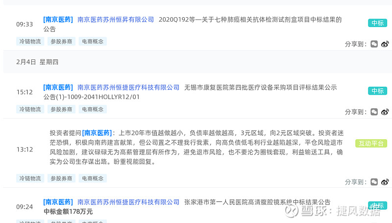 恒瑞医药(600276):每股净资产 5.23元,每股净利润 1.1元,历史净利润年均增长 30.79%,预估未来三年净利润年均增长 28.72%,更多数据见:恒瑞医药600276核心经营数据 恒瑞医药的当前股价 80.59元,市盈率 72.91,未来三年的估值假设和预期收益率如下:15倍PE,预期收益率 -63.61%;20倍PE,预期收益率 -51.48%;25倍PE,预期收益率 -39.35%;30倍PE,预期收益率 -27.22%。 南京医药(600713):每股净资产 3.73元,每股净利润 0.26元,历史净利润年均增长 24.89%,预估未来三年净利润年均增长 0.0%,更多数据见:南京医药600713核心经营数据 南京医药的当前股价 4.38元,市盈率 12.68,未来三年的估值假设和预期收益率如下:15倍PE,预期收益率 -10.96%;20倍PE,预期收益率 18.72%;25倍PE,预期收益率 48.4%;30倍PE,预期收益率 78.08%。 捷风数据2021-02-05根据公开信息搜集发现:【南京医药,600713】的南京医药苏州恒昇有限公司《2020Q192等—关于七种肺癌相关抗体检测试剂盒项目中标结果的公告》。 以下是【南京医药,600713】信息摘要的截图: 数据来源:捷风数据_jiefengnews 接下来,我们小编整理了近期【南京医药,600713】的部分经营动态如下,各位大佬可以参考: 1、捷风数据于2021-02-05根据公开信息搜集发现:【南京医药,600713】的南京医药苏州恒昇有限公司《2020Q192等—关于七种肺癌相关抗体检测试剂盒项目中标结果的公告》; 2、捷风数据于2021-02-04根据公开信息搜集发现:【南京医药,600713】的南京医药苏州恒捷医疗科技有限公司《无锡市康复医院第四批医疗设备采购项目评标结果公示公告(1)-1009-2041HOLLYR12/01》; 3、捷风数据于2021-02-04根据公开信息搜集发现:【南京医药,600713】的南京医药苏州恒捷医疗科技有限公司《张家港市第一人民医院高清腹腔镜系统中标结果公告》,公示金额为178.0万元; 4、捷风数据于2021-02-02根据公开信息搜集发现:【南京医药,600713】的安徽天星医药集团有限公司《安徽中医药大学第一附属医院部分调价药品采购(第三批)采购结果公示》; 5、捷风数据于2021-02-02根据公开信息搜集发现:【南京医药,600713】的江苏盐淮百信连锁药业有限公司《江苏省盐城市盐都区公路管理站经营性用房租赁项目中标候选人结果公示》,公示金额为14.5万元; 6、捷风数据于2021-02-01根据公开信息搜集发现:【南京医药,600713】的江苏华晓医药物流有限公司《关于药品采购询价结果公告》,公示金额为5.88万元。 以下是【南京医药,600713】部分经营动态的截图: 数据来源:捷风数据_jiefengnews 了解更多【南京医药,600713】的信息,请关注我们捷风数据的动态。 作者:捷风数据_jiefengnews $南京医药(sh600713)$ 作者:捷风数据原文链接:https://xueqiu.com/2536037617/171099823 转载请注明:www.51xianjinliu.com » 南京医药2020Q192等—关于七种肺癌相关抗体检测试剂盒项目中标结果的公告 喜欢 (0)or分享 (0)