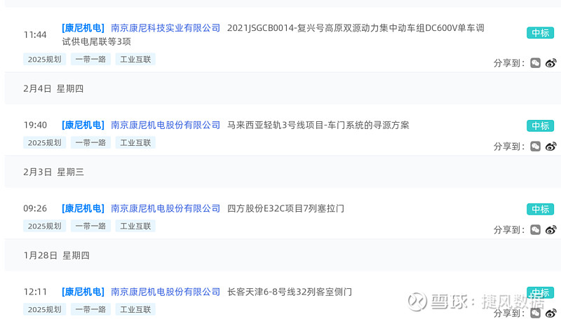 康尼机电(603111):每股净资产 1.93元,每股净利润 -3.22元,历史净利润年均增长 0.0%,预估未来三年净利润年均增长 0.0%,更多数据见:康尼机电603111核心经营数据 康尼机电的当前股价 6.14元,市盈率 -2.54,未来三年的估值假设和预期收益率如下:15倍PE,预期收益率 -886.64%;20倍PE,预期收益率 -1148.86%;25倍PE,预期收益率 -1411.07%;30倍PE,预期收益率 -1673.29%。 捷风数据2021-02-05根据公开信息搜集发现:【康尼机电,603111】的南京康尼科技实业有限公司《2021JSGCB0014-复兴号高原双源动力集中动车组DC600V单车调试供电尾联等3项》。 以下是【康尼机电,603111】信息摘要的截图: 数据来源:捷风数据_jiefengnews 接下来,我们小编整理了近期【康尼机电,603111】的部分经营动态如下,各位大佬可以参考: 1、捷风数据于2021-02-05根据公开信息搜集发现:【康尼机电,603111】的南京康尼科技实业有限公司《2021JSGCB0014-复兴号高原双源动力集中动车组DC600V单车调试供电尾联等3项》; 2、捷风数据于2021-02-04根据公开信息搜集发现:【康尼机电,603111】的南京康尼机电股份有限公司《马来西亚轻轨3号线项目-车门系统的寻源方案》; 3、捷风数据于2021-02-03根据公开信息搜集发现:【康尼机电,603111】的南京康尼机电股份有限公司《四方股份E32C项目7列塞拉门》; 4、捷风数据于2021-01-28根据公开信息搜集发现:【康尼机电,603111】的南京康尼机电股份有限公司《长客天津6-8号线32列客室侧门》; 5、捷风数据于2021-01-25根据公开信息搜集发现:【康尼机电,603111】的南京康尼科技实业有限公司《电力连接器》; 6、捷风数据于2021-01-18根据公开信息搜集发现:【康尼机电,603111】的南京康尼机电股份有限公司《长客重庆江跳线15列车门系统》。 以下是【康尼机电,603111】部分经营动态的截图: 数据来源:捷风数据_jiefengnews 了解更多【康尼机电,603111】的信息,请关注我们捷风数据的动态。 作者:捷风数据_jiefengnews $康尼机电(sh603111)$ 作者:捷风数据原文链接:https://xueqiu.com/2536037617/171122860 转载请注明:www.51xianjinliu.com » 康尼机电2021JSGCB0014-复兴号高原双源动力集中动车组DC600V单车调试供电尾联等3 喜欢 (0)or分享 (0)