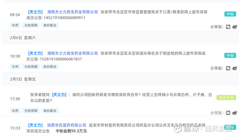 天士力(600535):每股净资产 7.35元,每股净利润 1.02元,历史净利润年均增长 18.9%,预估未来三年净利润年均增长 2.04%,更多数据见:天士力600535核心经营数据 天士力的当前股价 13.96元,市盈率 16.14,未来三年的估值假设和预期收益率如下:15倍PE,预期收益率 16.44%;20倍PE,预期收益率 55.26%;25倍PE,预期收益率 94.07%;30倍PE,预期收益率 132.89%。 捷风数据2021-02-07根据公开信息搜集发现:【天士力,600535】的湖南天士力民生药业有限公司《张家界市永定区市场监督管理局关于口罩/眼罩的网上超市采购成交公告-1452191000006089911》。 以下是【天士力,600535】信息摘要的截图: 数据来源:捷风数据_jiefengnews 接下来,我们小编整理了近期【天士力,600535】的部分经营动态如下,各位大佬可以参考: 1、捷风数据于2021-02-07根据公开信息搜集发现:【天士力,600535】的湖南天士力民生药业有限公司《张家界市永定区市场监督管理局关于口罩/眼罩的网上超市采购成交公告-1452191000006089911》; 2、捷风数据于2021-02-06根据公开信息搜集发现:【天士力,600535】的湖南天士力民生药业有限公司《张家界市永定区永定街道办事处关于额温枪的网上超市采购成交公告-1528191000006081857》; 3、捷风数据于2021-02-05根据公开信息搜集发现:【天士力,600535】的陕西华氏医药有限公司《延安市药材医药有限责任公司药品分公司公共卫生应急物资药品采购项目成交公告》,公示金额为59.3万元; 4、捷风数据于2021-02-05根据公开信息搜集发现:【天士力,600535】的湖南天士力民生药业有限公司《张家界市永定区西溪坪街道办事处关于额温枪的网上超市采购成交公告-1556191000006073587》; 5、捷风数据于2021-02-04根据公开信息搜集发现:【天士力,600535】的湖南天士力民生药业有限公司《张家界市永定区市场监督管理局关于额温枪的网上超市采购成交公告-1452191000006072652》; 6、捷风数据于2021-02-04根据公开信息搜集发现:【天士力,600535】的湖南天士力民生药业有限公司《张家界市永定区社会福利有奖募捐中心关于口罩/眼罩的网上超市采购成交公告-1609191000006066809》。 以下是【天士力,600535】部分经营动态的截图: 数据来源:捷风数据_jiefengnews 了解更多【天士力,600535】的信息,请关注我们捷风数据的动态。 作者:捷风数据_jiefengnews $天士力(sh600535)$ 作者:捷风数据原文链接:https://xueqiu.com/2536037617/171241786 转载请注明:www.51xianjinliu.com » 天士力张家界市永定区市场监督管理局关于口罩/眼罩的网上超市采购成交公告-145219100000 喜欢 (0)or分享 (0)