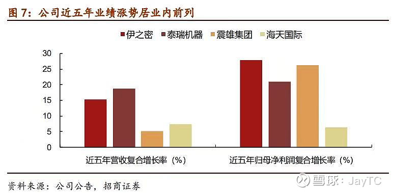 伊之密(300415):每股净资产 2.92元,每股净利润 0.41元,历史净利润年均增长 15.47%,预估未来三年净利润年均增长 23.63%,更多数据见:伊之密300415核心经营数据 伊之密的当前股价 7.65元,市盈率 17.04,未来三年的估值假设和预期收益率如下:15倍PE,预期收益率 51.91%;20倍PE,预期收益率 102.55%;25倍PE,预期收益率 153.18%;30倍PE,预期收益率 203.82%。 JayTC(2021.02.09) 顺周期下业绩加速释放的高端制造小龙头,50亿规模产能已投产正在爬坡,市占率稳步提升 伊之密精要: ①公司为注塑机行业领军公司之一,目前收入位居行业第三,净利润第二,过去5年成长性最佳;②公司与行业龙头海天国际差异化竞争,硬件方面密在高端两板机和全电机方面努力提高技术含金量,市场占有率不断提升;③公司目前已预告全年营收预计增长30%,归母净利润预计增长58%-66%,招商证券刘荣认为放眼中期、长期的未来格局,伊之密受益于相对宽松的货币环境和制造业补库存周期,有望迎来的景气上行和市占率提升的机遇;④风险提示:制造业投资增速下行、竞争加剧。目前市场对于高端制造领域的关注度持续提升,招商证券近日覆盖了一家估值较低、但顺周期成长性确定性很强的制造业细分小龙头伊之密。 公司在高端注塑机(包括高端两板机和全电机)方面提高技术含量,扩大自身核心竞争力,作为高杠杆率与高资产周转率的标的,公司在经济复苏的大背景下具有更强的进攻性配置,2021年净利润增速有望达到28%、22%,目前对应动态估值20倍,招商给予25倍估值,目标市值100亿(目前78亿)。顺周期下将释放业绩弹性的高端制造小龙头 伊之密的核心业务包括注塑机、压铸机、橡胶注射成型机、高速包装系统、机器人自动化集成系统等,其中注塑机业务超过60%。 注塑机行业老牌龙头为海天国际,市占率也常年稳居业内第一的水平。伊之密2012年开始市占率稳步上升,目前收入位居行业第三,净利润第二。从行业来看,在海外居家需求的惯性推动和线上消费渗透率提升的背景下,2021年家电行业有望继续保持高景气并充分反馈于上游注塑机领域。 从伊之密自身来看,公司与行业龙头差异化竞争,硬件方面密在高端两板机和全电机方面努力提高技术含金量,小型注塑机已形成优势。 渠道方面,公司构建了适合自身发展的直销模式+IPD研发模式+精益化流水线的品牌网络,强化自身软功实力。 产品方面,公司顺德第三工厂在2020年10月集中投产,预计将在4年内建成并实现超过50亿元的产能规模。 根据公司业绩预告,公司全年营收预计增长30%,归母净利润预计增长58%-66%,除了今年克服疫情影响的高增长之外,公司近5年的业绩成长性为同行业最高: 小型机的规模化生产和较短的排产周期让公司在2020年表现不俗。放眼中期、长期的未来格局,伊之密受益于相对宽松的货币环境和制造业补库存周期,有望迎来的景气上行和市占率提升的机遇。 招商证券预计2021/2022公司净利润增速将达到28%/20%,给予2021年目标市值99亿元。 $伊之密(SZ300415)$ 作者:JayTC原文链接:https://xueqiu.com/4213769615/171430513 转载请注明:www.51xianjinliu.com » 研选 — 伊之密 喜欢 (0)or分享 (0)