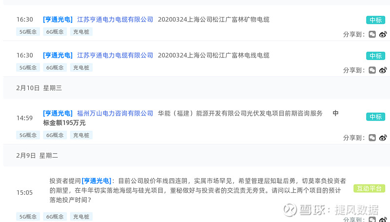 亨通光电(600487):每股净资产 6.88元,每股净利润 1.33元,历史净利润年均增长 38.98%,预估未来三年净利润年均增长 -2.27%,更多数据见:亨通光电600487核心经营数据 亨通光电的当前股价 19.6元,市盈率 23.73,未来三年的估值假设和预期收益率如下:15倍PE,预期收益率 -4.99%;20倍PE,预期收益率 26.68%;25倍PE,预期收益率 58.35%;30倍PE,预期收益率 90.02%。 捷风数据2021-02-15根据公开信息搜集发现:【亨通光电,600487】的江苏亨通电力电缆有限公司《20200324上海公司松江广富林电线电缆》。 以下是【亨通光电,600487】信息摘要的截图: 数据来源:捷风数据_jiefengnews 接下来,我们小编整理了近期【亨通光电,600487】的部分经营动态如下,各位大佬可以参考: 1、捷风数据于2021-02-15根据公开信息搜集发现:【亨通光电,600487】的江苏亨通电力电缆有限公司《20200324上海公司松江广富林矿物电缆》; 2、捷风数据于2021-02-15根据公开信息搜集发现:【亨通光电,600487】的江苏亨通电力电缆有限公司《20200324上海公司松江广富林电线电缆》; 3、捷风数据于2021-02-10根据公开信息搜集发现:【亨通光电,600487】的福州万山电力咨询有限公司《华能(福建)能源开发有限公司光伏发电项目前期咨询服务》,公示金额为195.0万元; 4、捷风数据于2021-02-09根据公开信息搜集发现:【亨通光电,600487】的江苏亨通电力电缆有限公司《中国移动上海公司2020年上海移动矿物绝缘电缆框架采购项目_中标结果公示》; 5、捷风数据于2021-02-08根据公开信息搜集发现:【亨通光电,600487】的江苏亨通线缆科技有限公司《龙马河大桥改建工程(2020年电务系统第64批)采购项目报价邀请书成交候选人公示》,公示金额为15.42万元; 6、捷风数据于2021-02-08根据公开信息搜集发现:【亨通光电,600487】的江苏亨通线缆科技有限公司《2020年运营维修电务系统信号点灯单元、制动钳等电务配件采购计划(第4批)(2020年电务运维第4批)(招标编号:物资计划[2020]722)》。 以下是【亨通光电,600487】部分经营动态的截图: 数据来源:捷风数据_jiefengnews 了解更多【亨通光电,600487】的信息,请关注我们捷风数据的动态。 作者:捷风数据_jiefengnews $亨通光电(sh600487)$ 作者:捷风数据原文链接:https://xueqiu.com/2536037617/171829410 转载请注明:www.51xianjinliu.com » 亨通光电20200324上海公司松江广富林电线电缆 喜欢 (0)or分享 (0)
